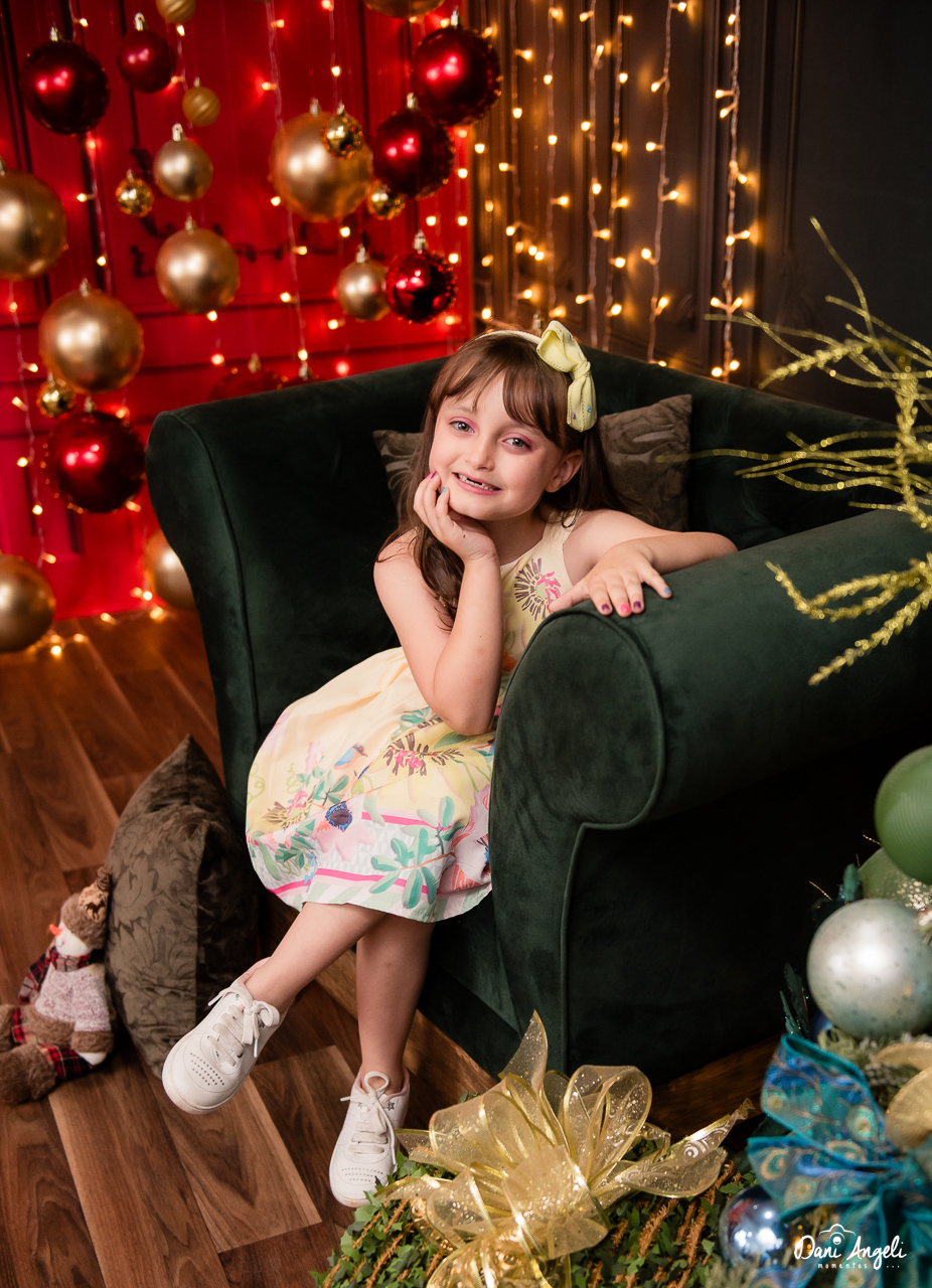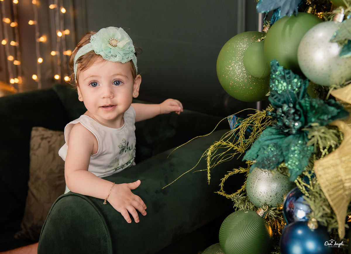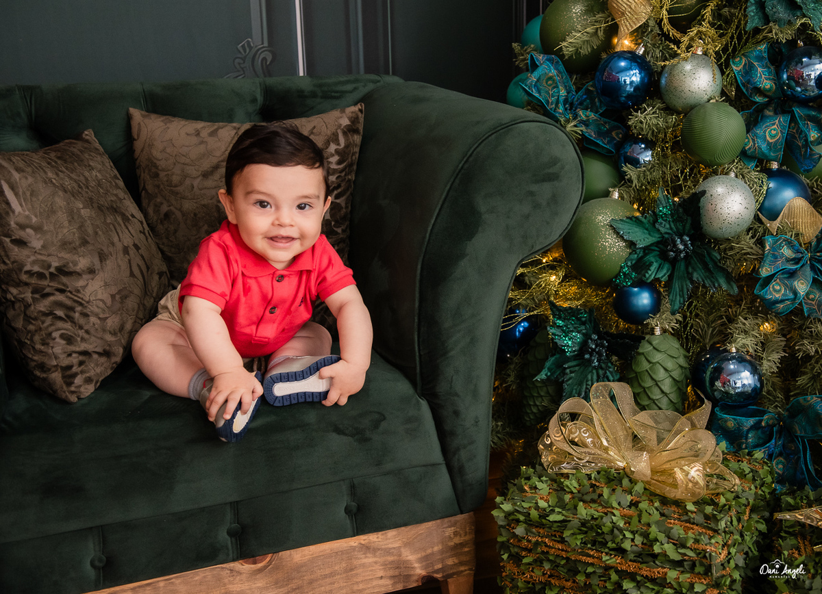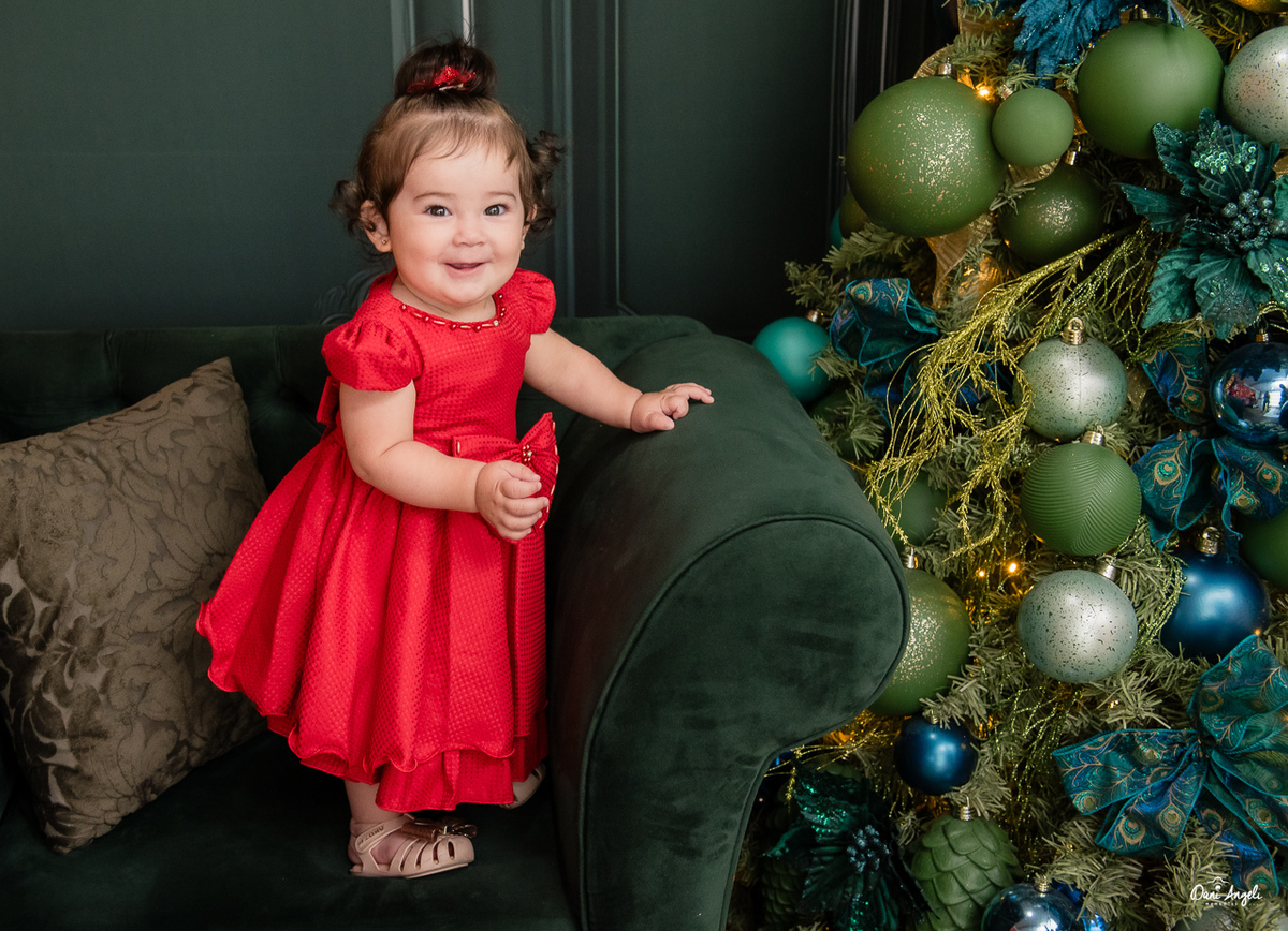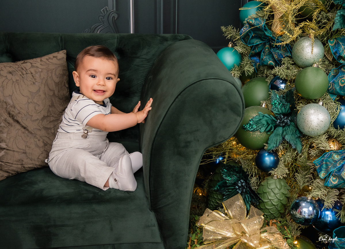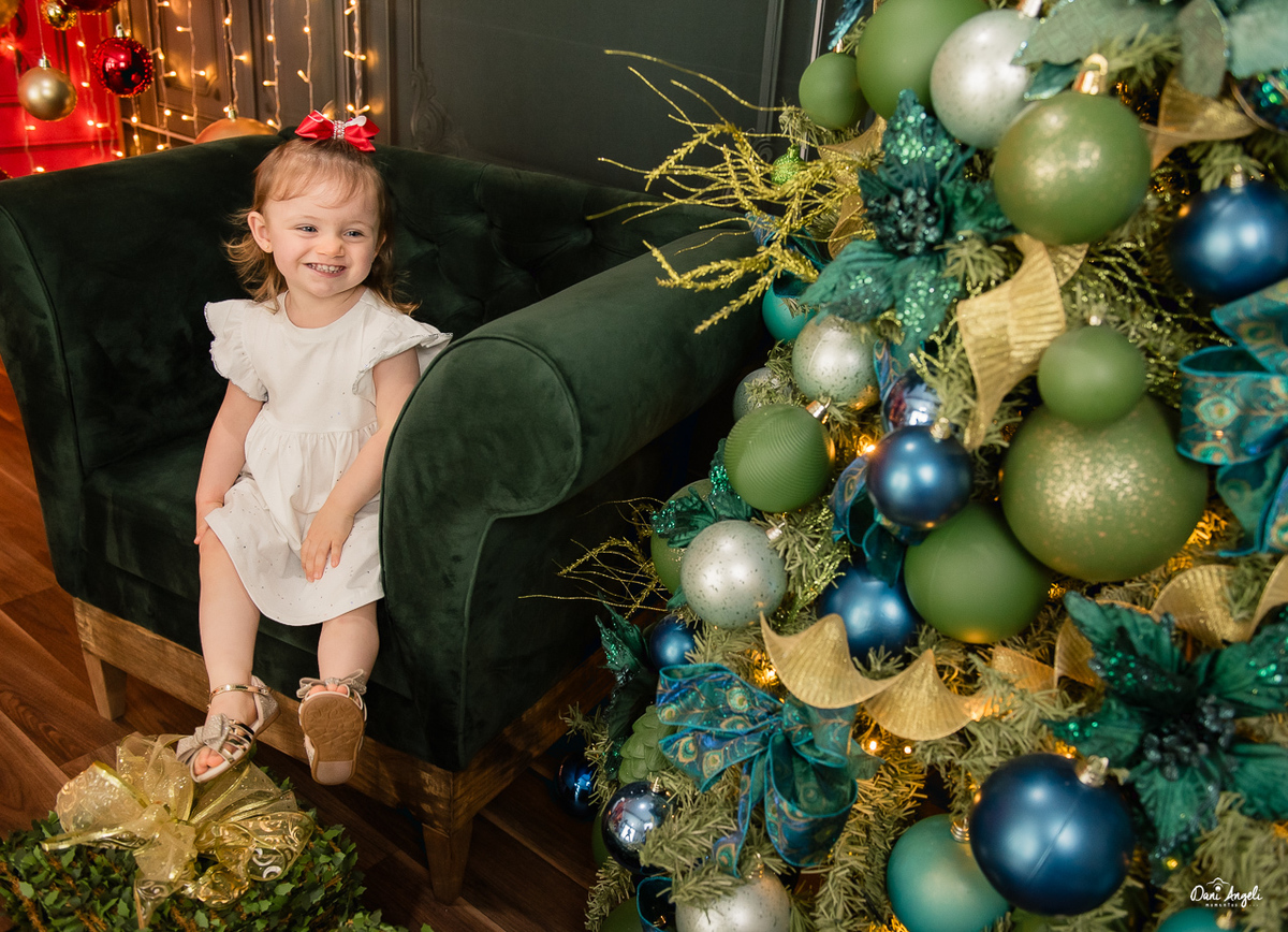 Nós preparamos tudo com muito carinho e cuidado, pensando em cada detalhe para que as suas fotos ficassem perfeitas. O cenário tem uma árvore de Natal iluminada, uma poltrona verde. Tudo para criar um clima natalino e mágico.