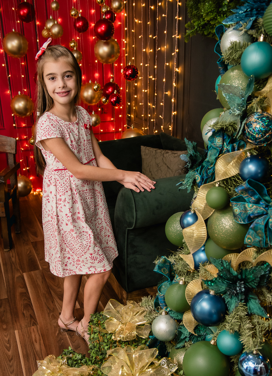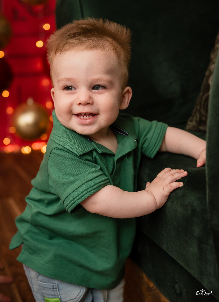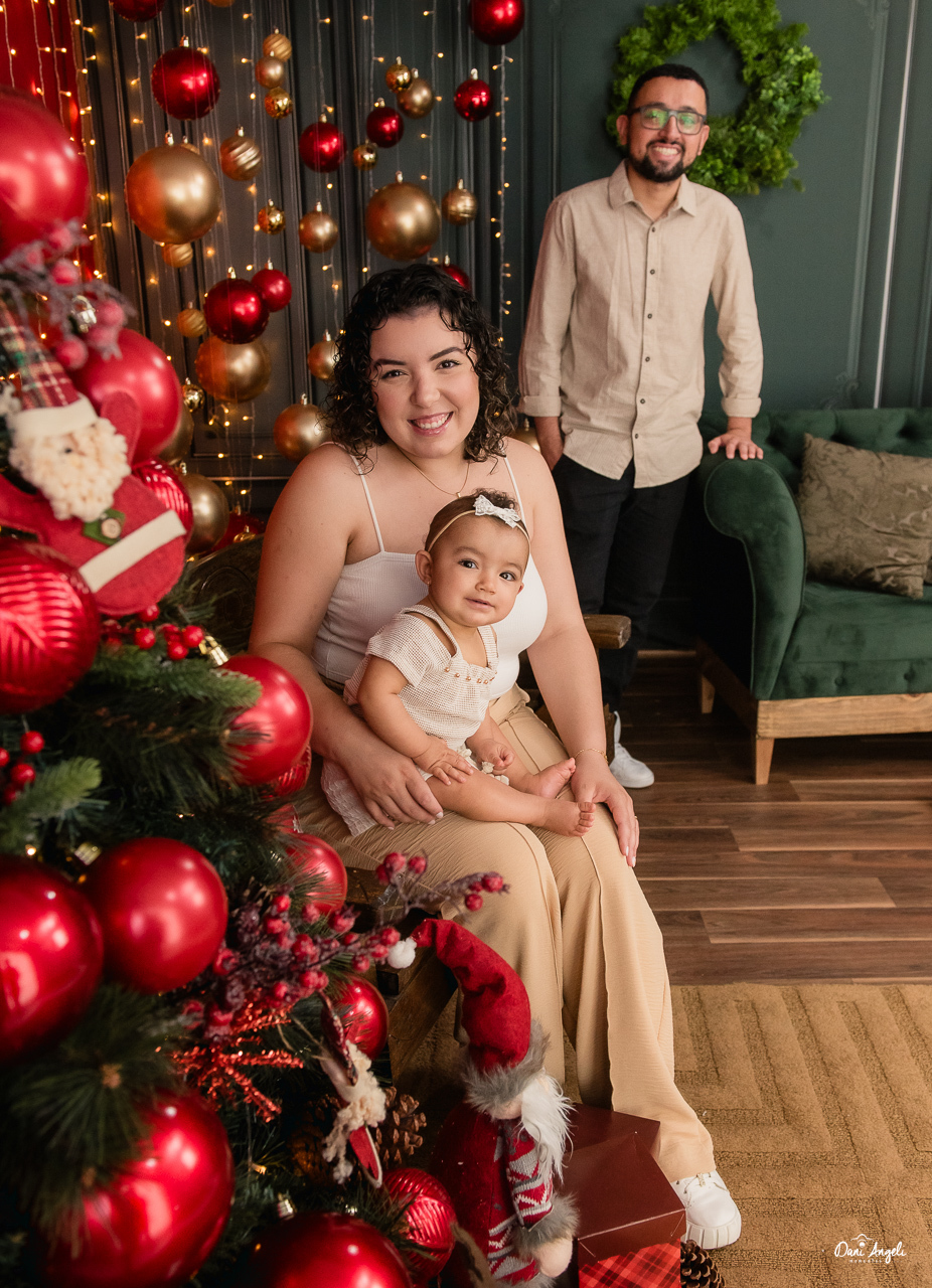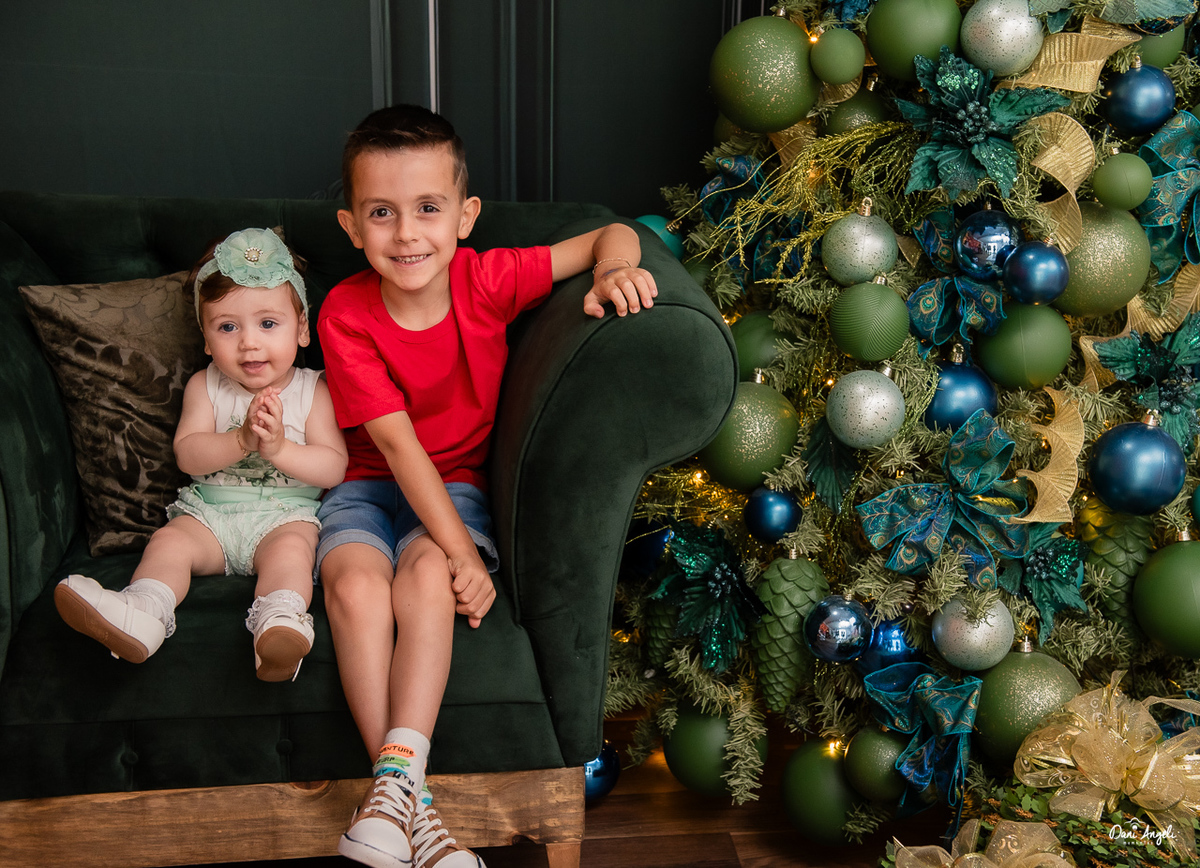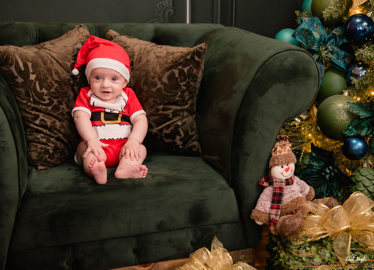 Nós preparamos tudo com muito carinho e cuidado, pensando em cada detalhe para que as suas fotos ficassem perfeitas. O cenário tem uma árvore de Natal iluminada, uma poltrona verde. Tudo para criar um clima natalino e mágico.