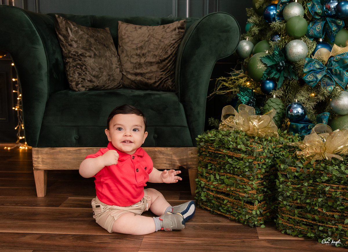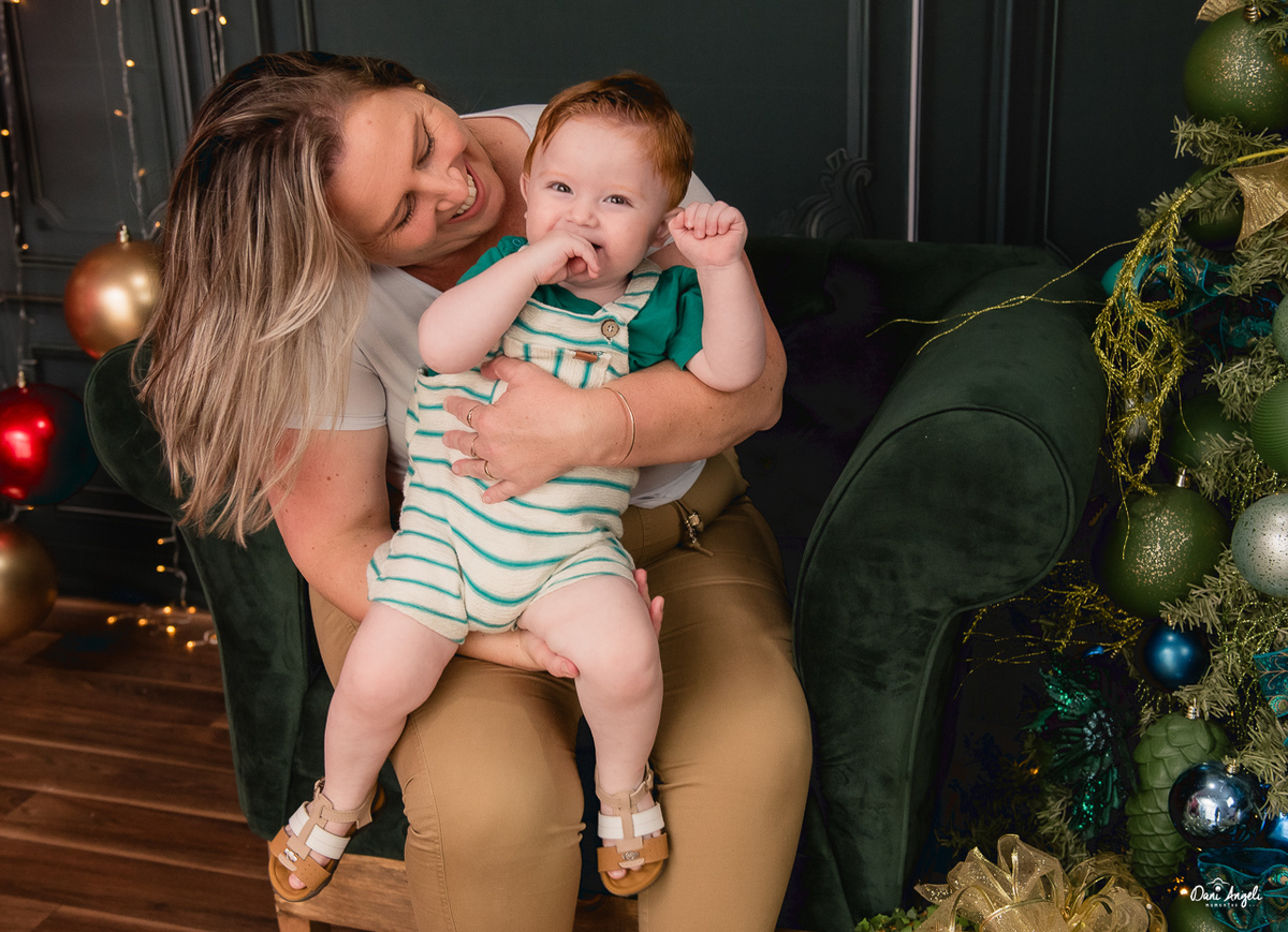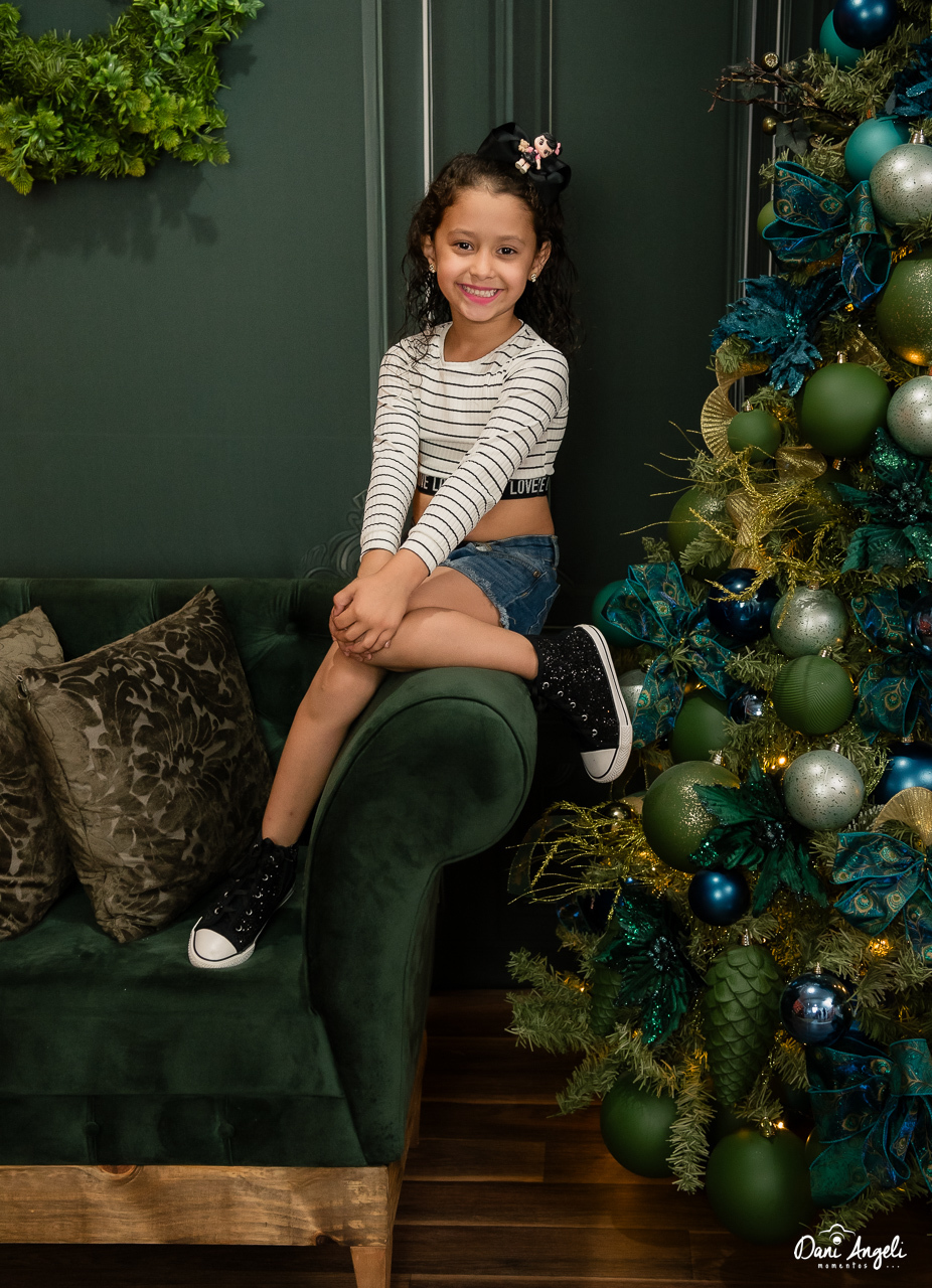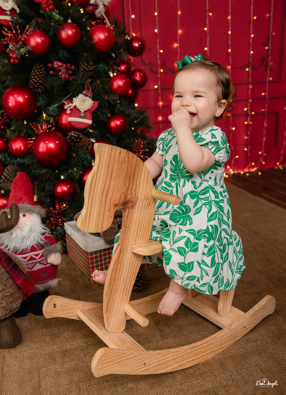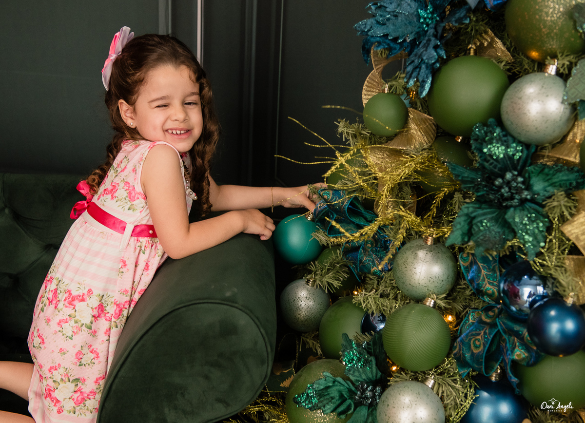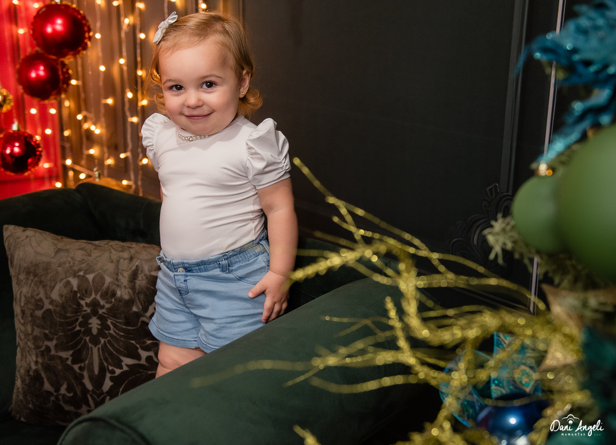 Nós preparamos tudo com muito carinho e cuidado, pensando em cada detalhe para que as suas fotos ficassem perfeitas. O cenário tem uma árvore de Natal iluminada, uma poltrona verde. Tudo para criar um clima natalino e mágico.