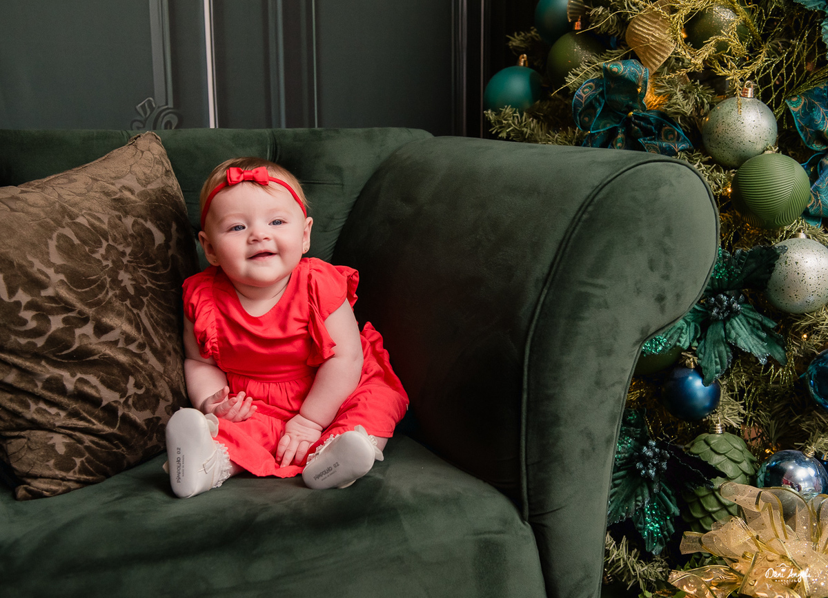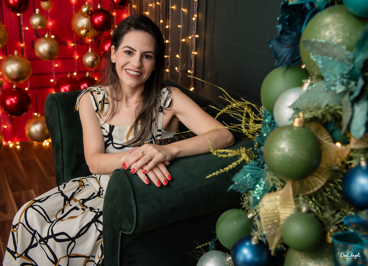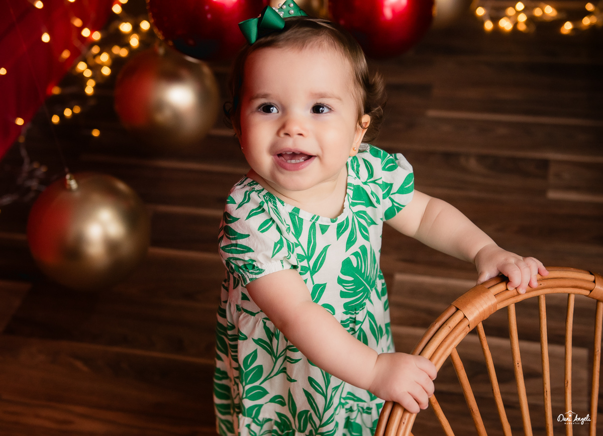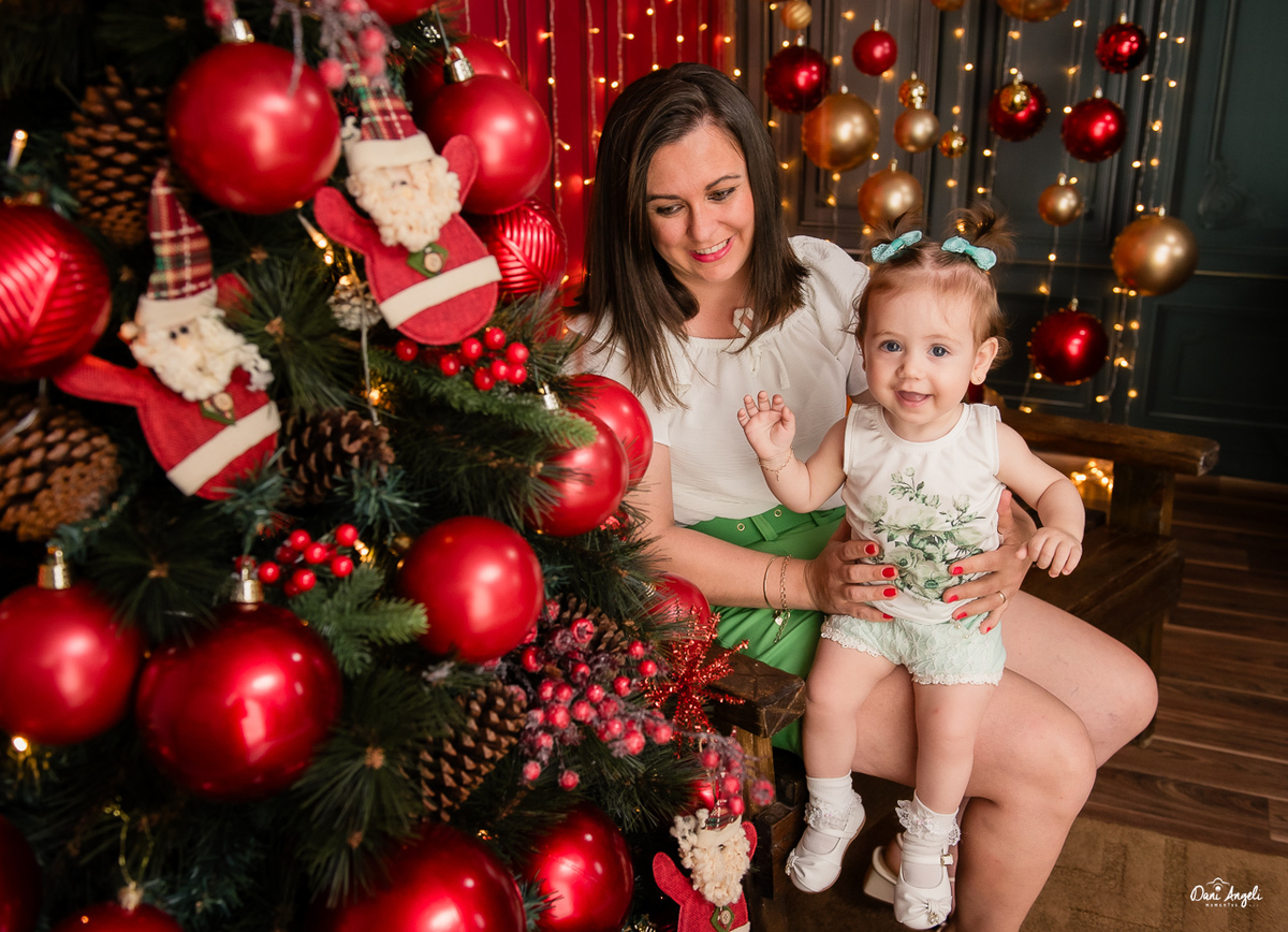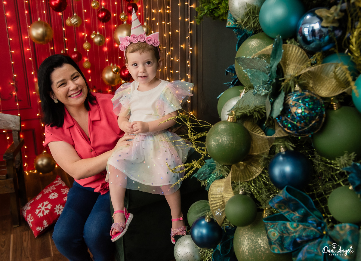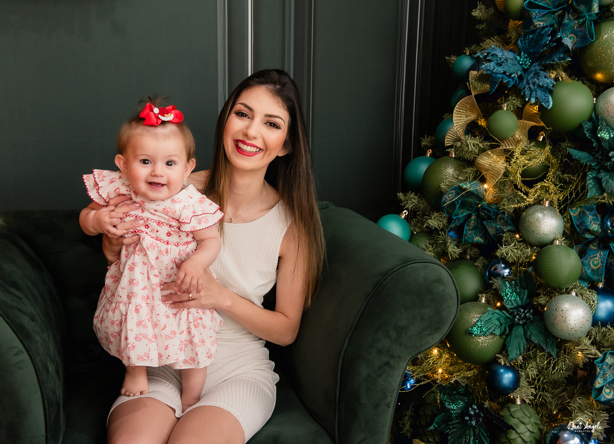 Nós preparamos tudo com muito carinho e cuidado, pensando em cada detalhe para que as suas fotos ficassem perfeitas. O cenário tem uma árvore de Natal iluminada, uma poltrona verde. Tudo para criar um clima natalino e mágico.