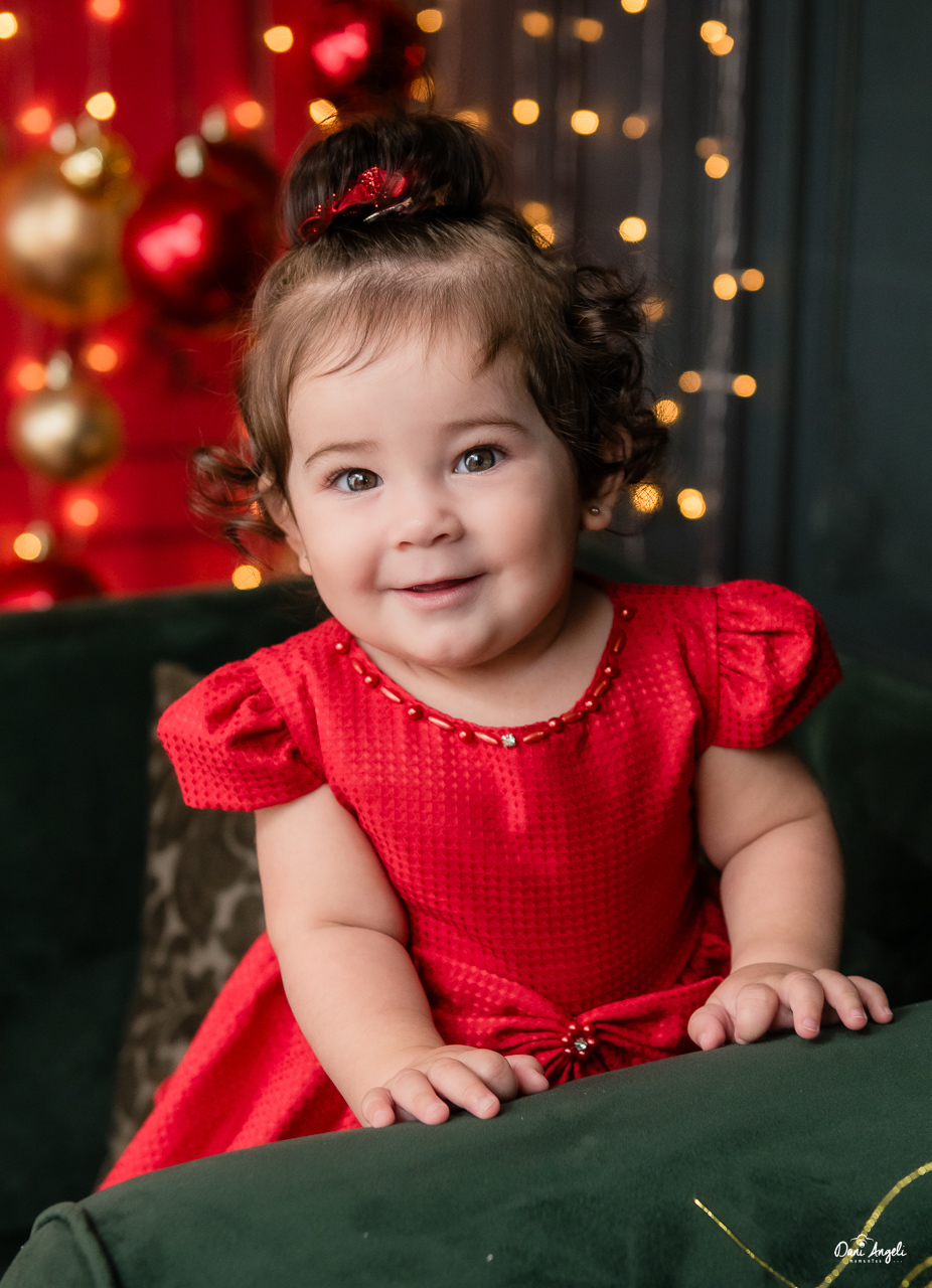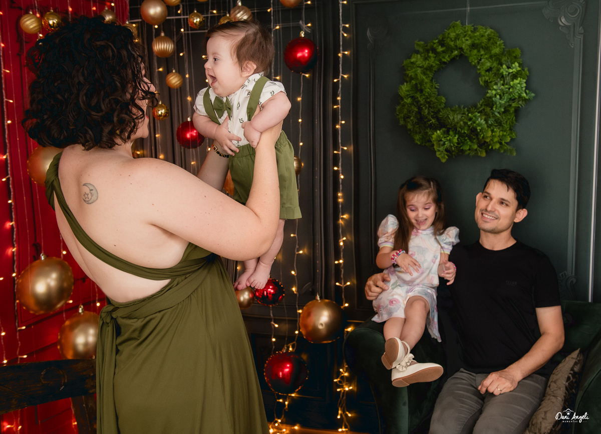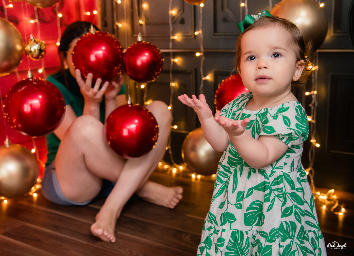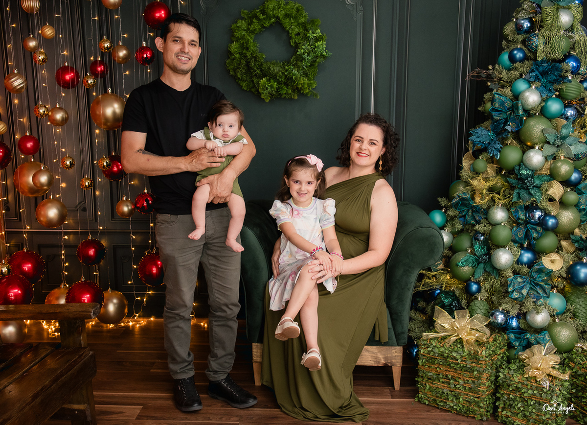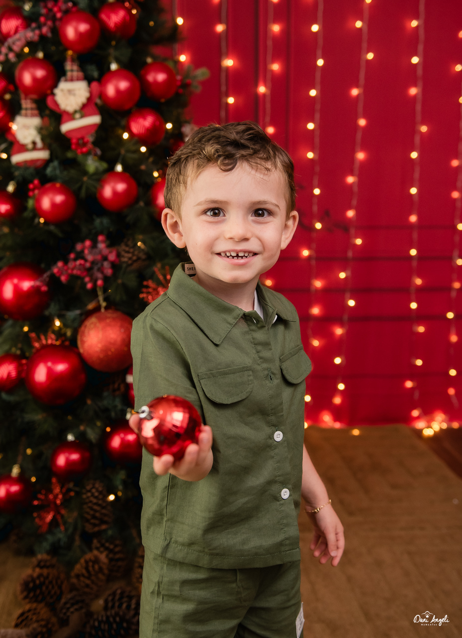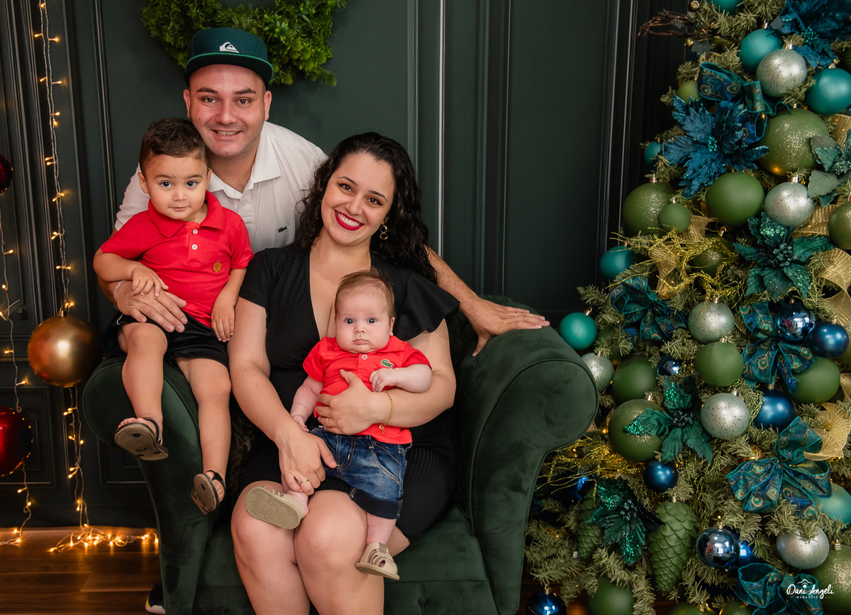 Nós preparamos tudo com muito carinho e cuidado, pensando em cada detalhe para que as suas fotos ficassem perfeitas. O cenário tem uma árvore de Natal iluminada, uma poltrona verde. Tudo para criar um clima natalino e mágico.