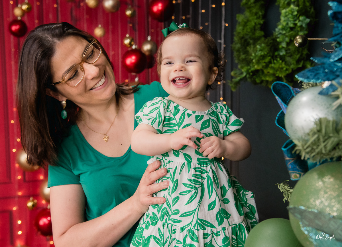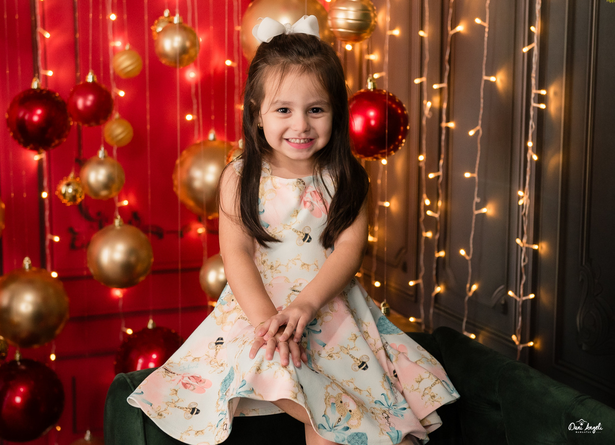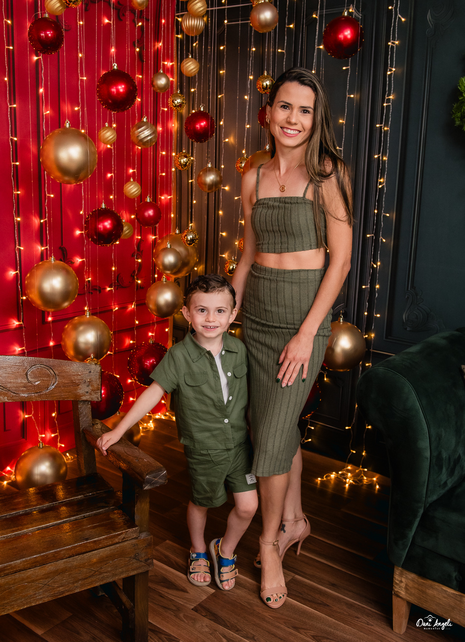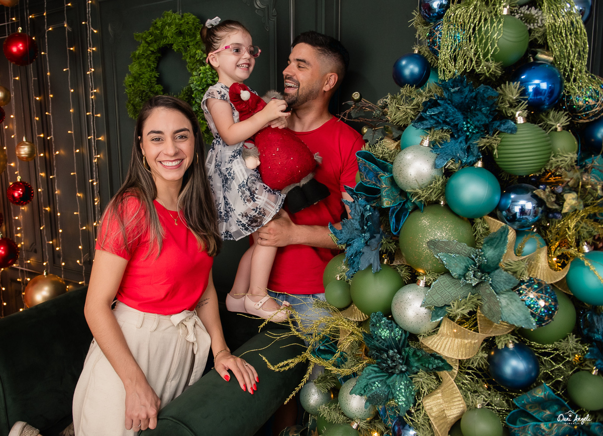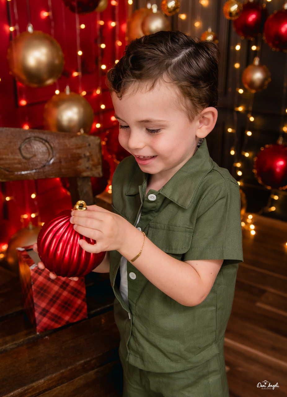 Nós preparamos tudo com muito carinho e cuidado, pensando em cada detalhe para que as suas fotos ficassem perfeitas. O cenário tem uma árvore de Natal iluminada, uma poltrona verde. Tudo para criar um clima natalino e mágico.