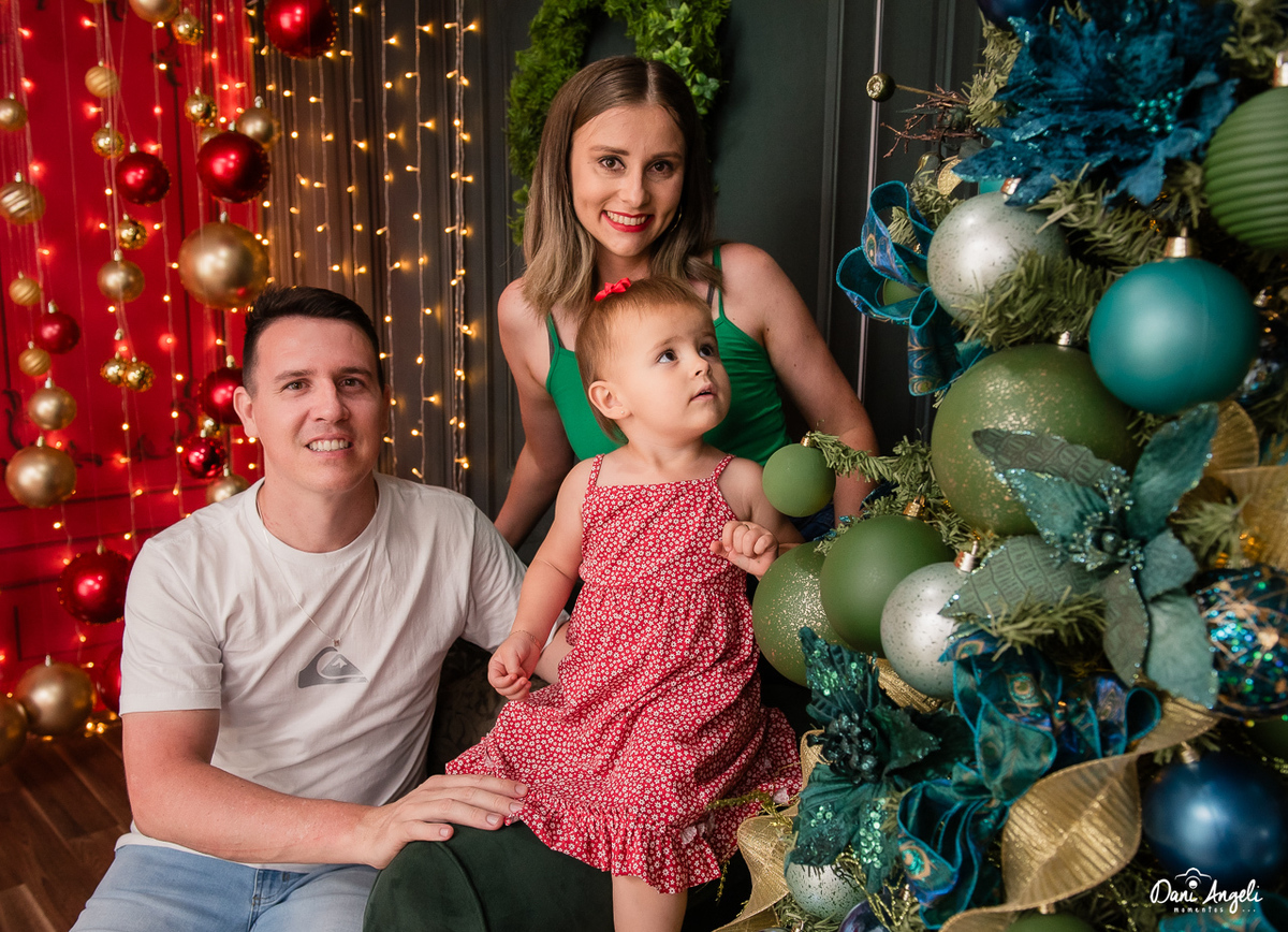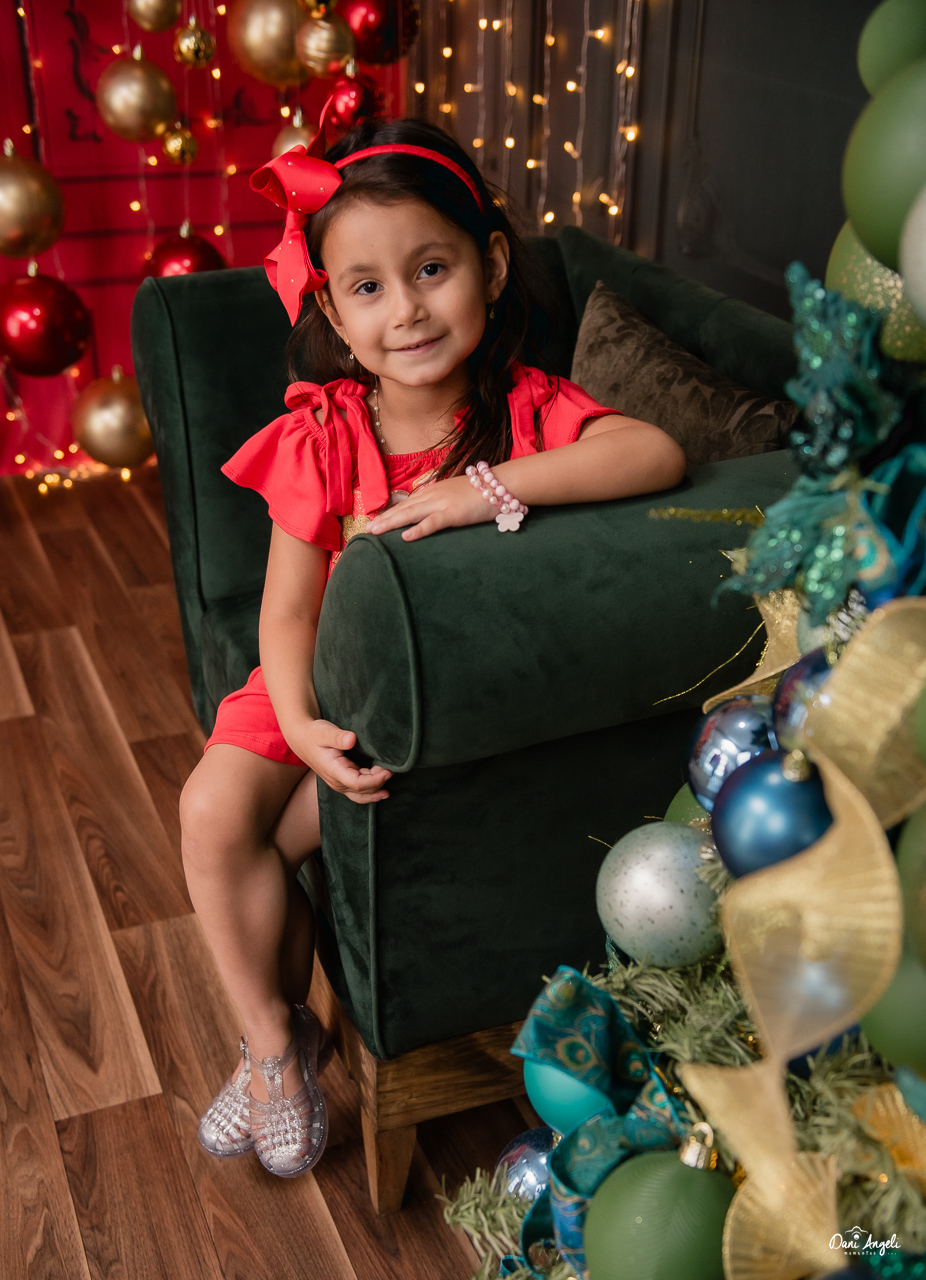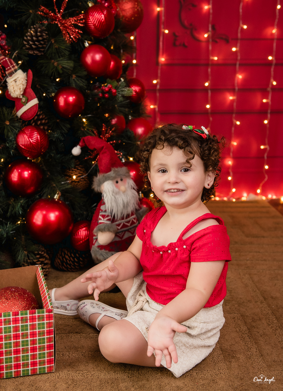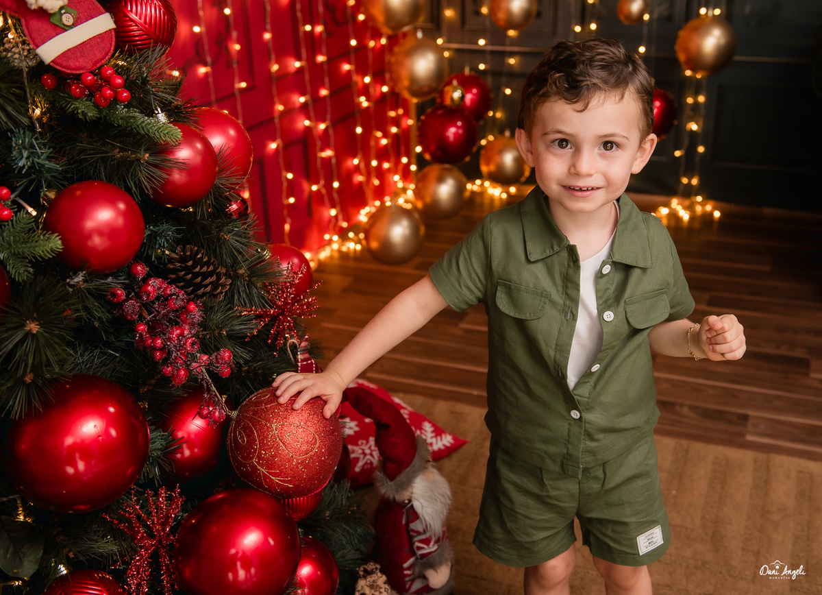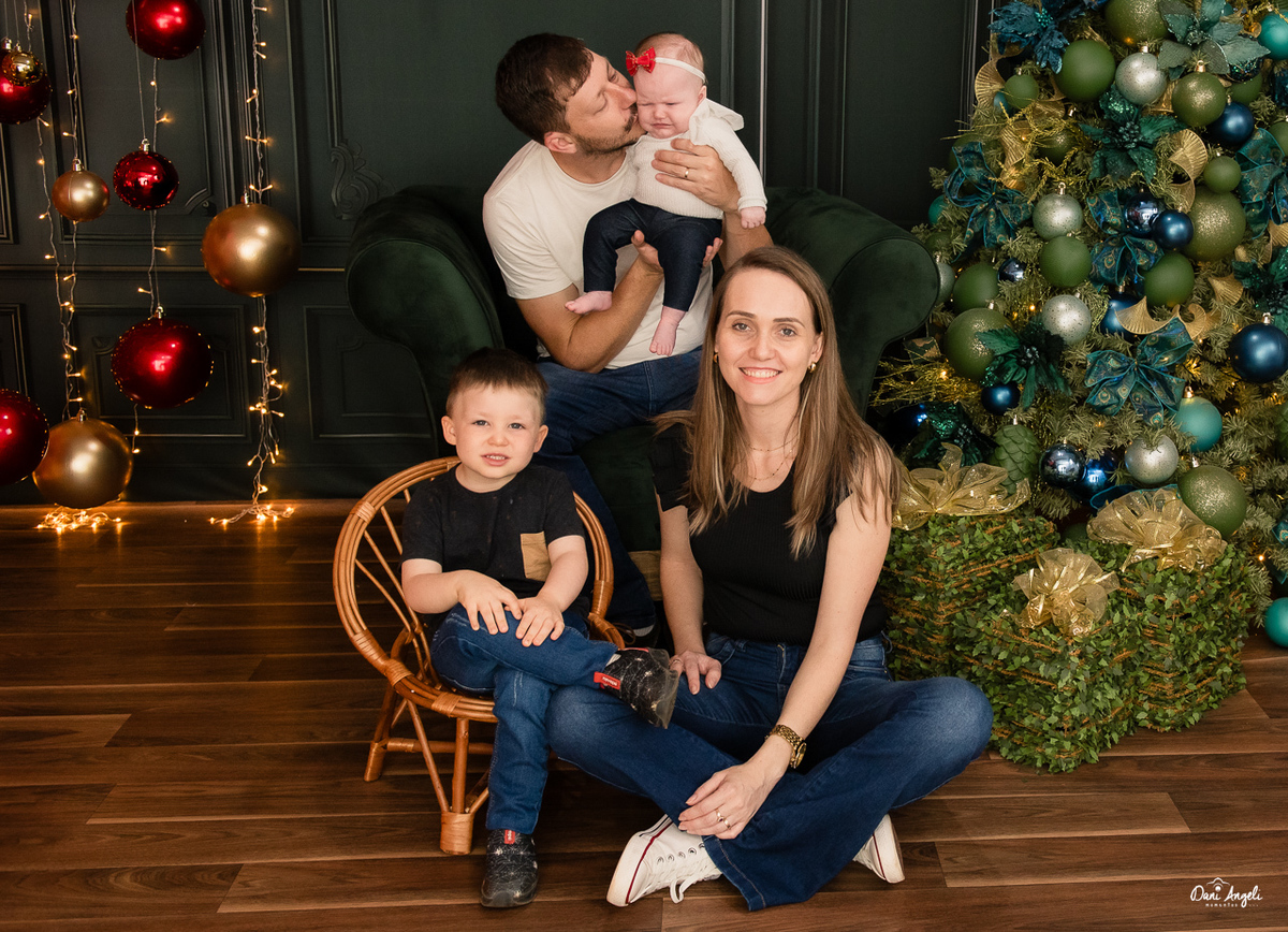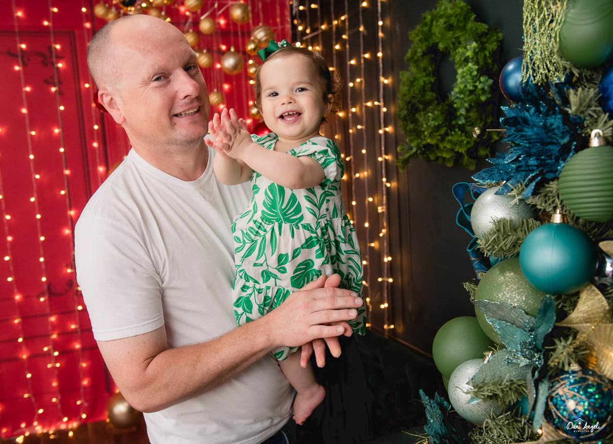 Nós preparamos tudo com muito carinho e cuidado, pensando em cada detalhe para que as suas fotos ficassem perfeitas. O cenário tem uma árvore de Natal iluminada, uma poltrona verde. Tudo para criar um clima natalino e mágico.