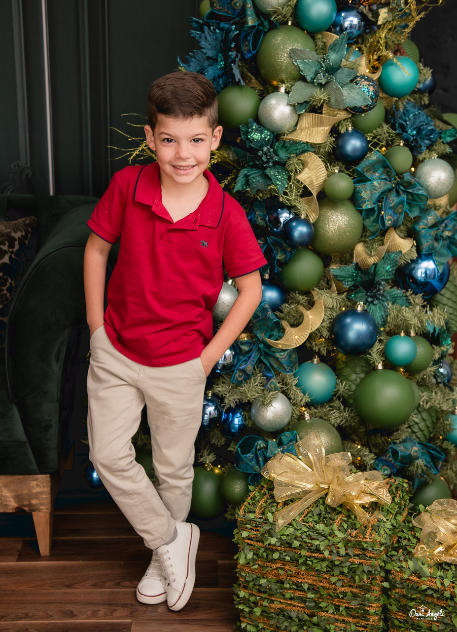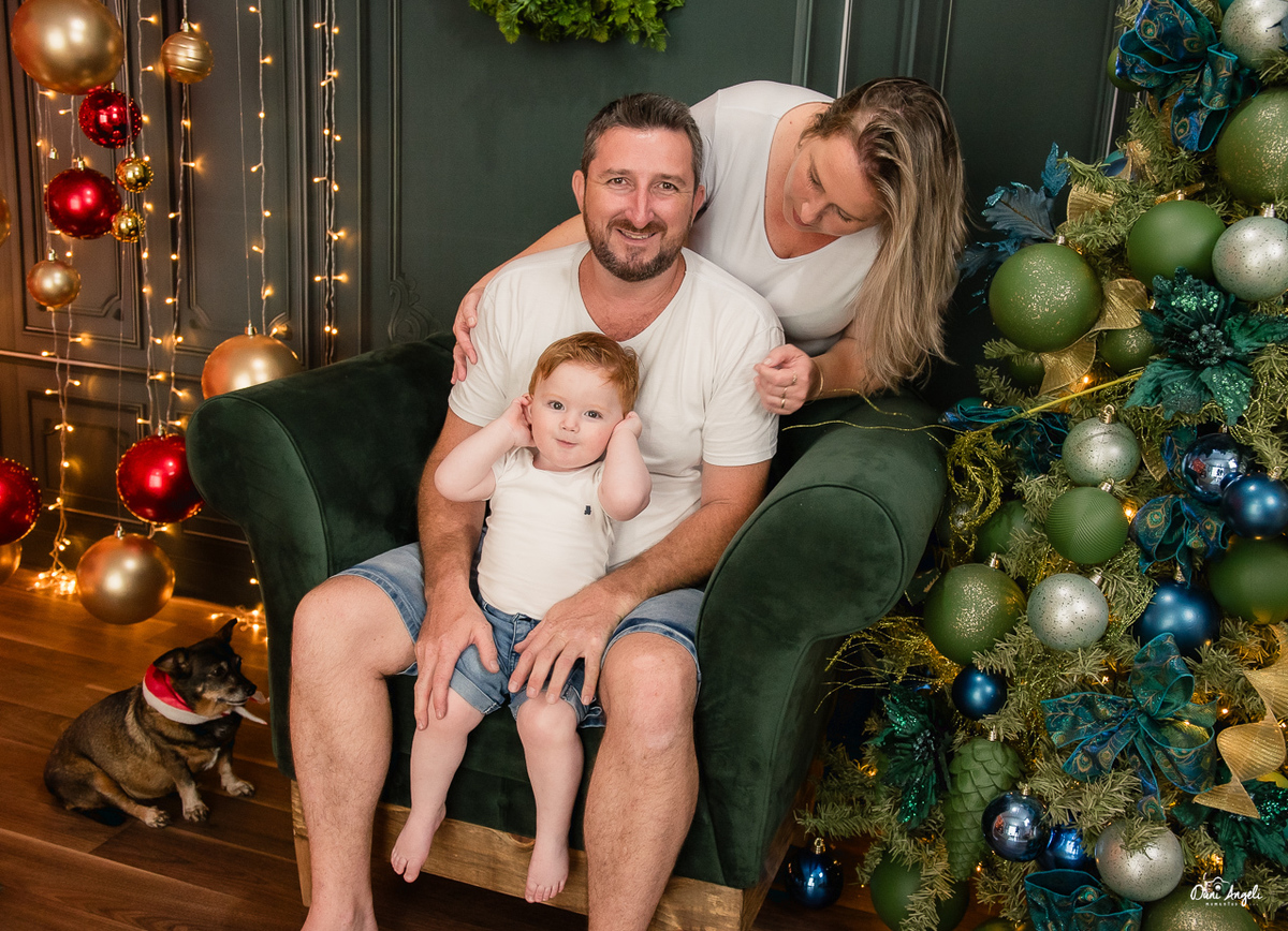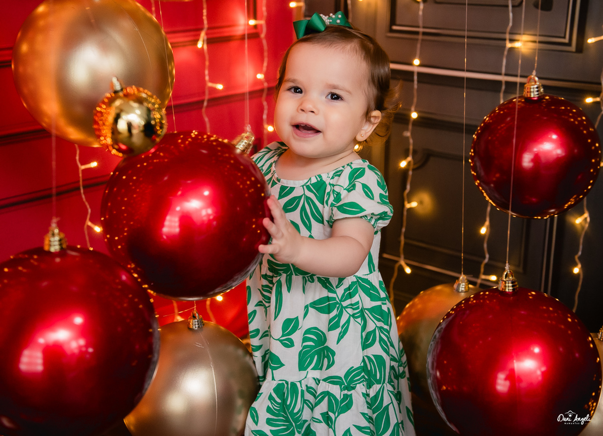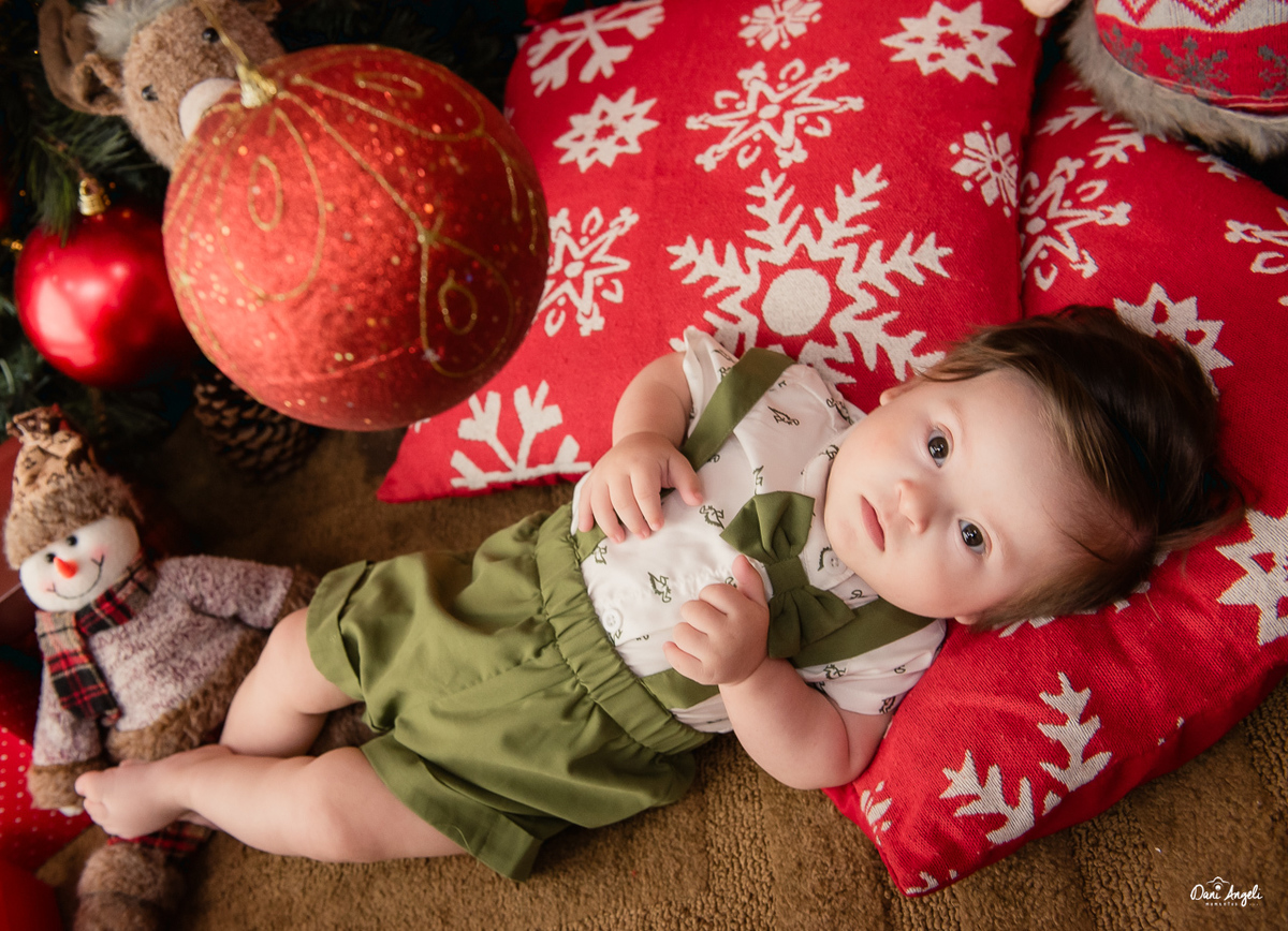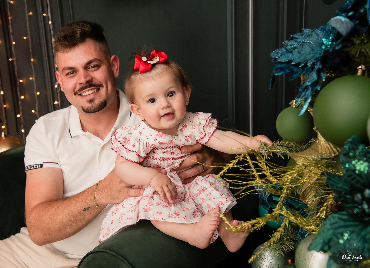 Nós preparamos tudo com muito carinho e cuidado, pensando em cada detalhe para que as suas fotos ficassem perfeitas. O cenário tem uma árvore de Natal iluminada, uma poltrona verde. Tudo para criar um clima natalino e mágico.