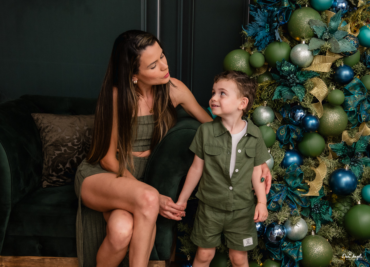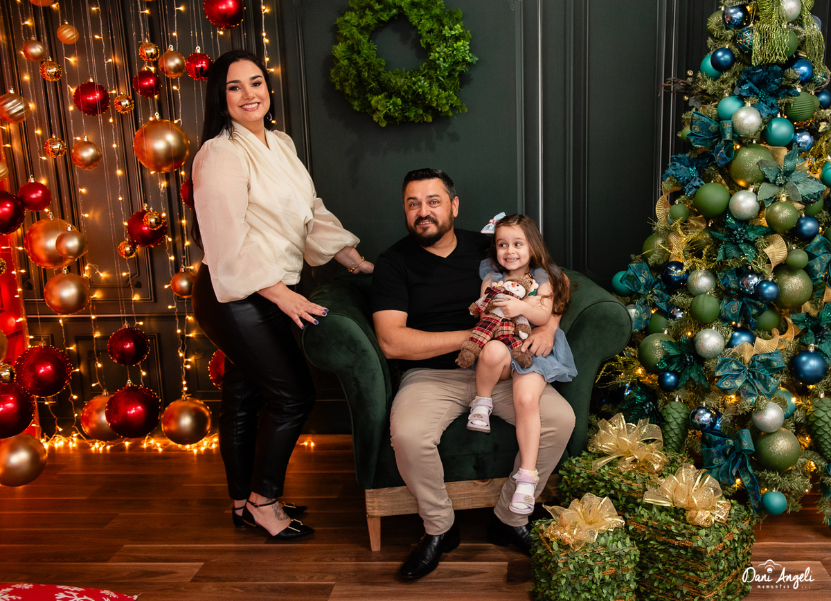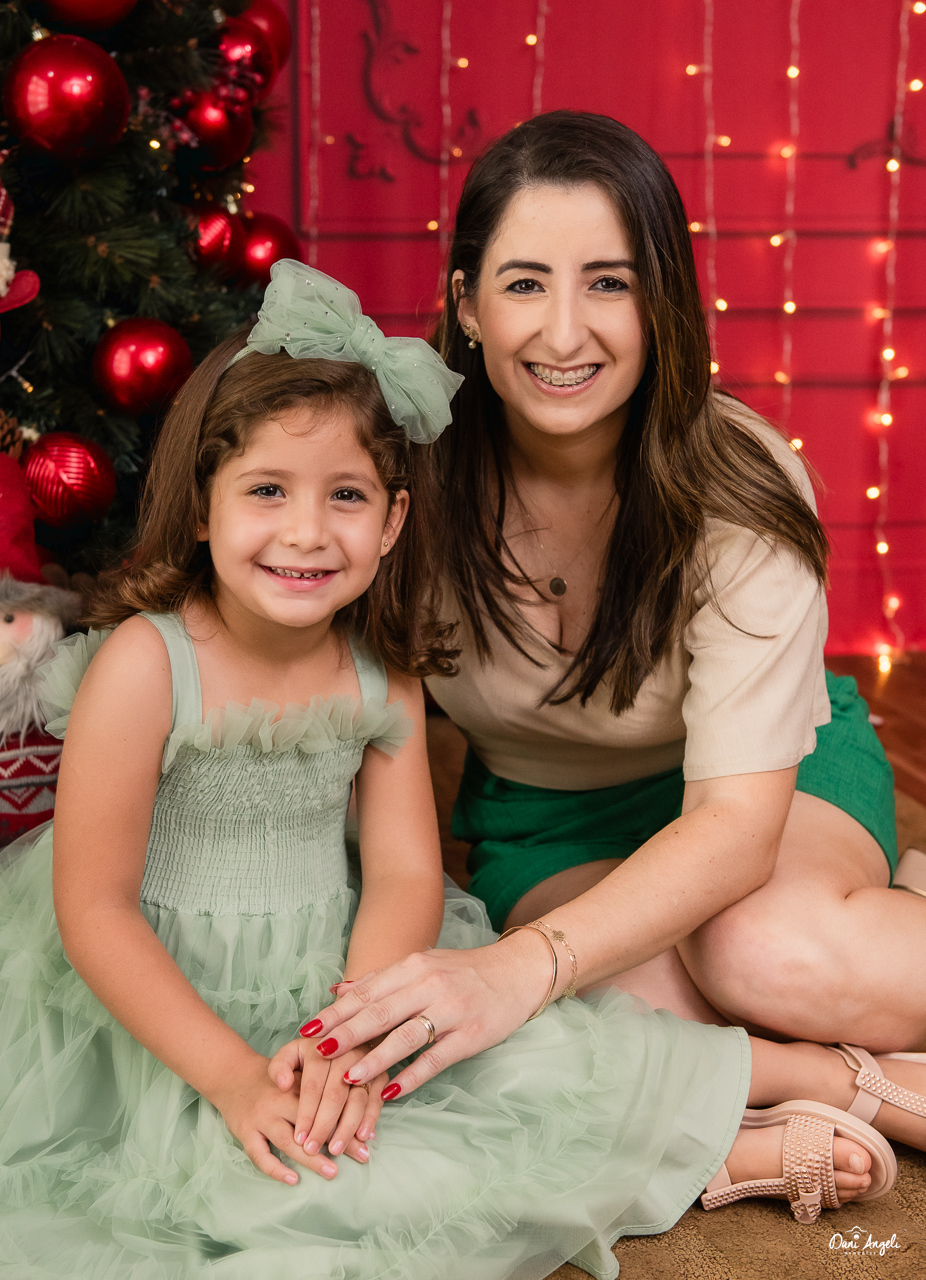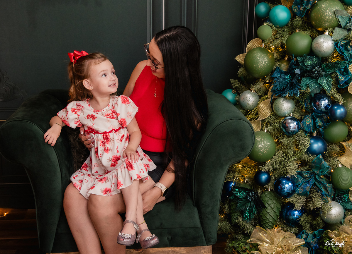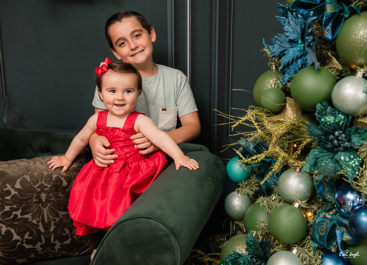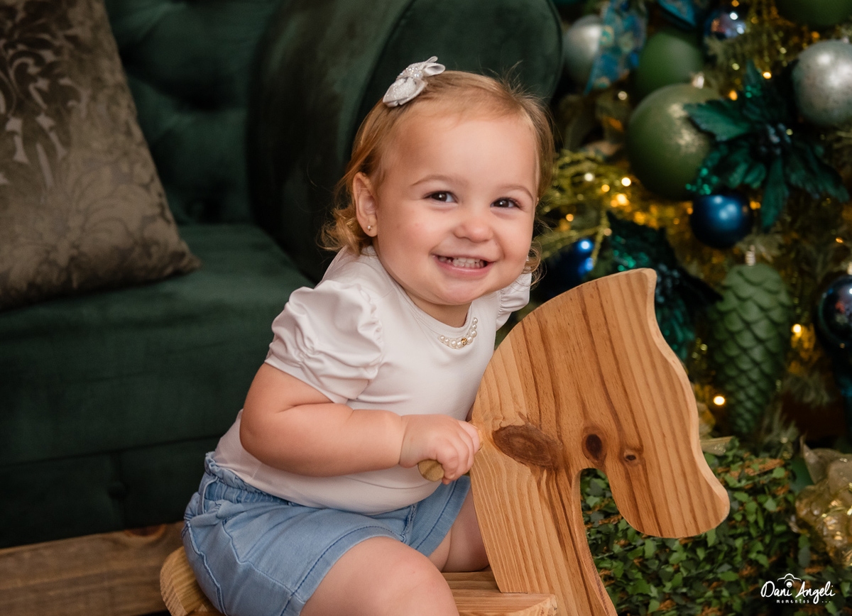 Nós preparamos tudo com muito carinho e cuidado, pensando em cada detalhe para que as suas fotos ficassem perfeitas. O cenário tem uma árvore de Natal iluminada, uma poltrona verde. Tudo para criar um clima natalino e mágico.
