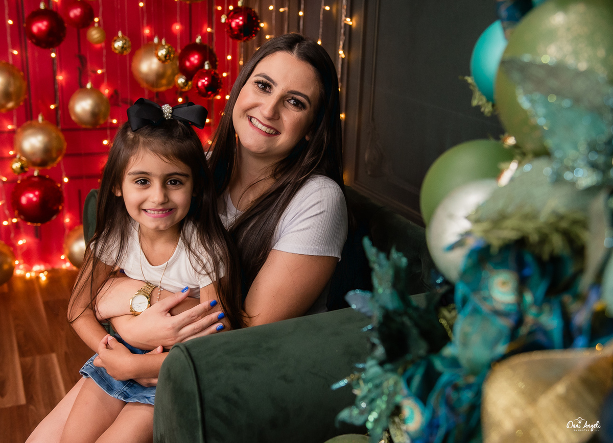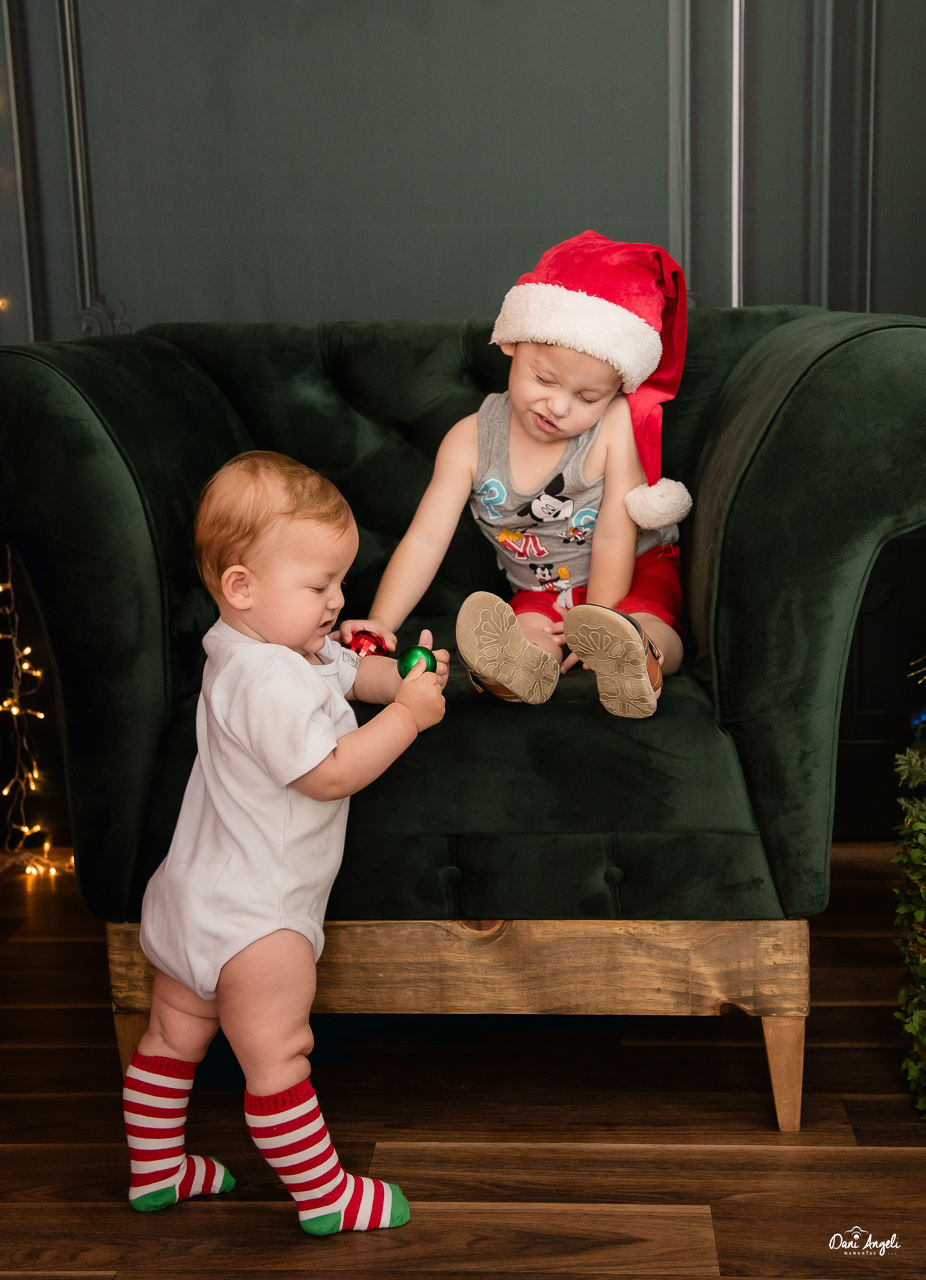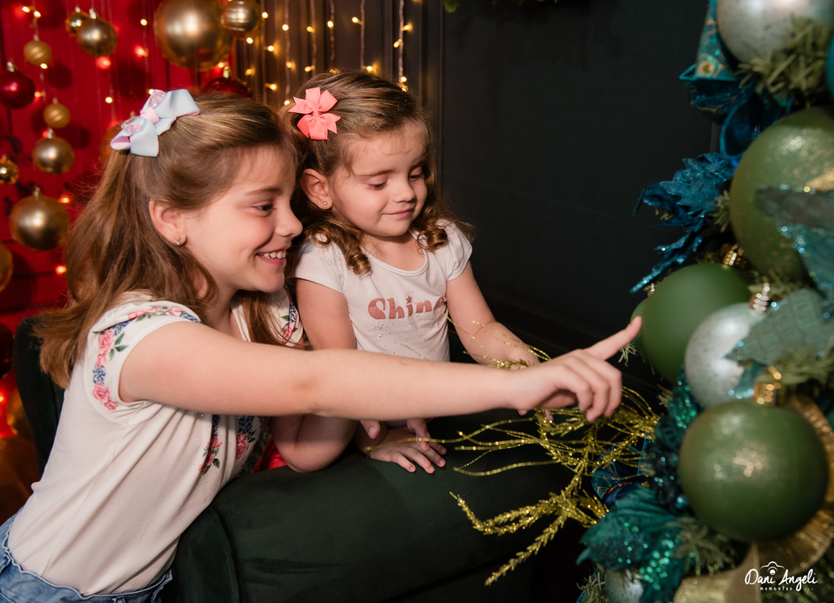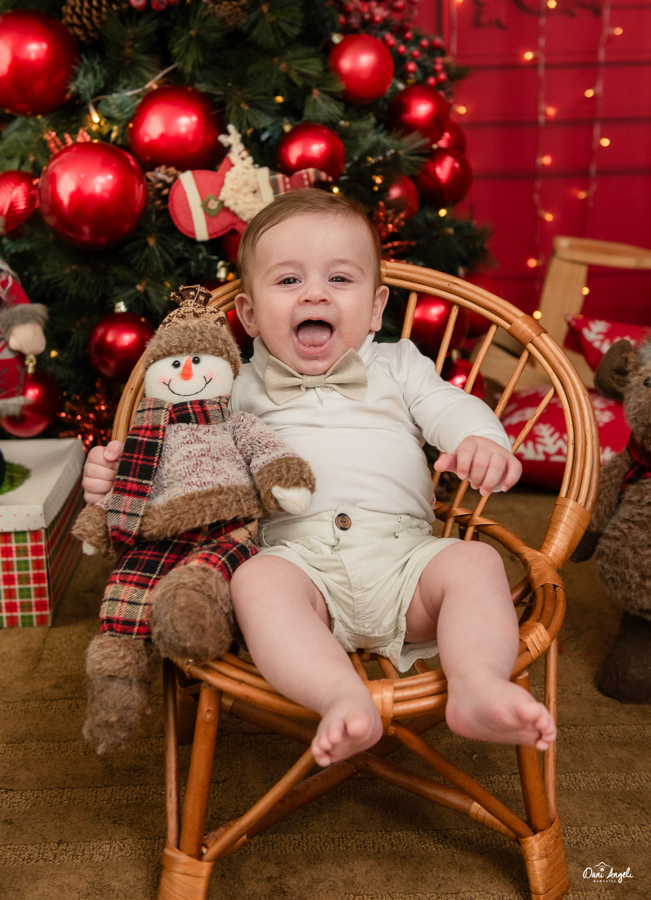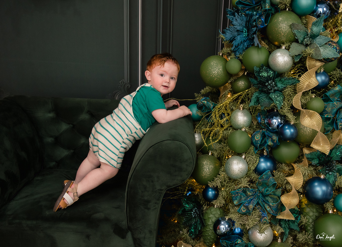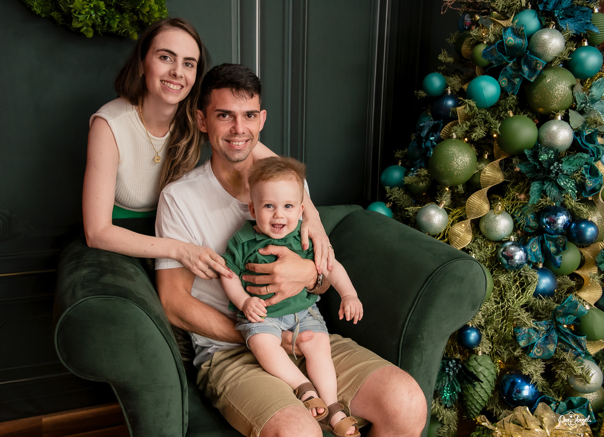 Nós preparamos tudo com muito carinho e cuidado, pensando em cada detalhe para que as suas fotos ficassem perfeitas. O cenário tem uma árvore de Natal iluminada, uma poltrona verde. Tudo para criar um clima natalino e mágico.