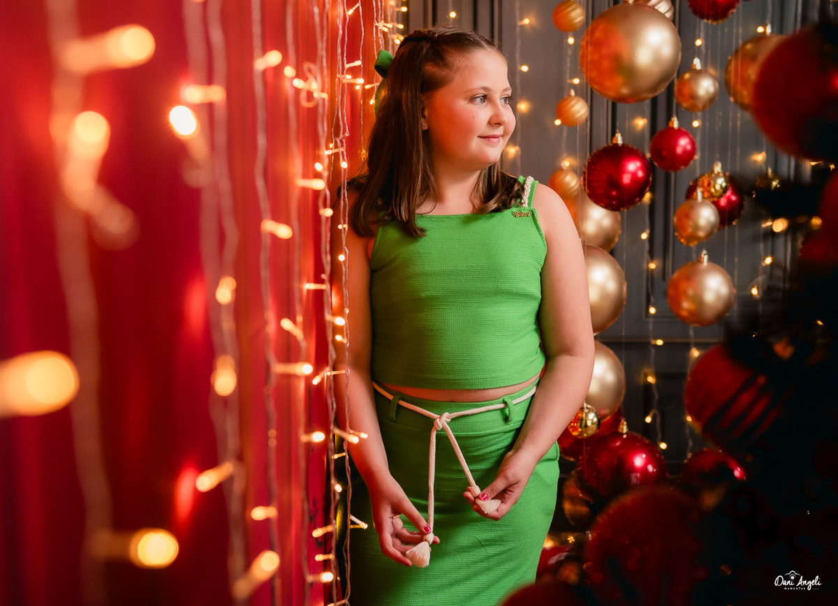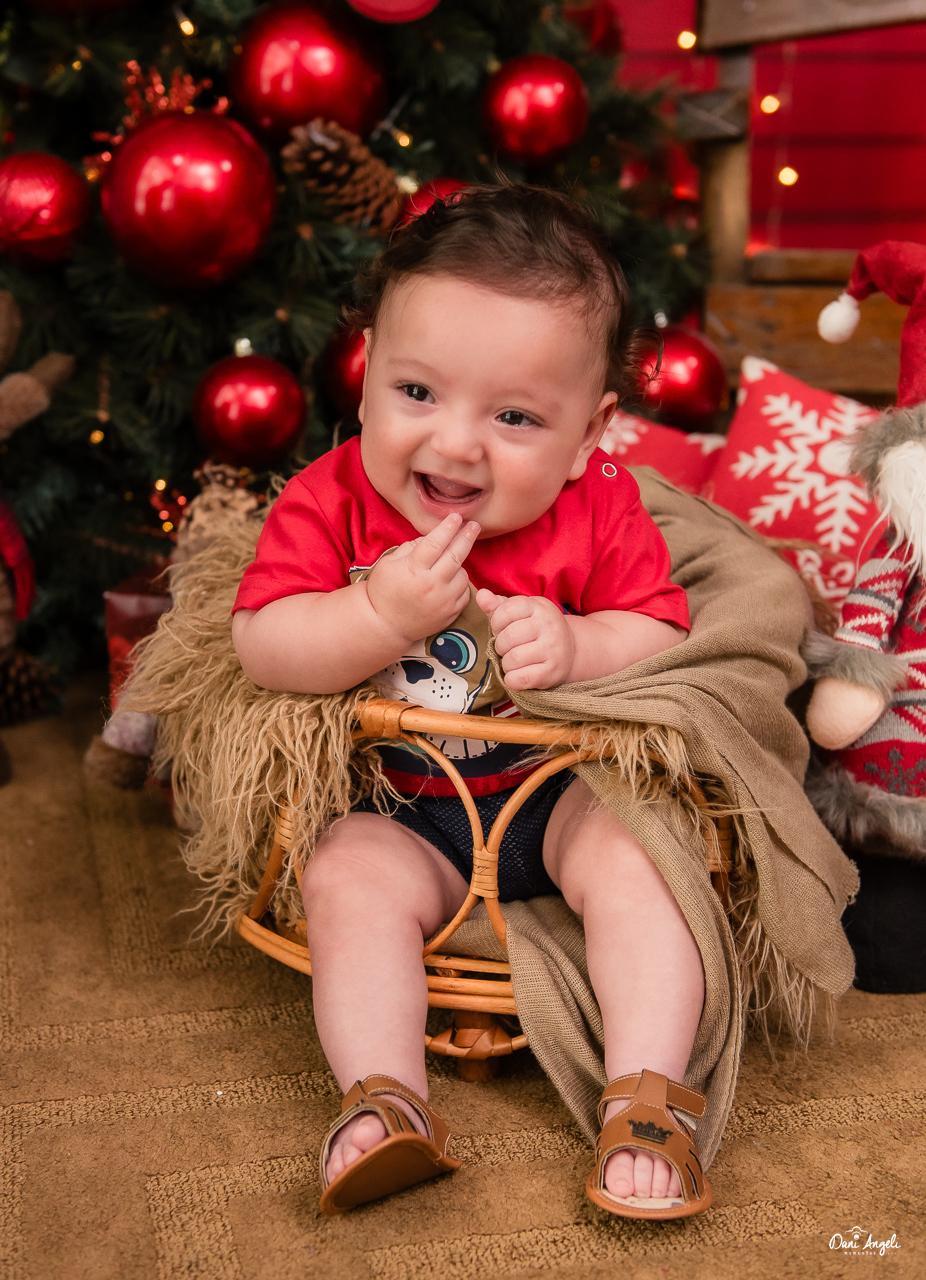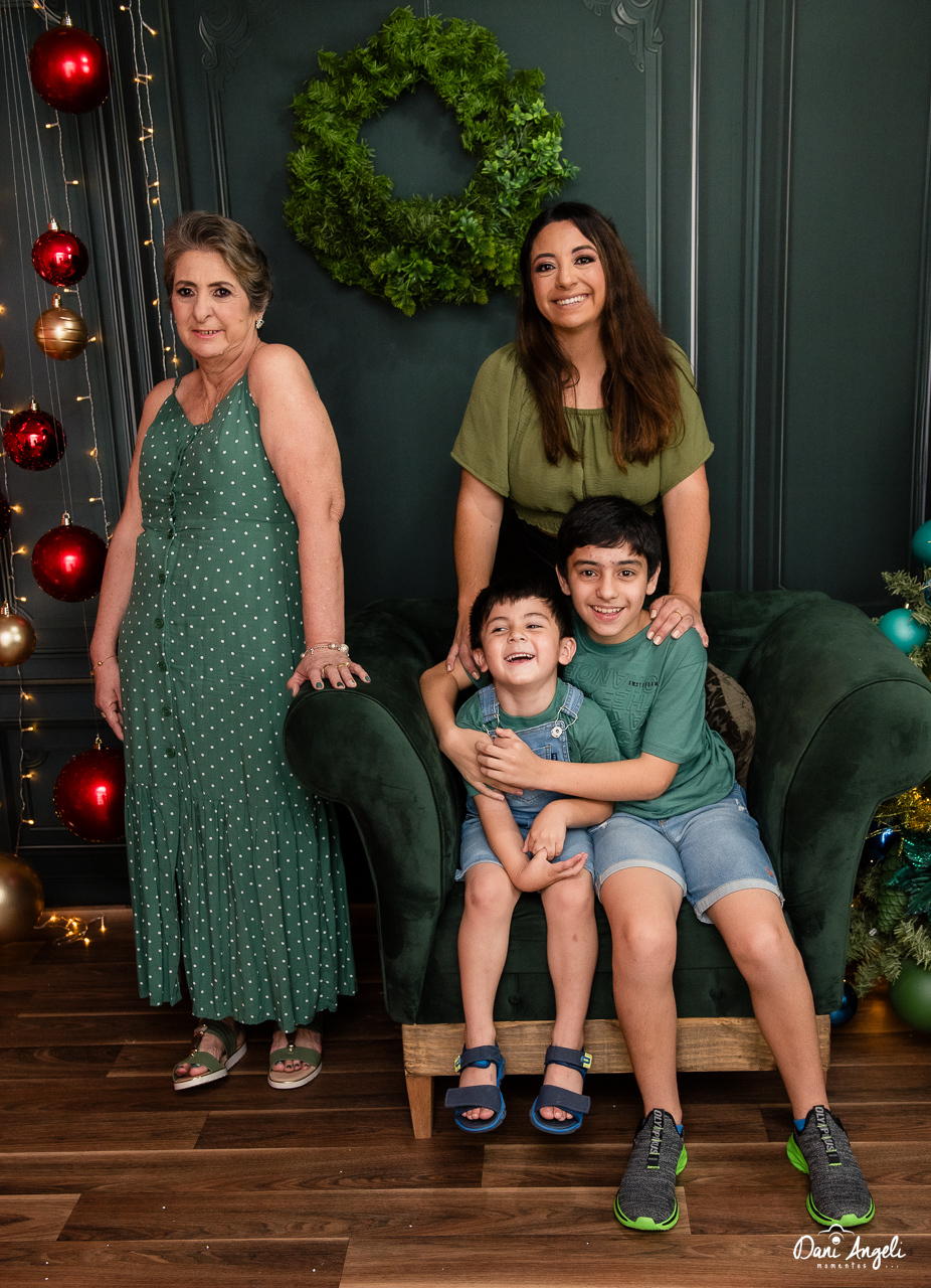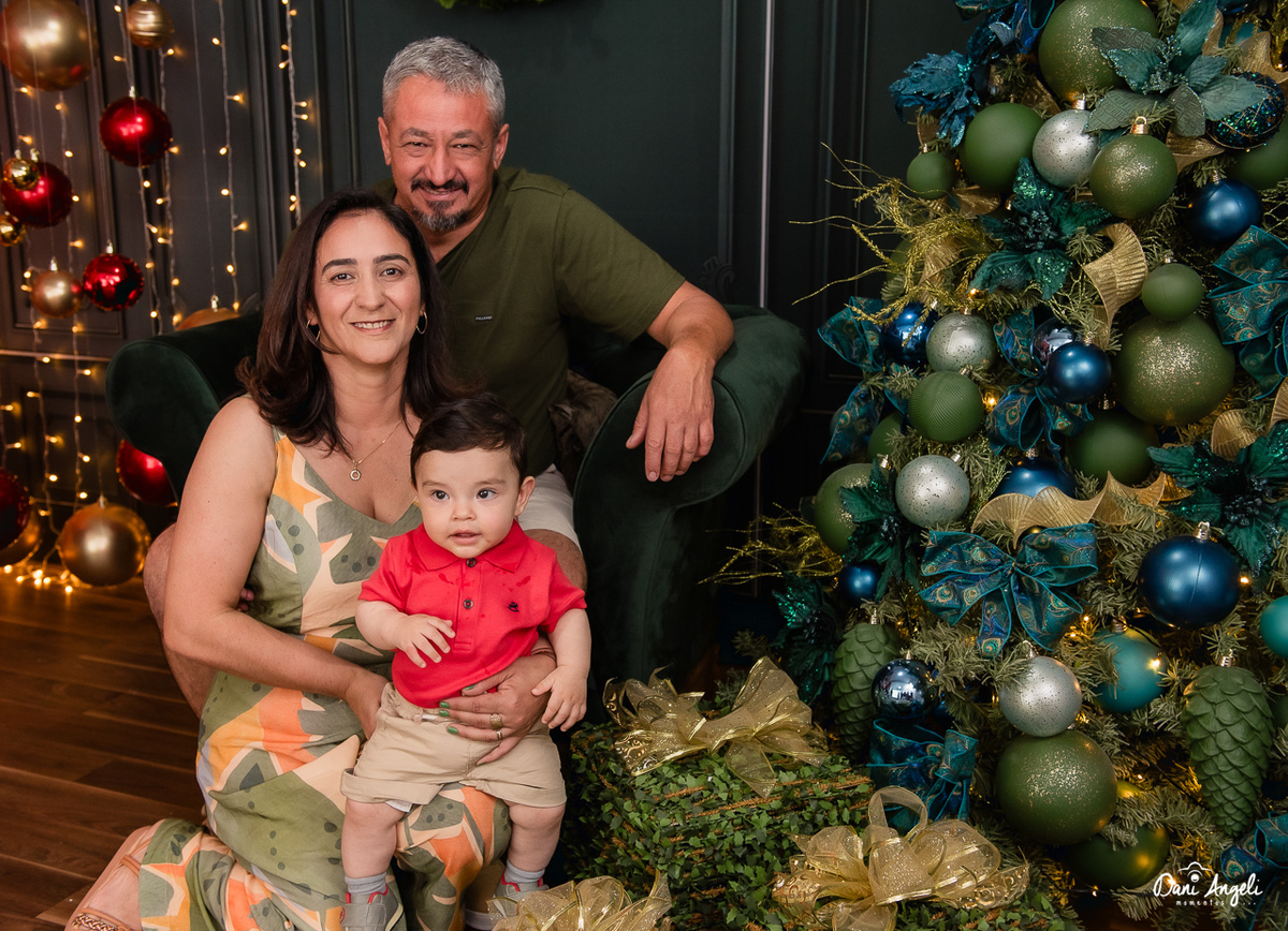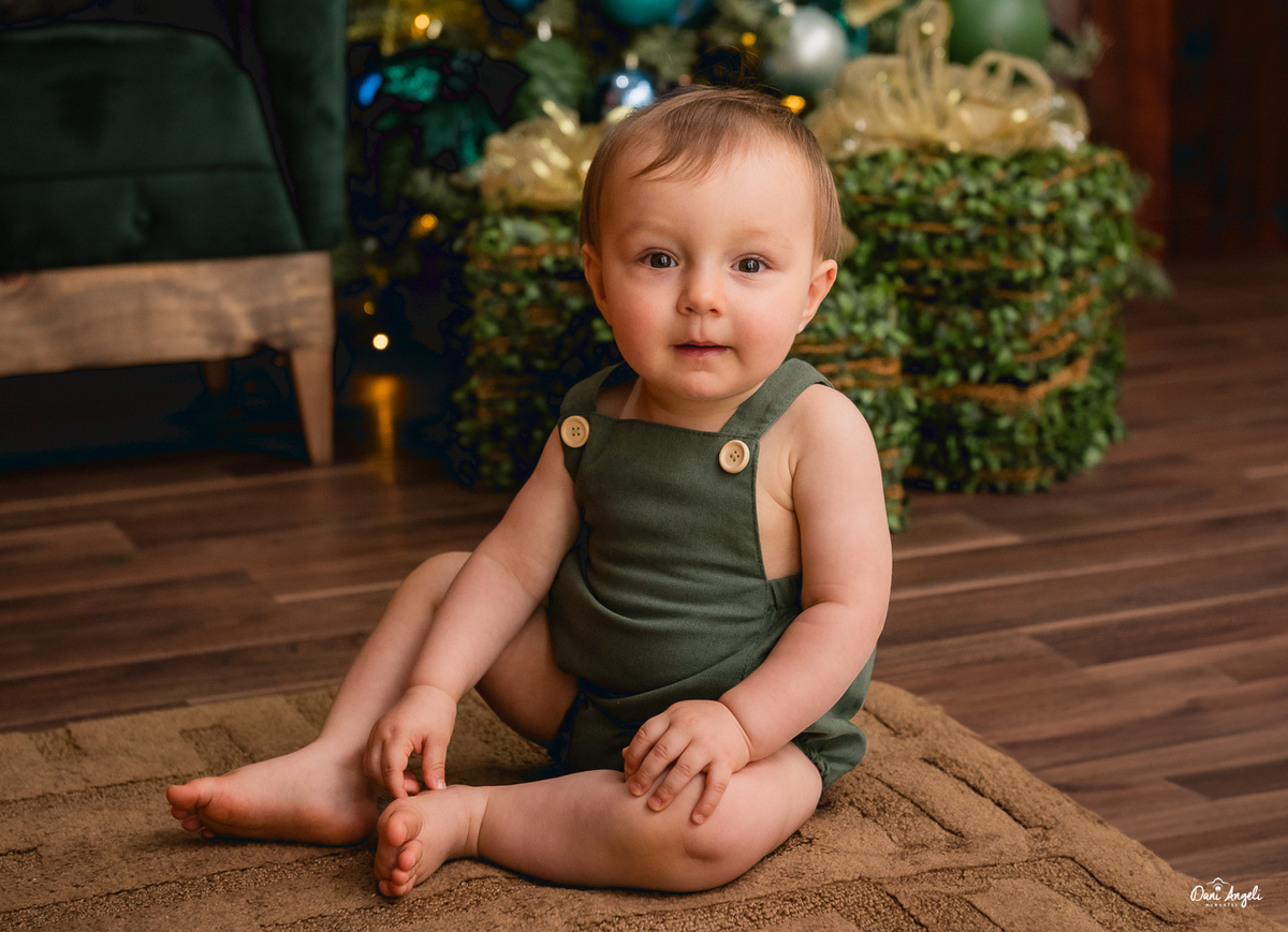 Nós preparamos tudo com muito carinho e cuidado, pensando em cada detalhe para que as suas fotos ficassem perfeitas. O cenário tem uma árvore de Natal iluminada, uma poltrona verde. Tudo para criar um clima natalino e mágico.