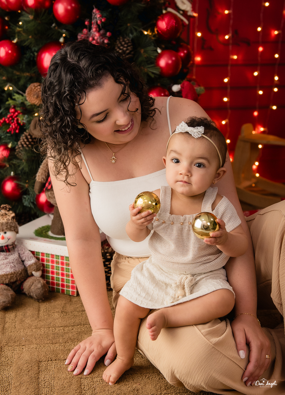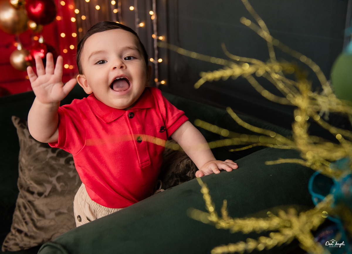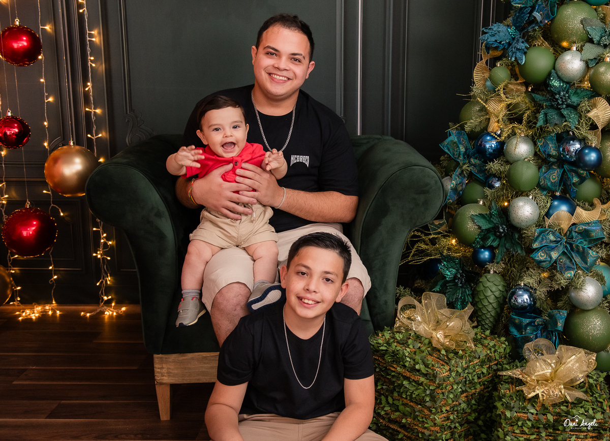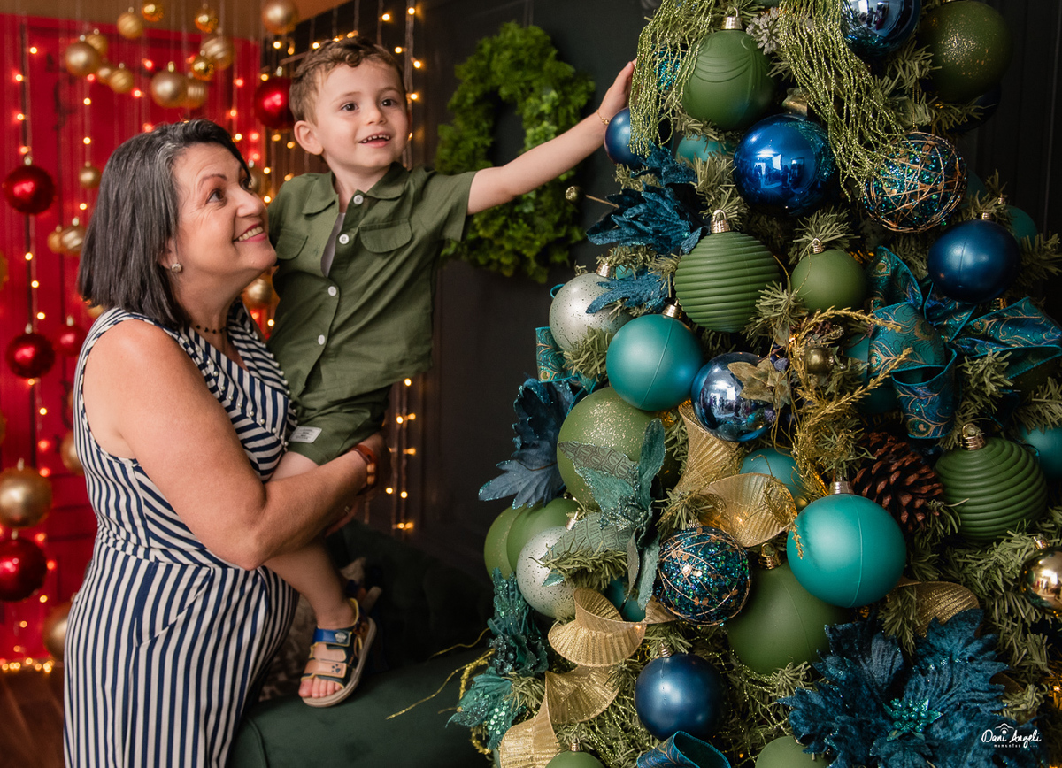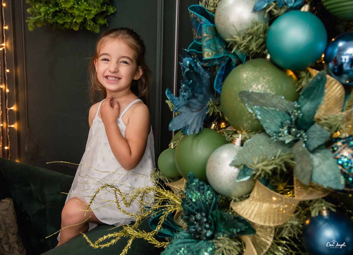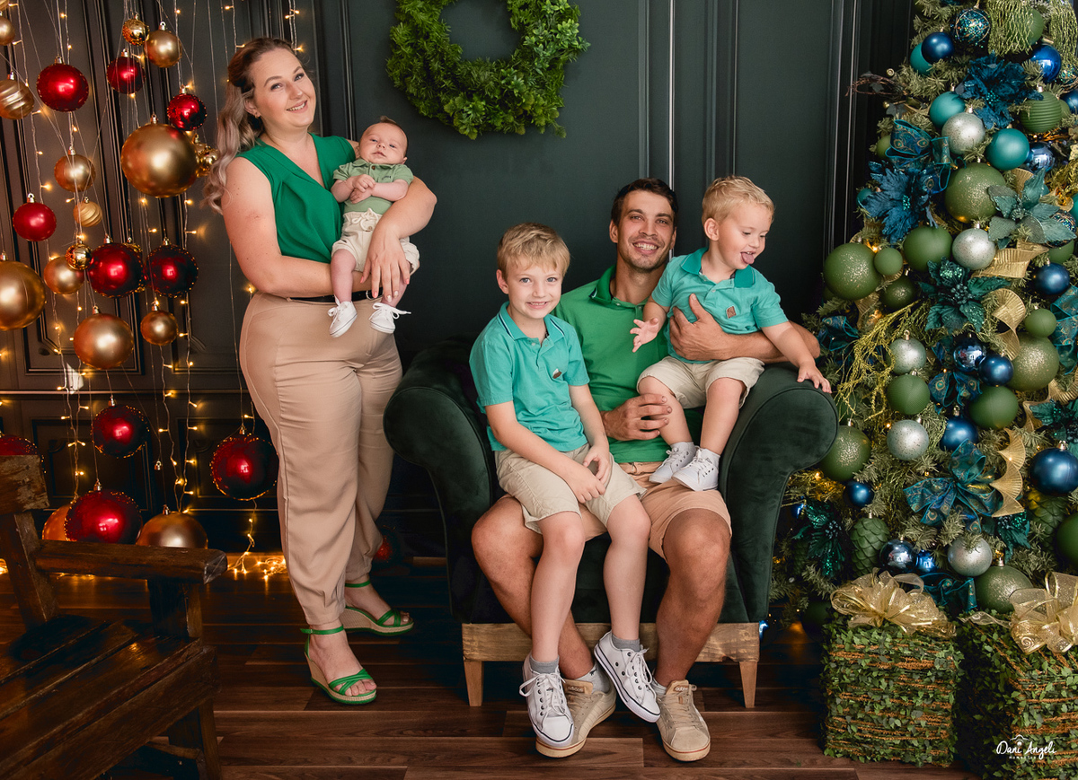 Nós preparamos tudo com muito carinho e cuidado, pensando em cada detalhe para que as suas fotos ficassem perfeitas. O cenário tem uma árvore de Natal iluminada, uma poltrona verde. Tudo para criar um clima natalino e mágico.