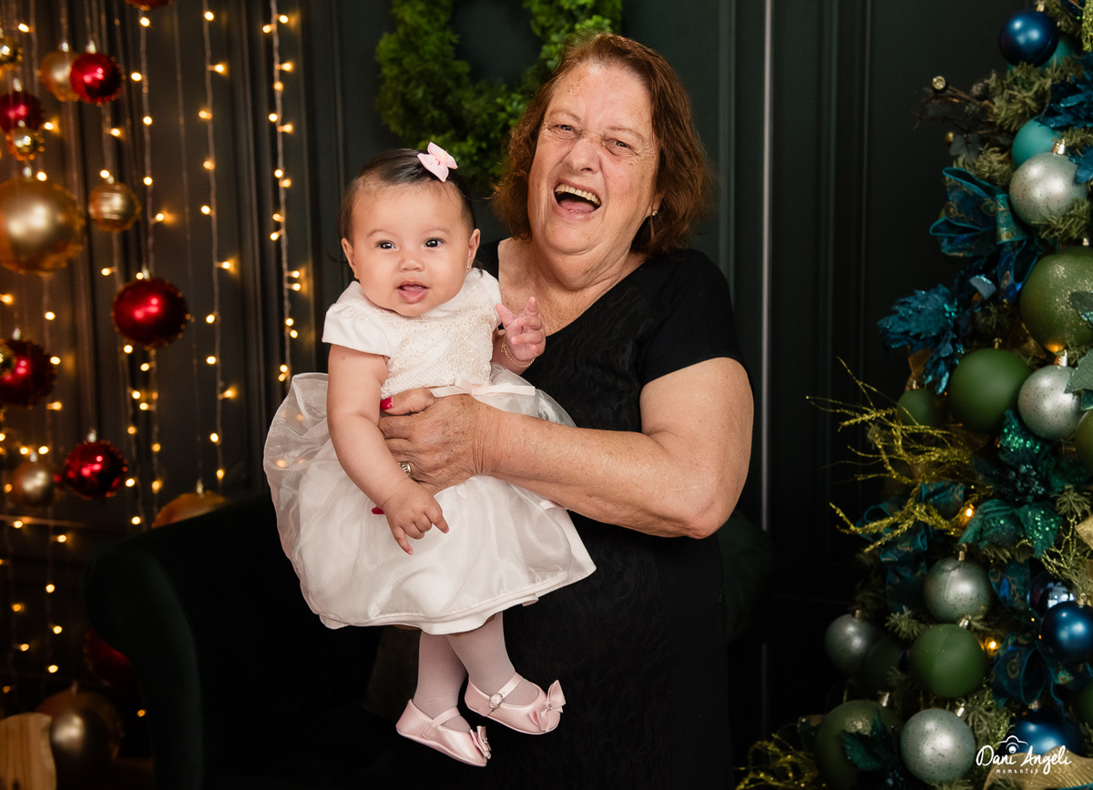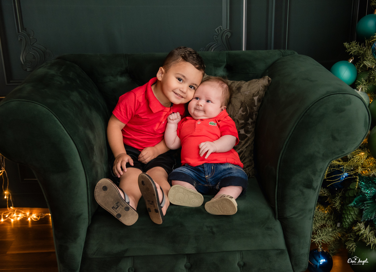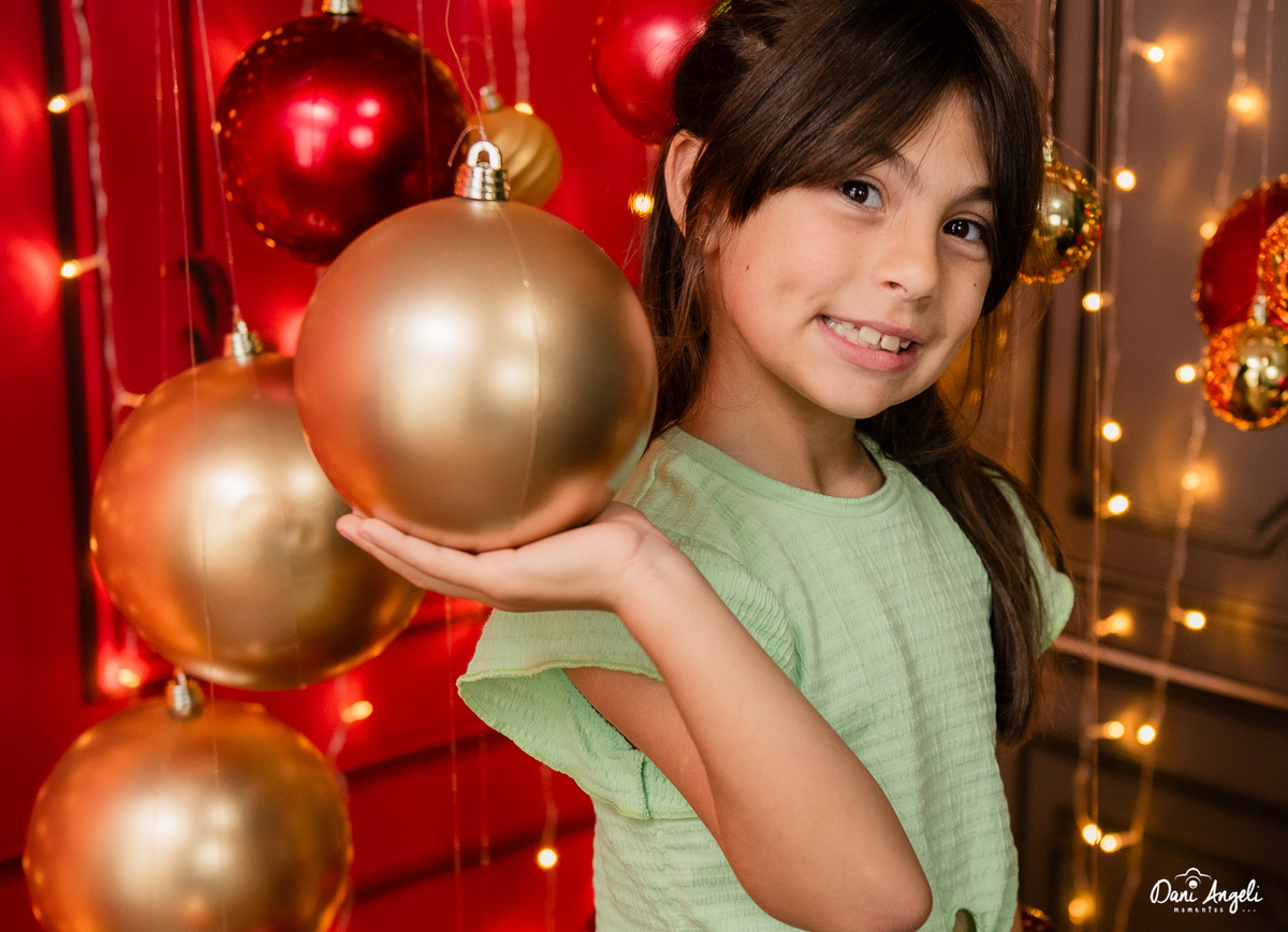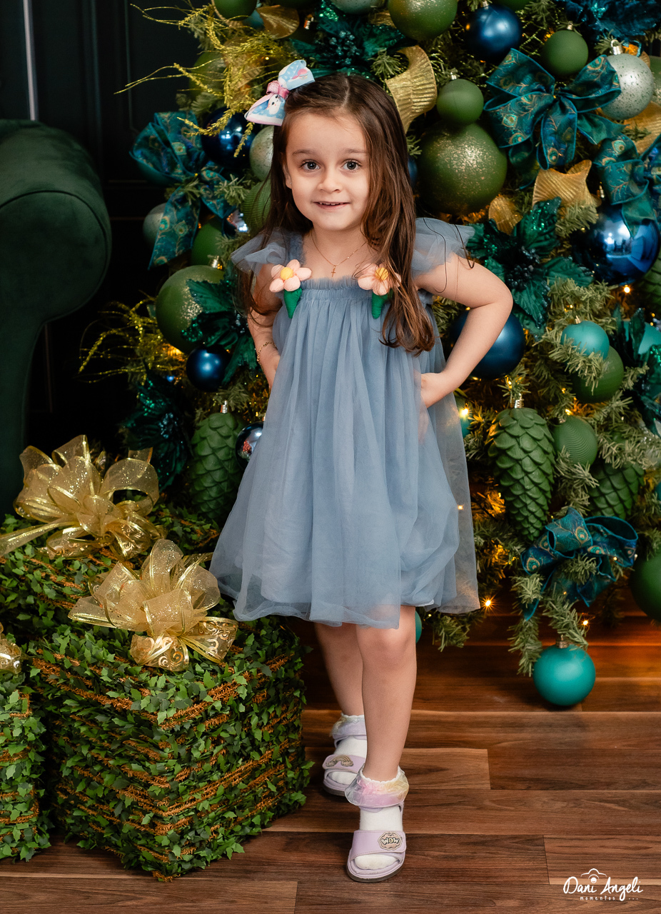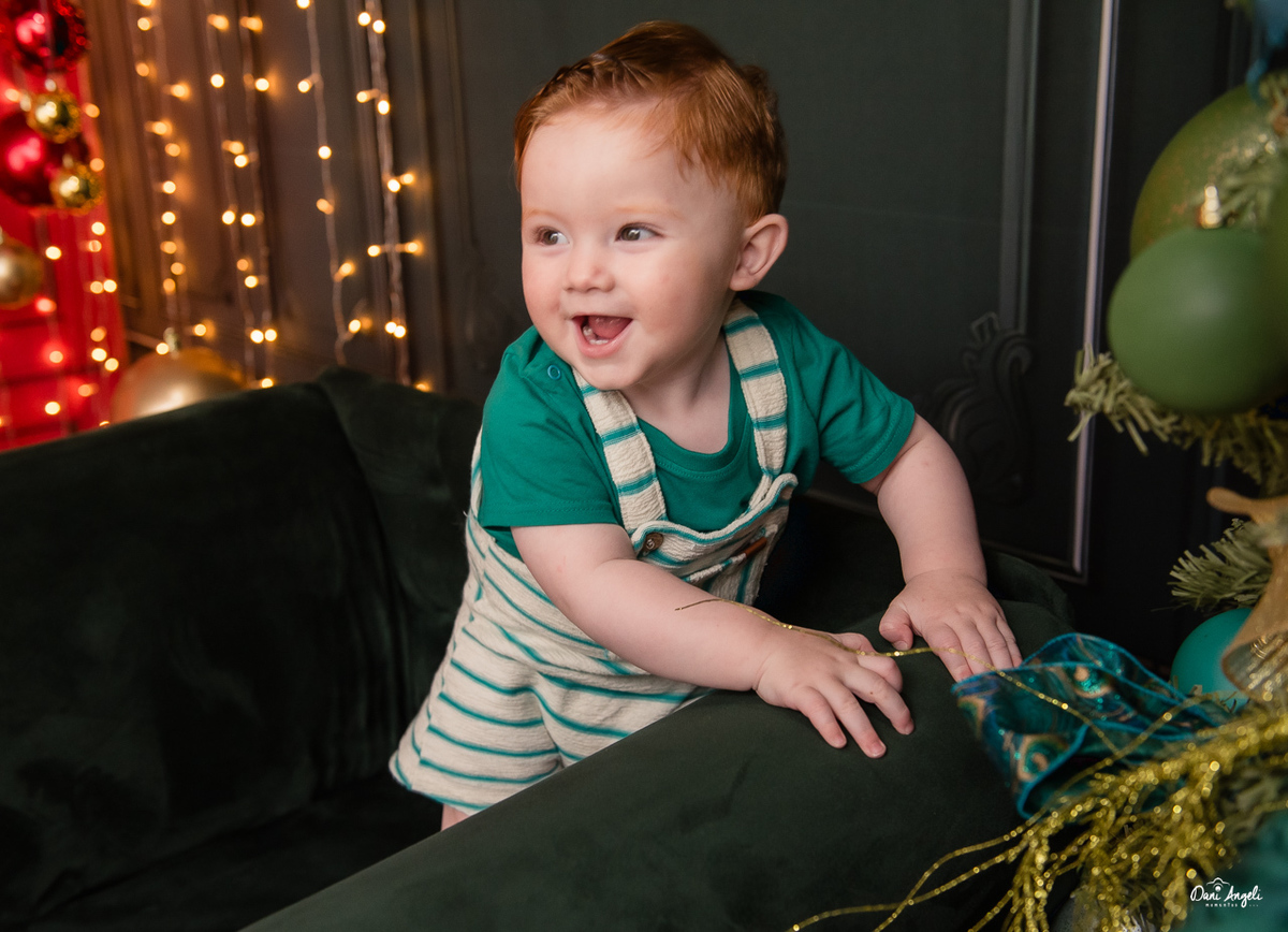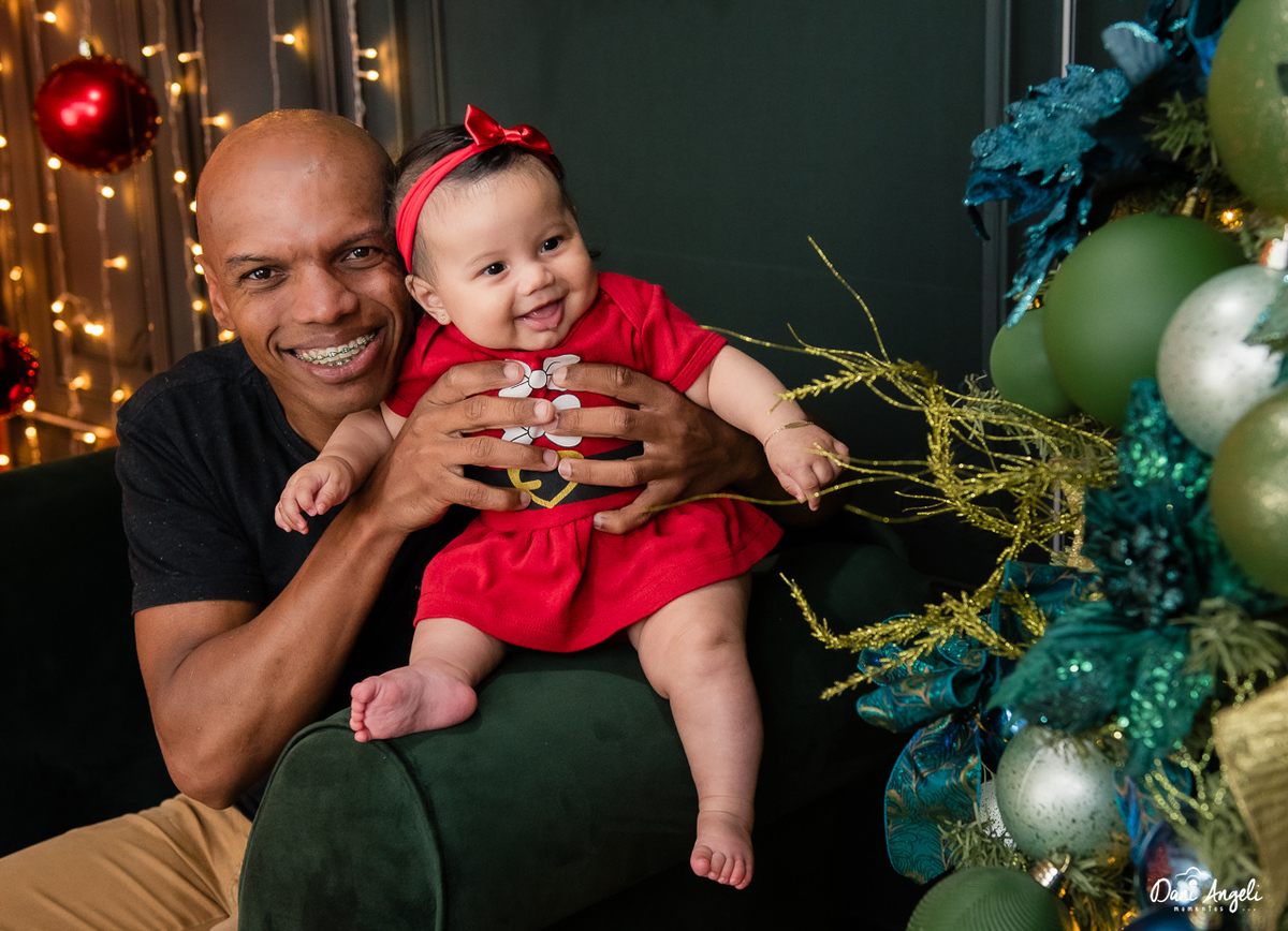 Nós preparamos tudo com muito carinho e cuidado, pensando em cada detalhe para que as suas fotos ficassem perfeitas. O cenário tem uma árvore de Natal iluminada, uma poltrona verde. Tudo para criar um clima natalino e mágico.
