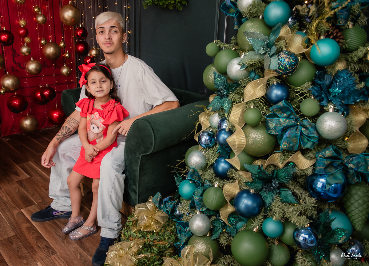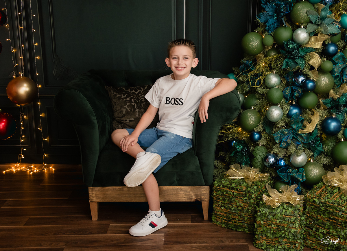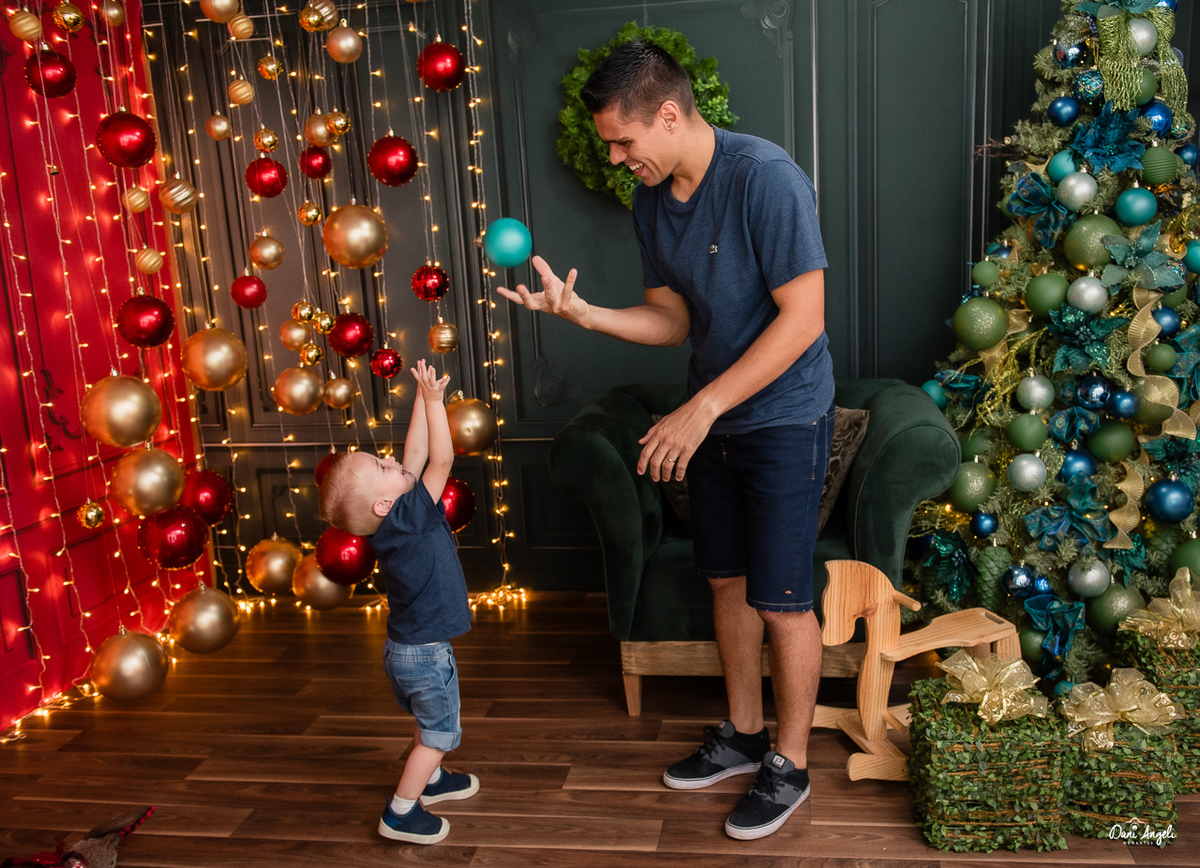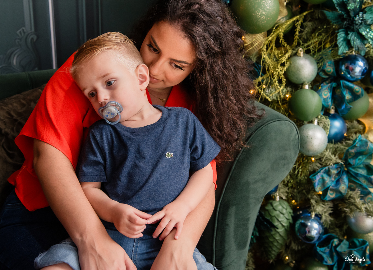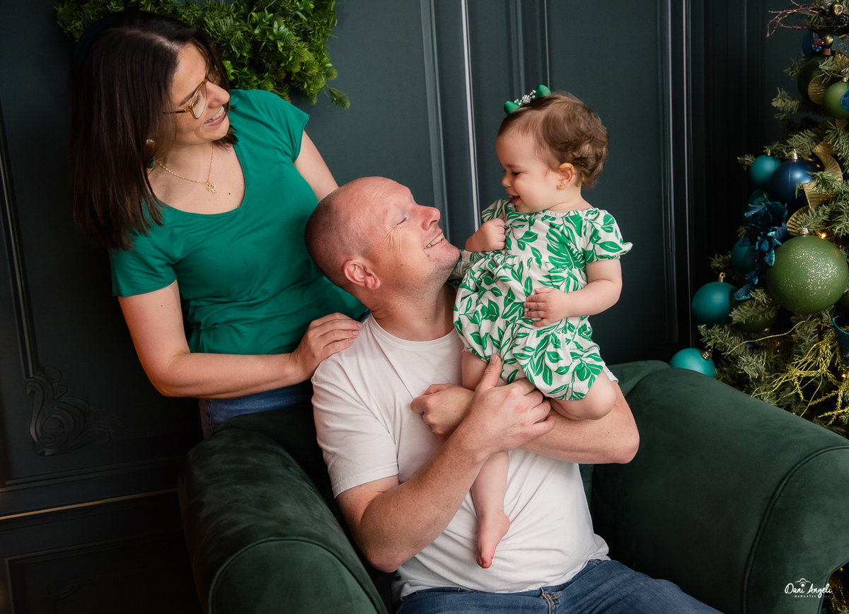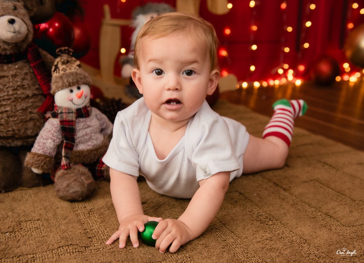 Nós preparamos tudo com muito carinho e cuidado, pensando em cada detalhe para que as suas fotos ficassem perfeitas. O cenário tem uma árvore de Natal iluminada, uma poltrona verde. Tudo para criar um clima natalino e mágico.