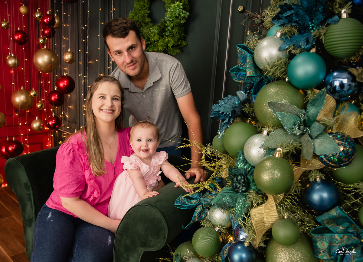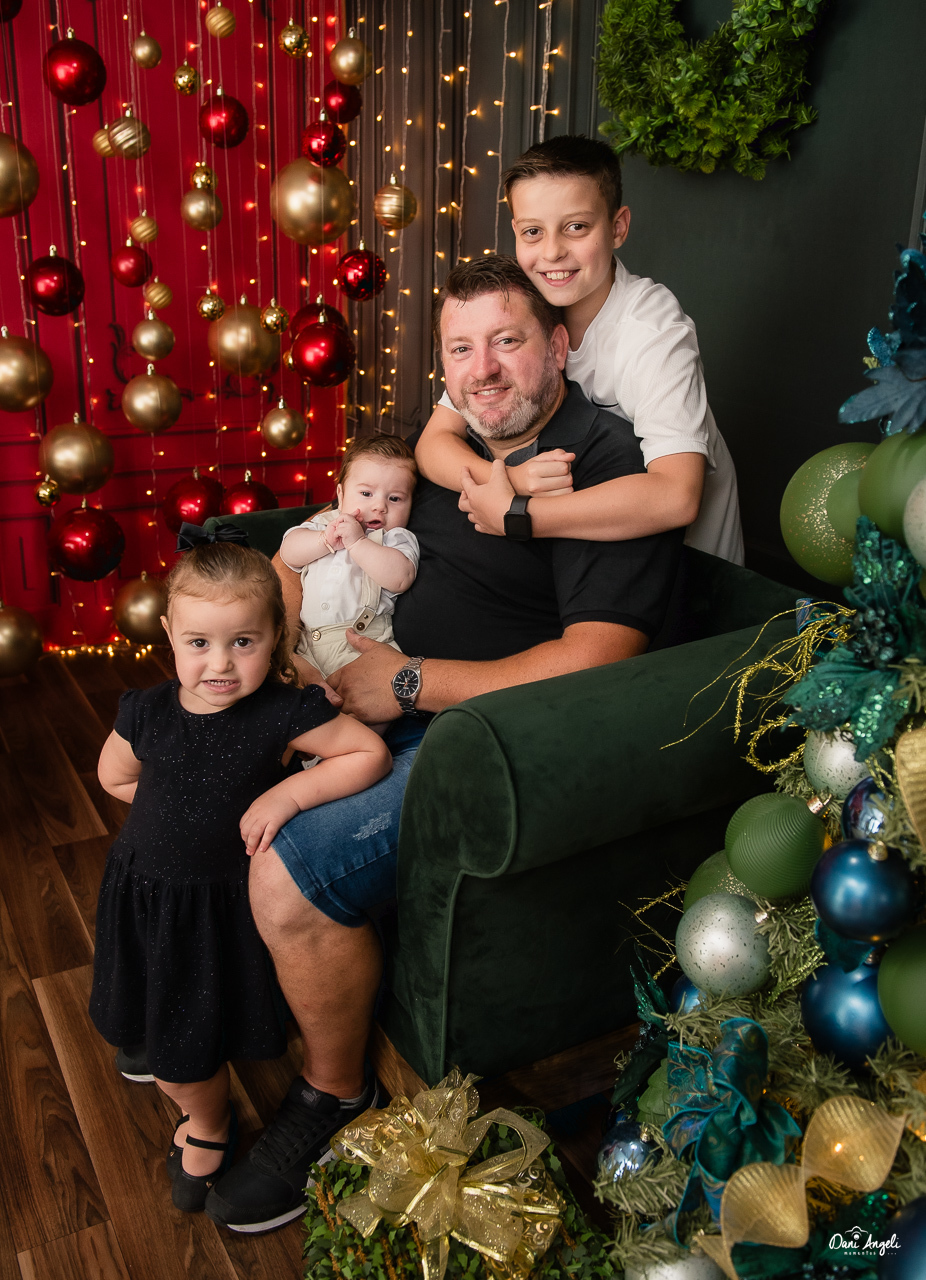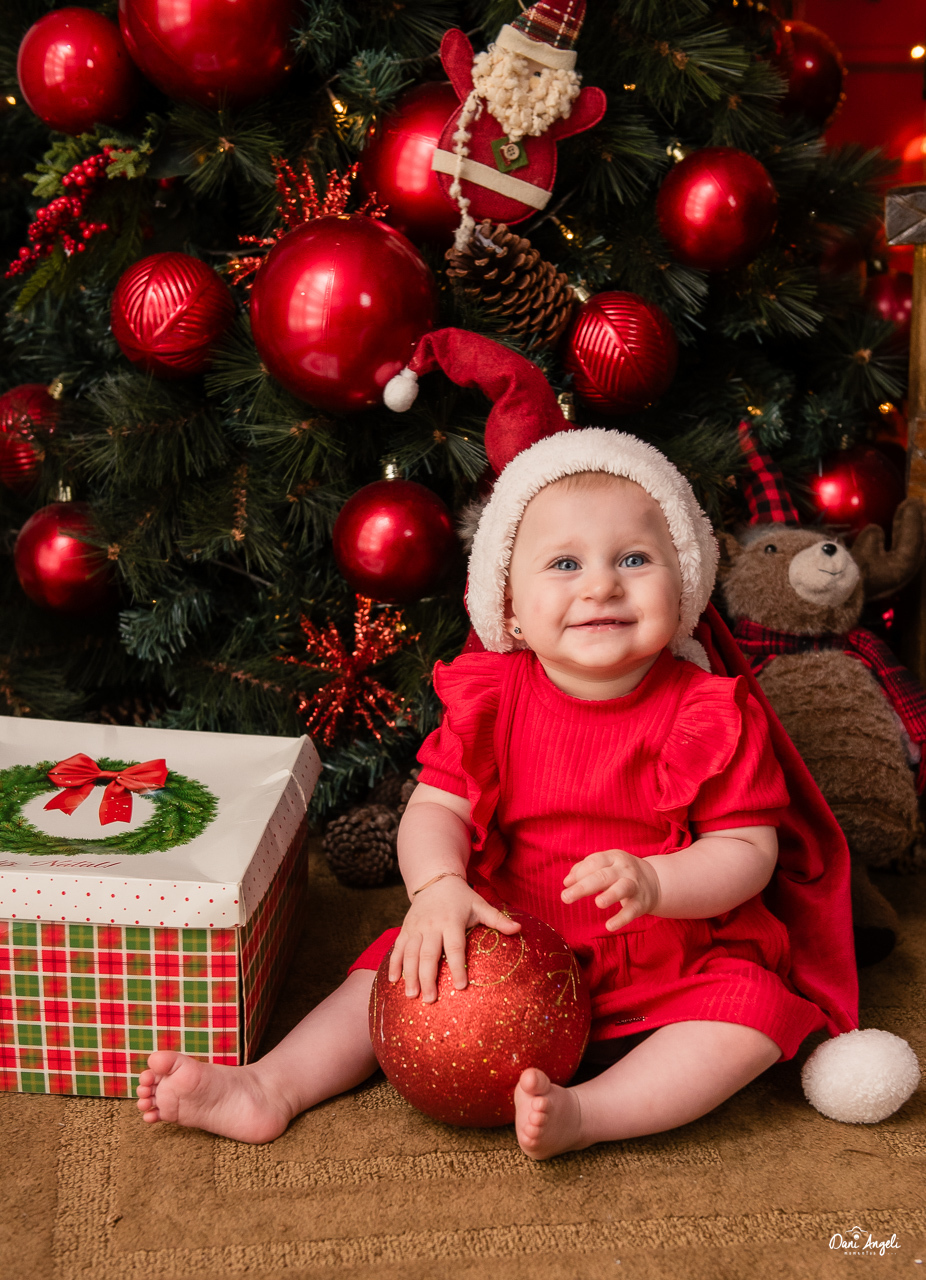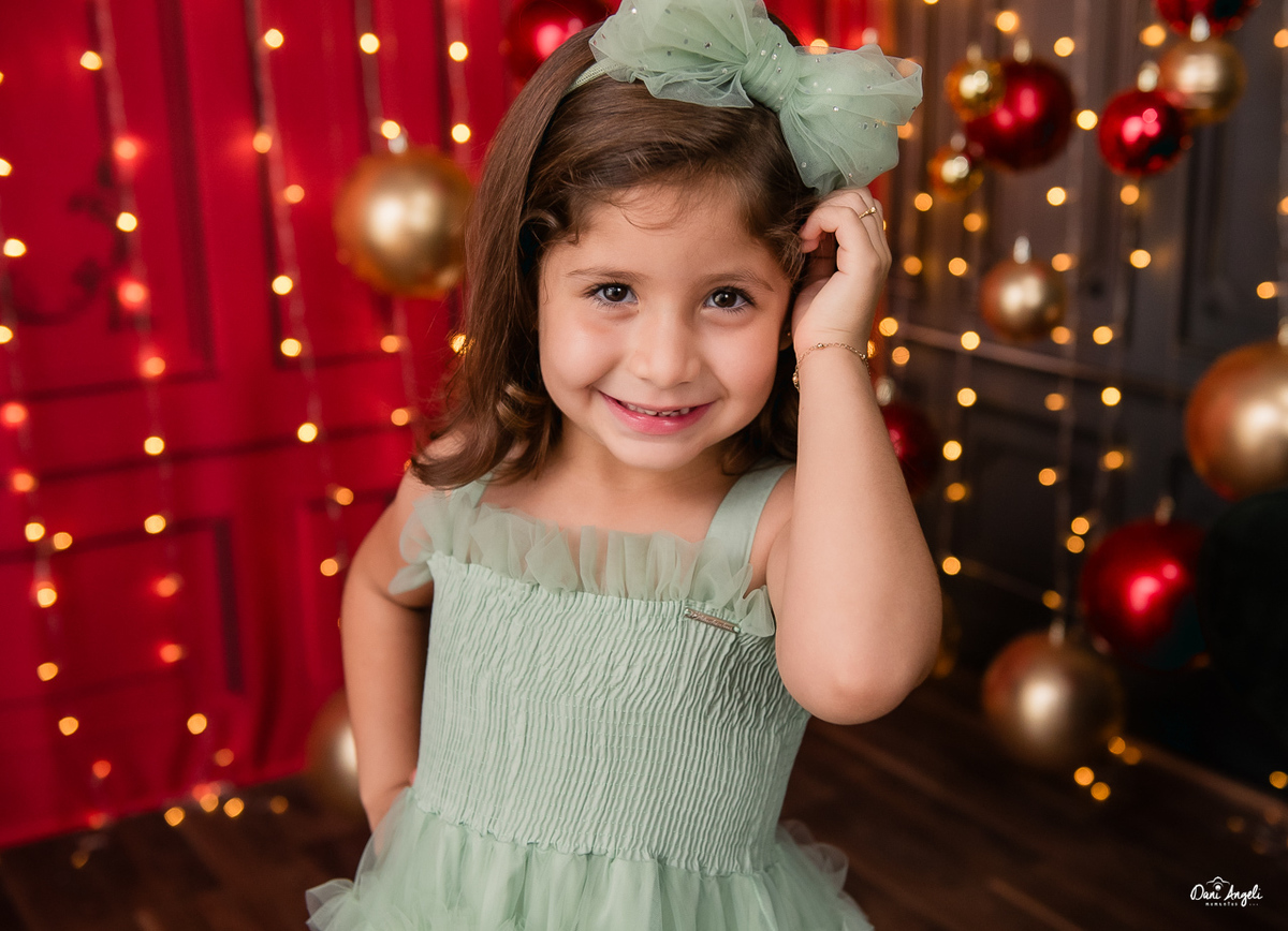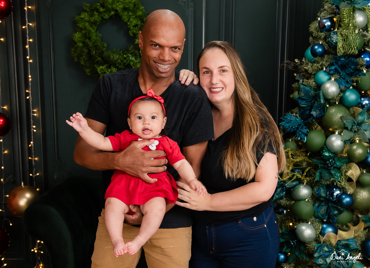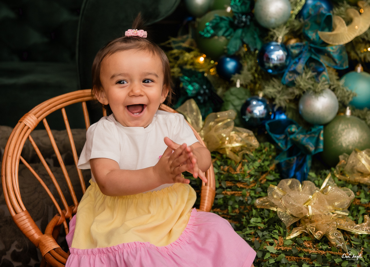 Nós preparamos tudo com muito carinho e cuidado, pensando em cada detalhe para que as suas fotos ficassem perfeitas. O cenário tem uma árvore de Natal iluminada, uma poltrona verde. Tudo para criar um clima natalino e mágico.