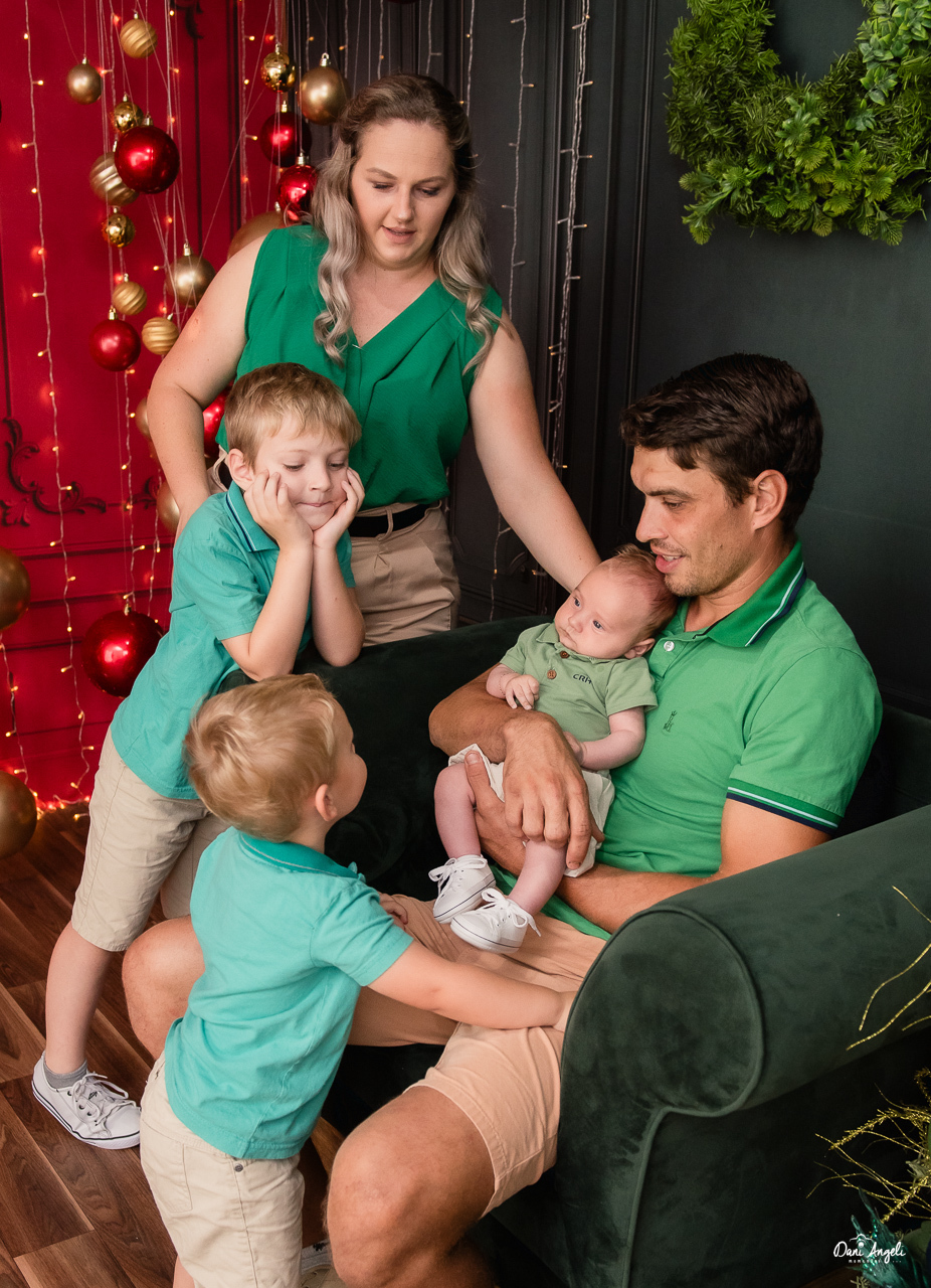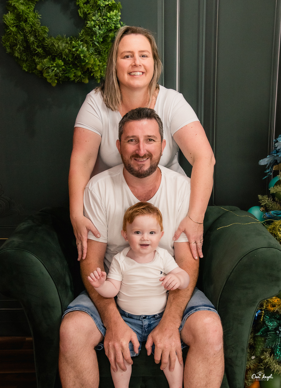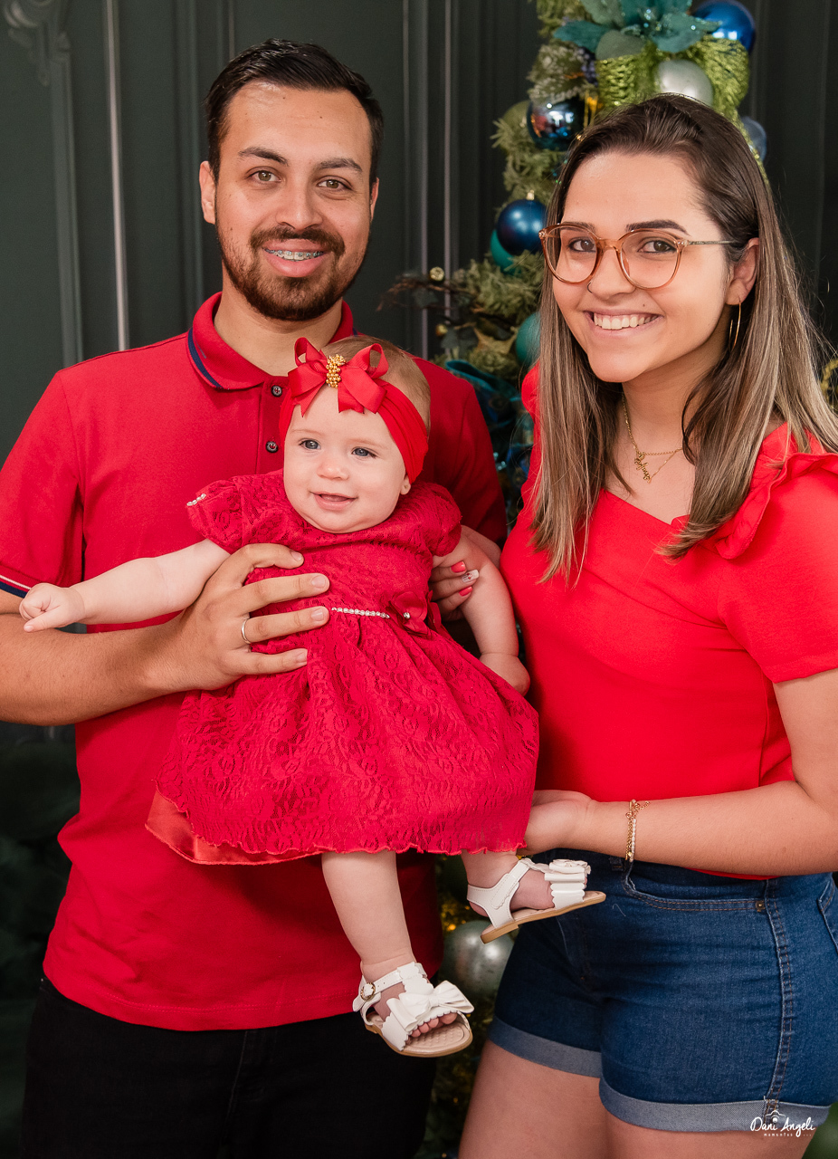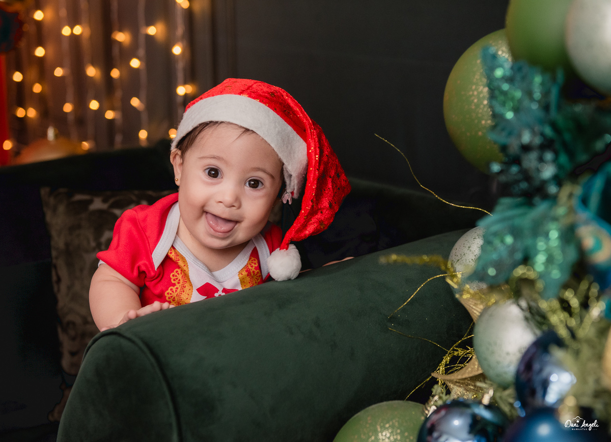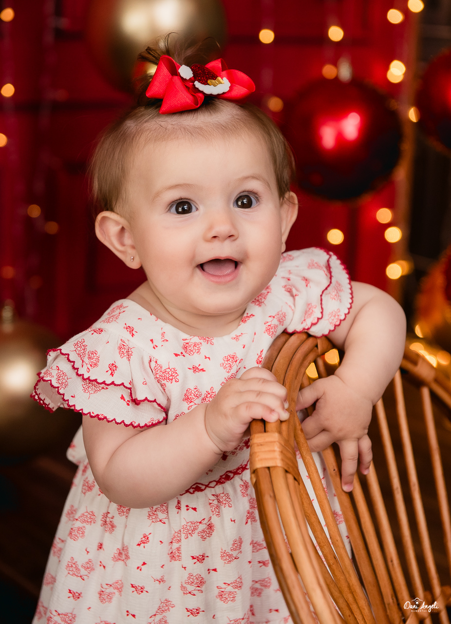 Nós preparamos tudo com muito carinho e cuidado, pensando em cada detalhe para que as suas fotos ficassem perfeitas. O cenário tem uma árvore de Natal iluminada, uma poltrona verde. Tudo para criar um clima natalino e mágico.