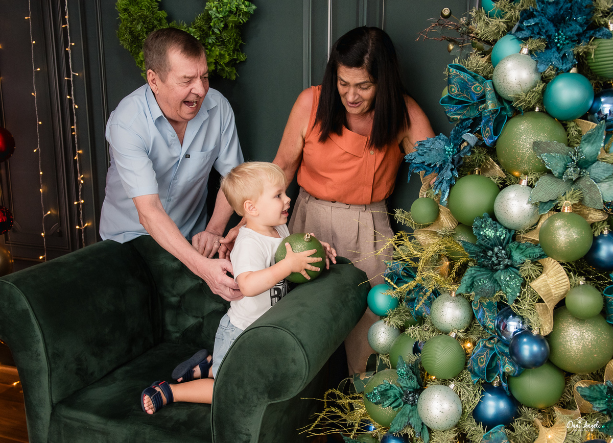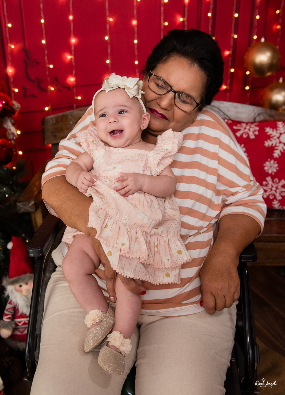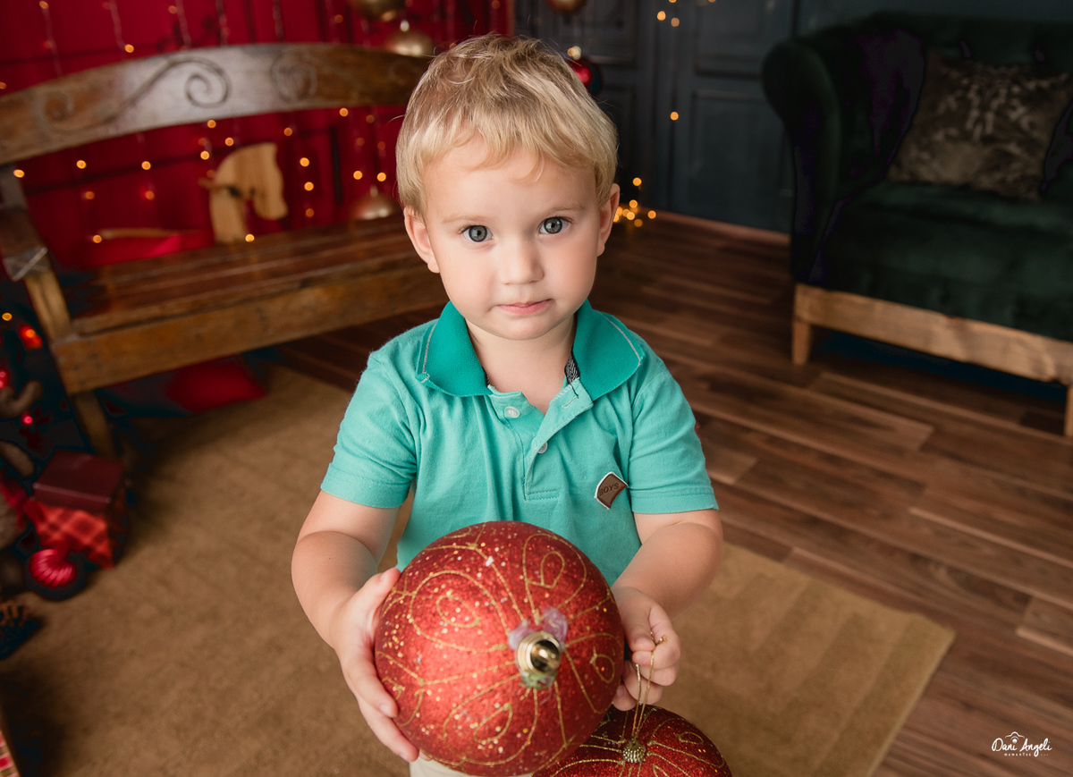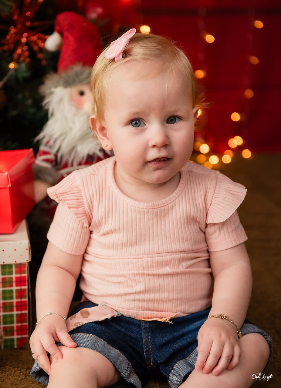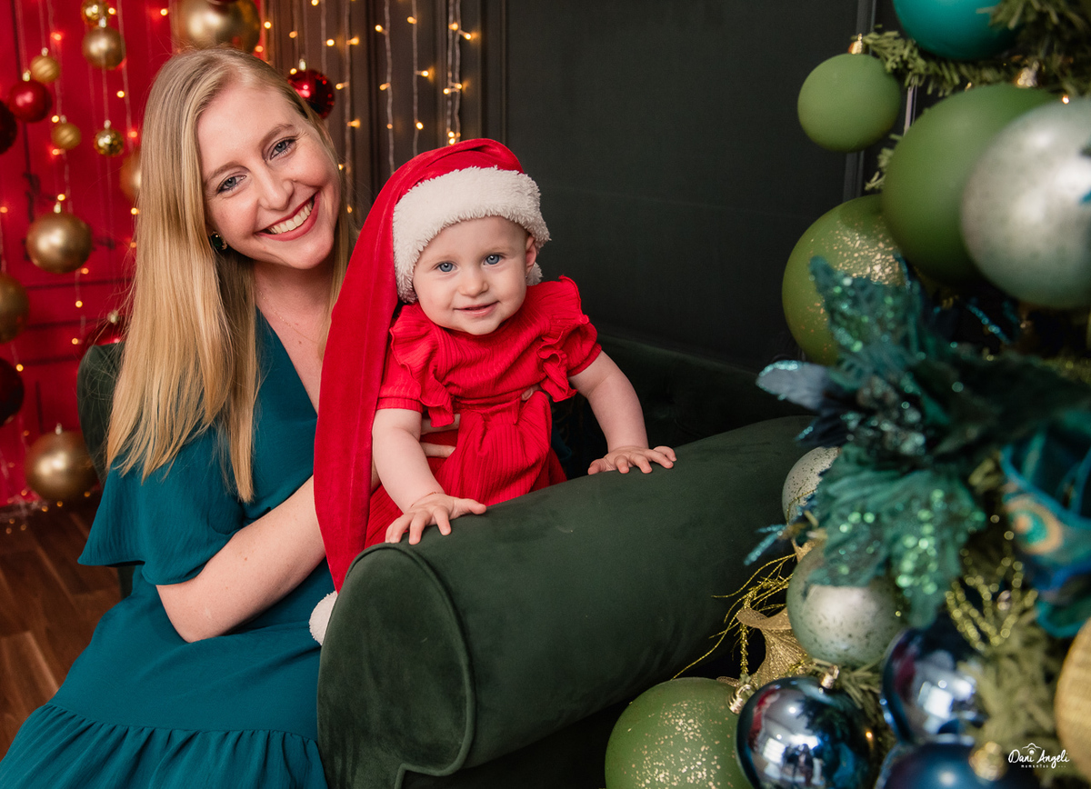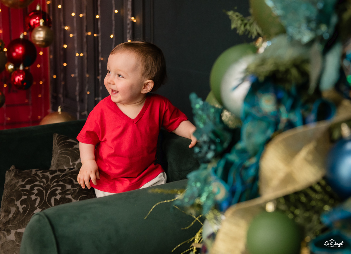 Nós preparamos tudo com muito carinho e cuidado, pensando em cada detalhe para que as suas fotos ficassem perfeitas. O cenário tem uma árvore de Natal iluminada, uma poltrona verde. Tudo para criar um clima natalino e mágico.