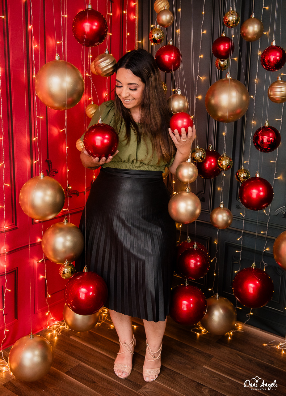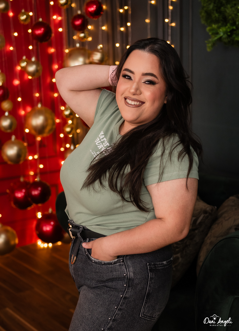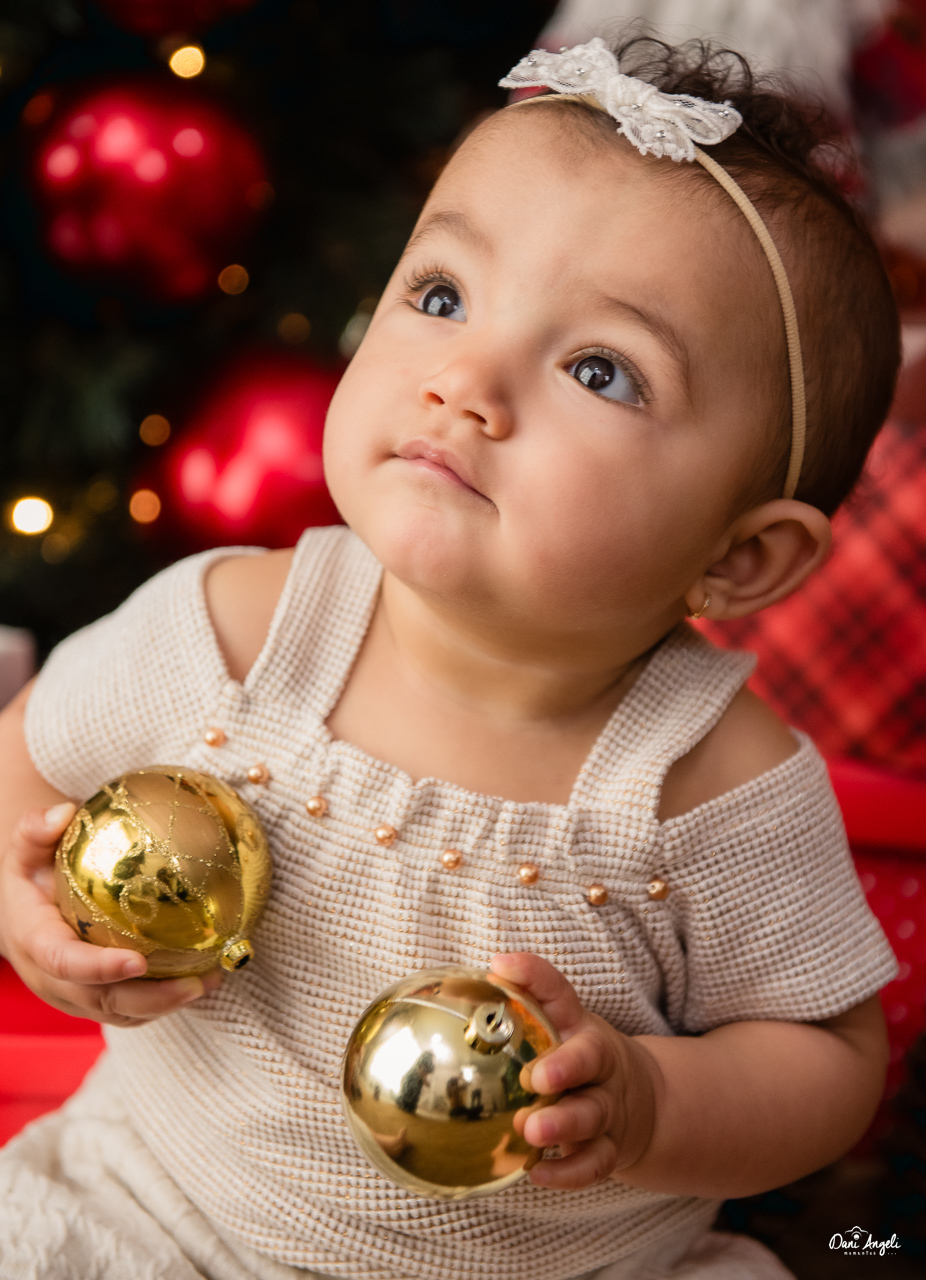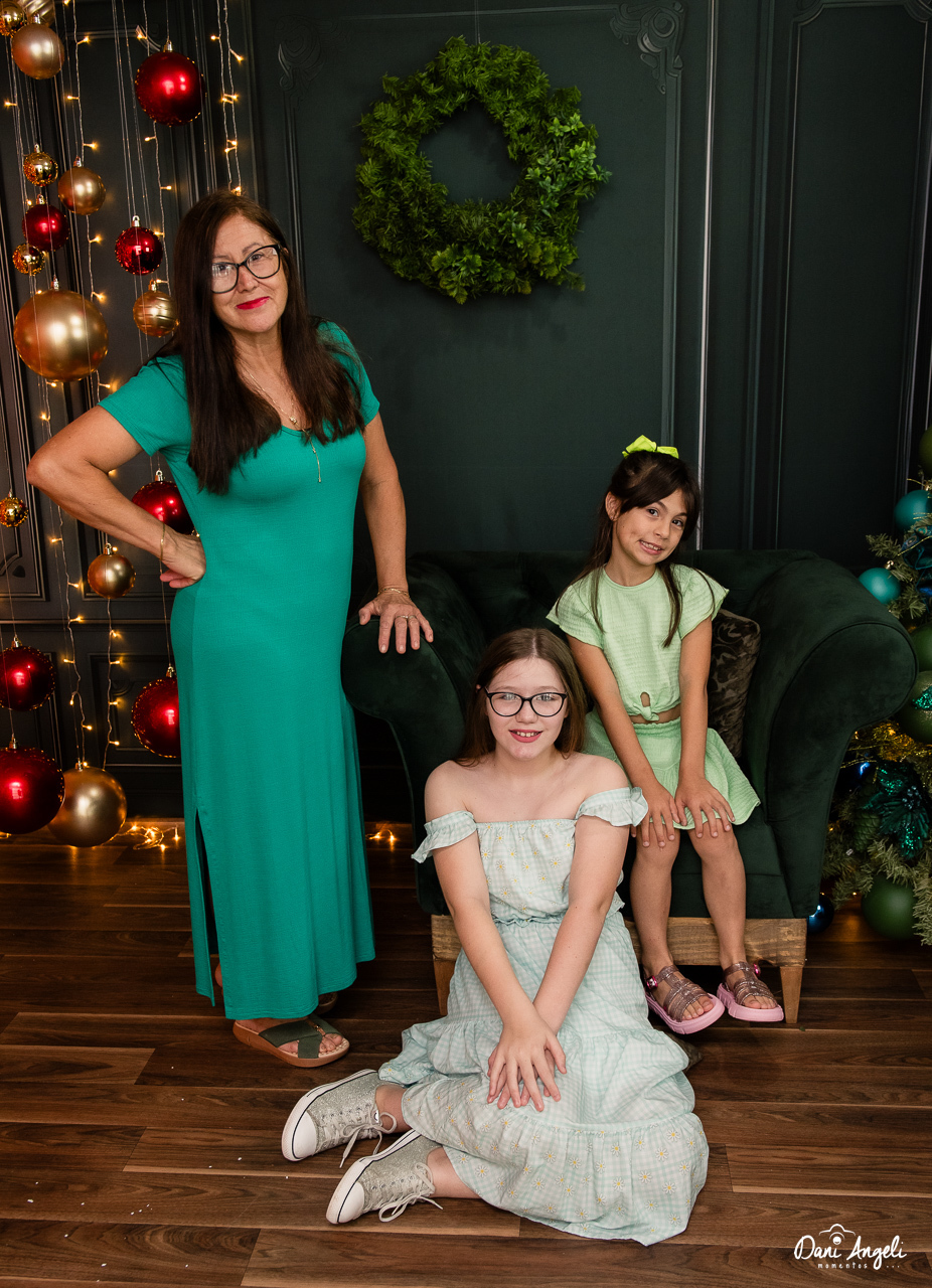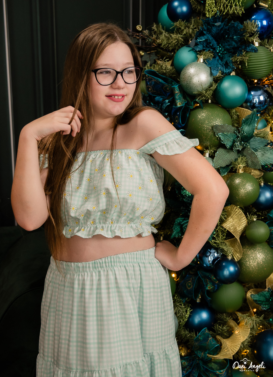 Nós preparamos tudo com muito carinho e cuidado, pensando em cada detalhe para que as suas fotos ficassem perfeitas. O cenário tem uma árvore de Natal iluminada, uma poltrona verde. Tudo para criar um clima natalino e mágico.