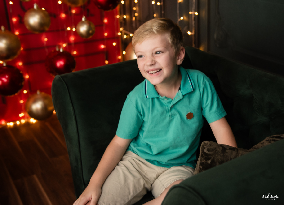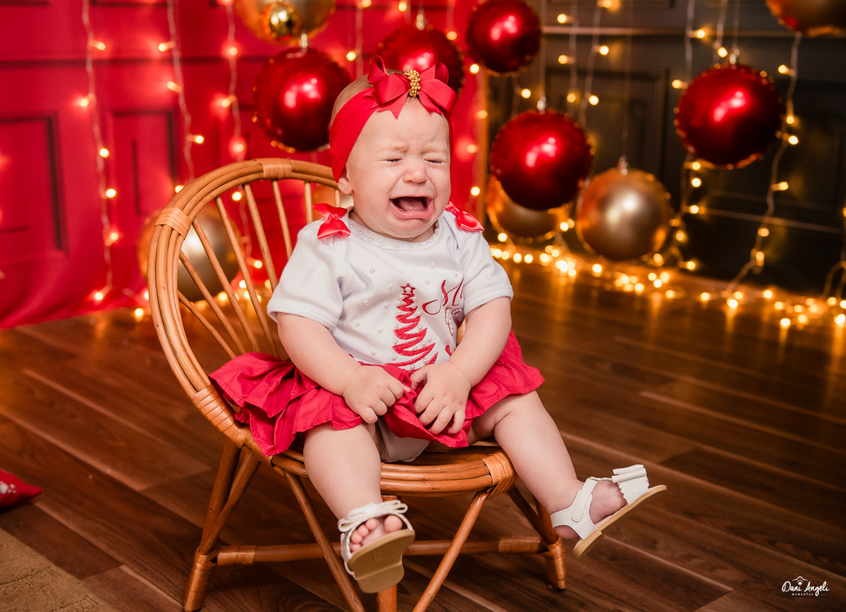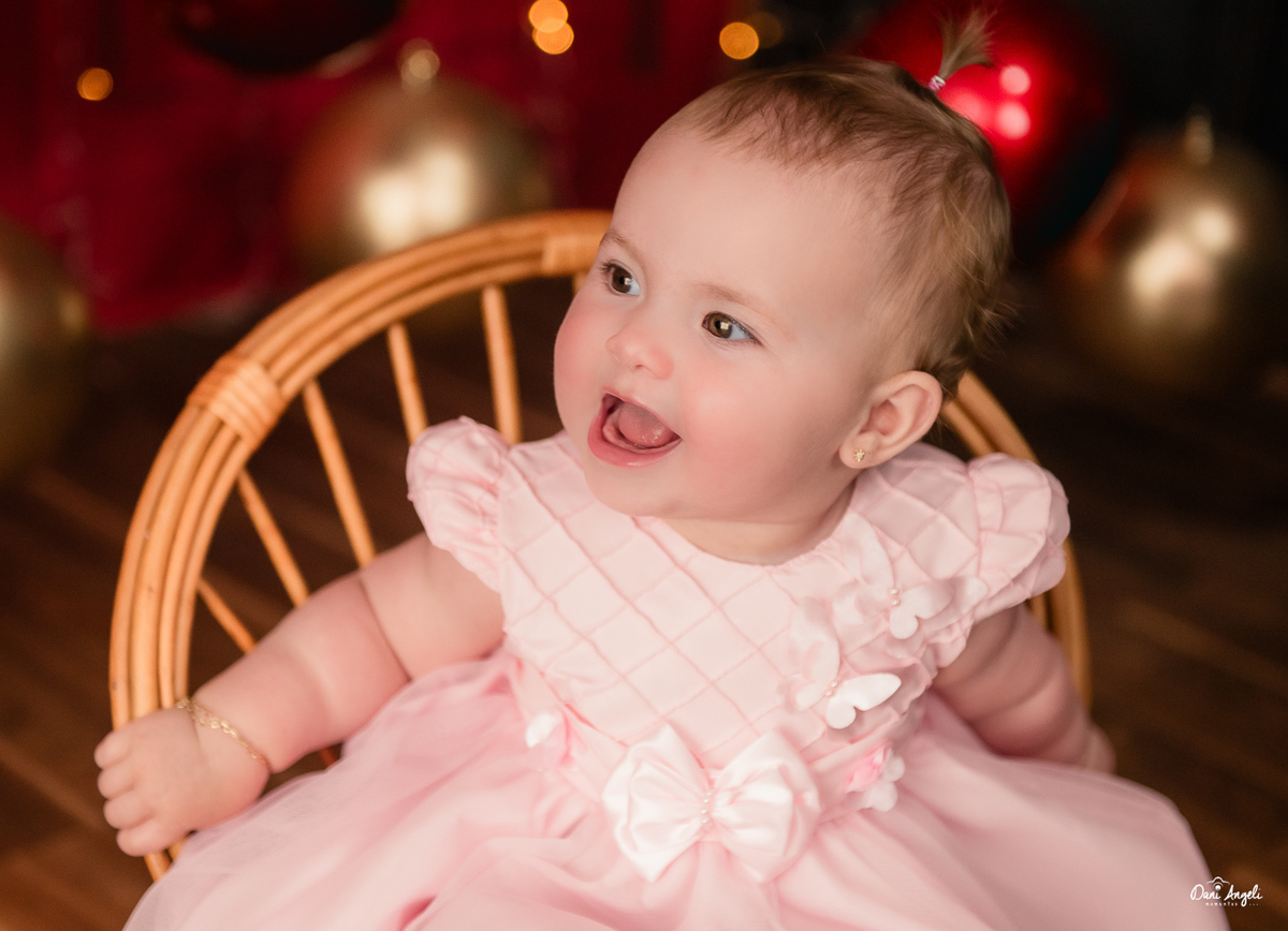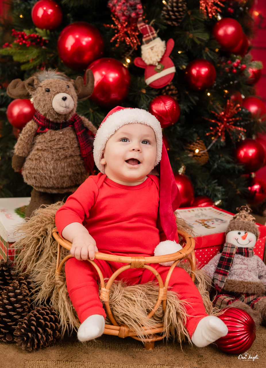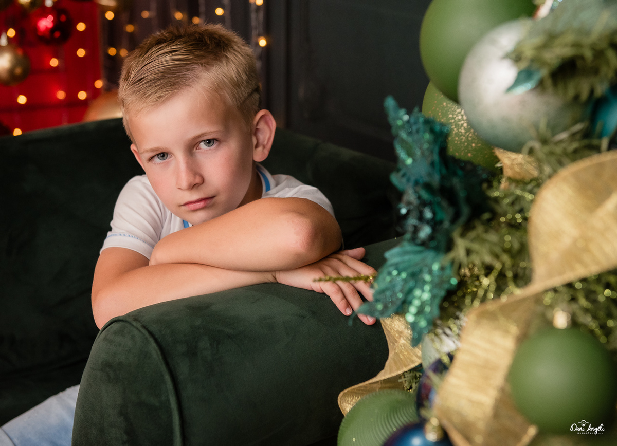 Nós preparamos tudo com muito carinho e cuidado, pensando em cada detalhe para que as suas fotos ficassem perfeitas. O cenário tem uma árvore de Natal iluminada, uma poltrona verde. Tudo para criar um clima natalino e mágico.