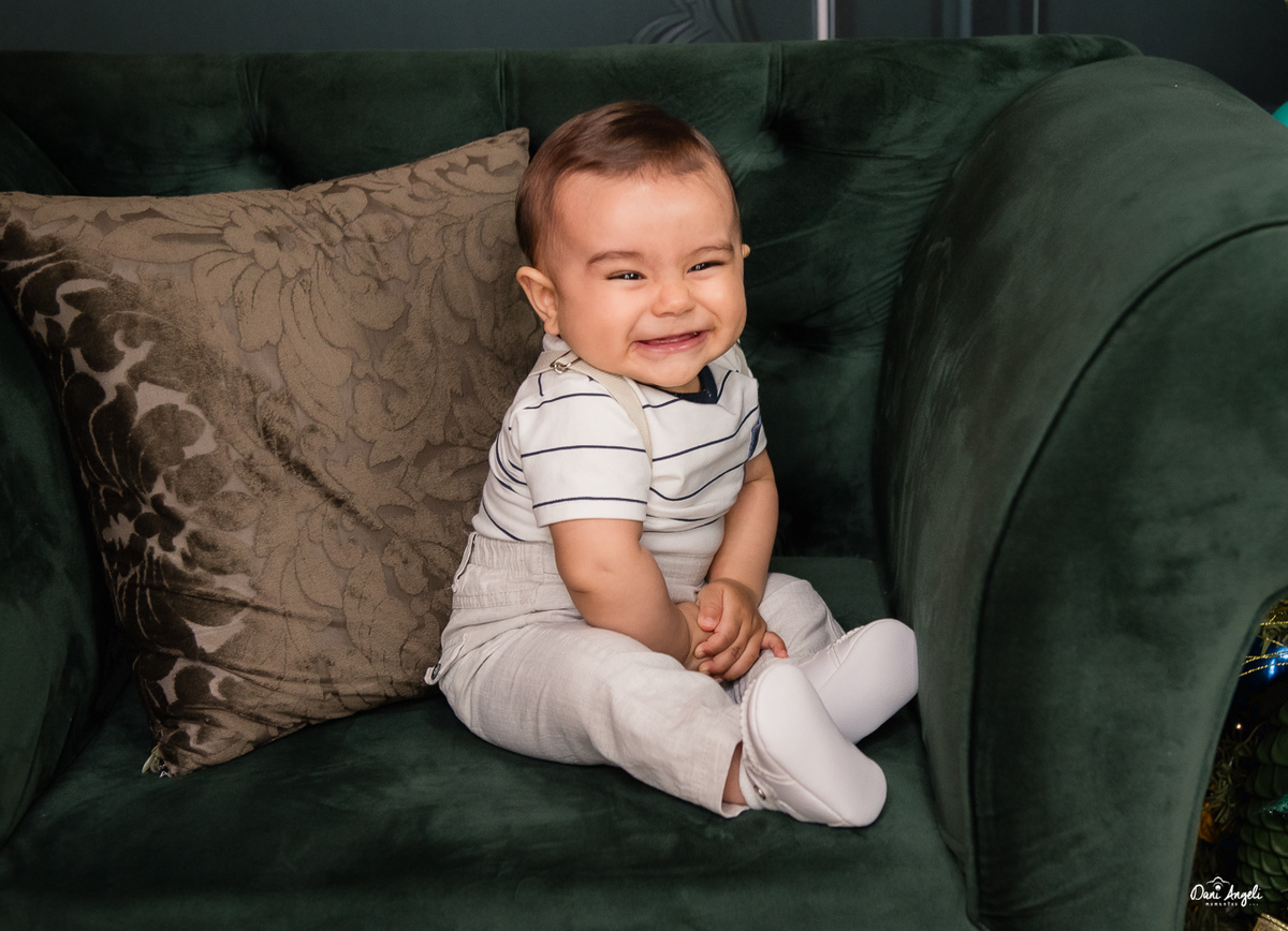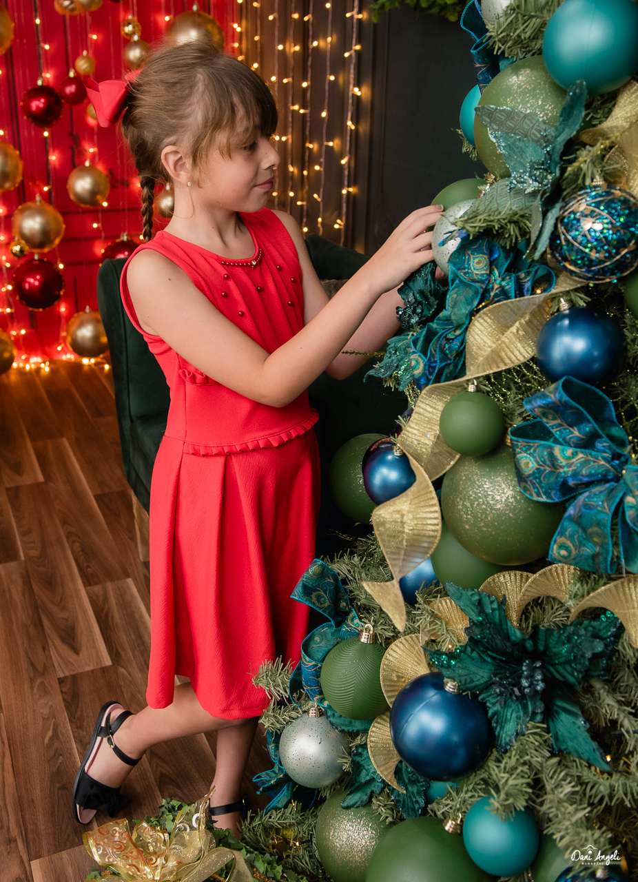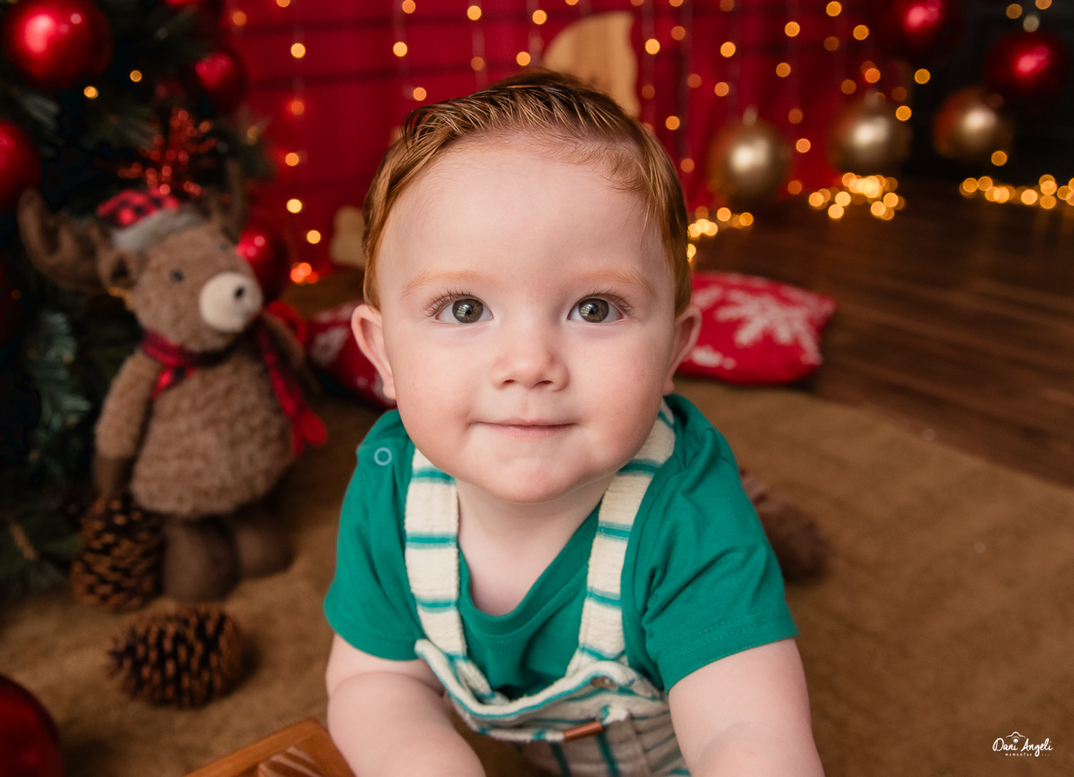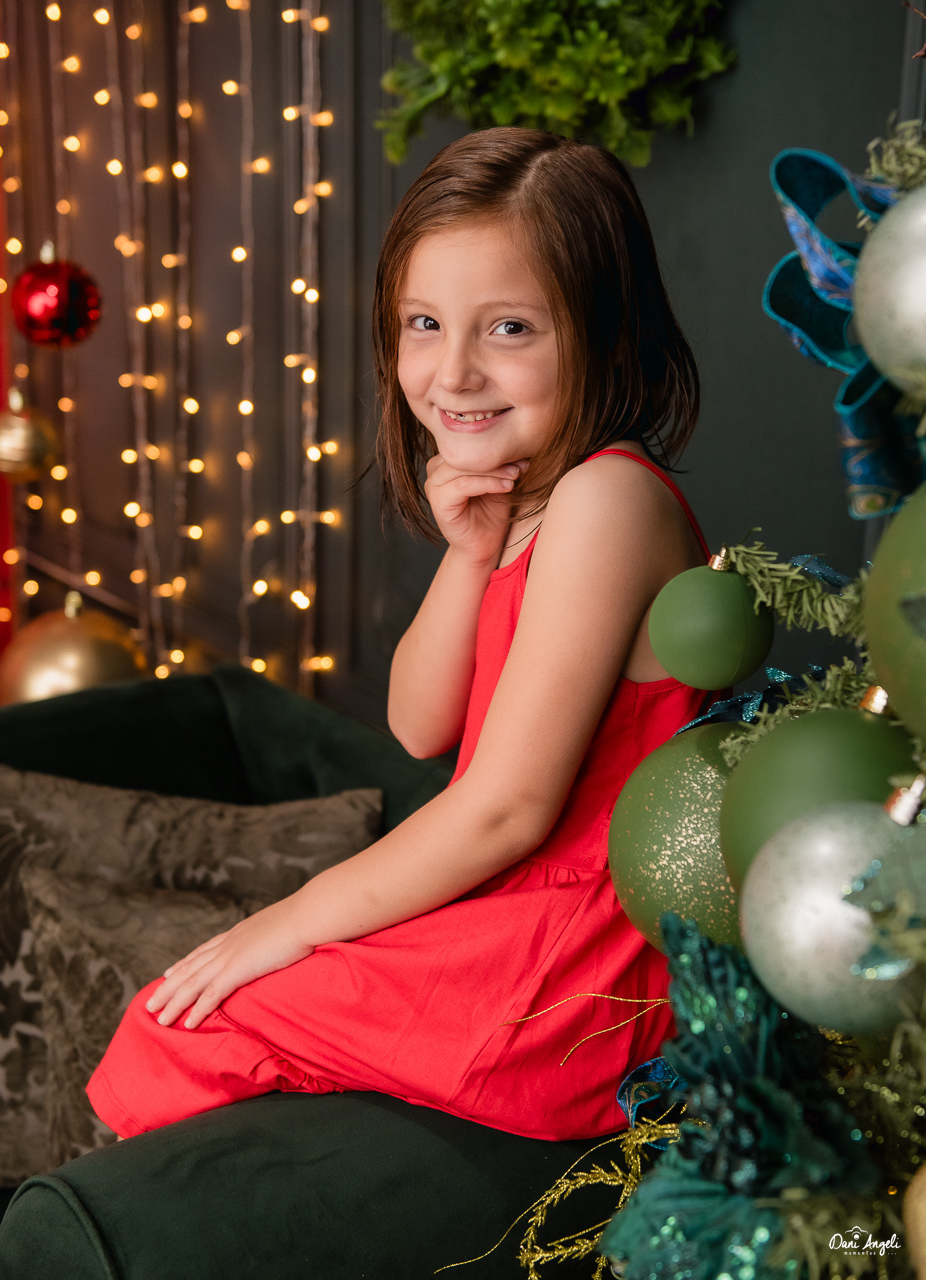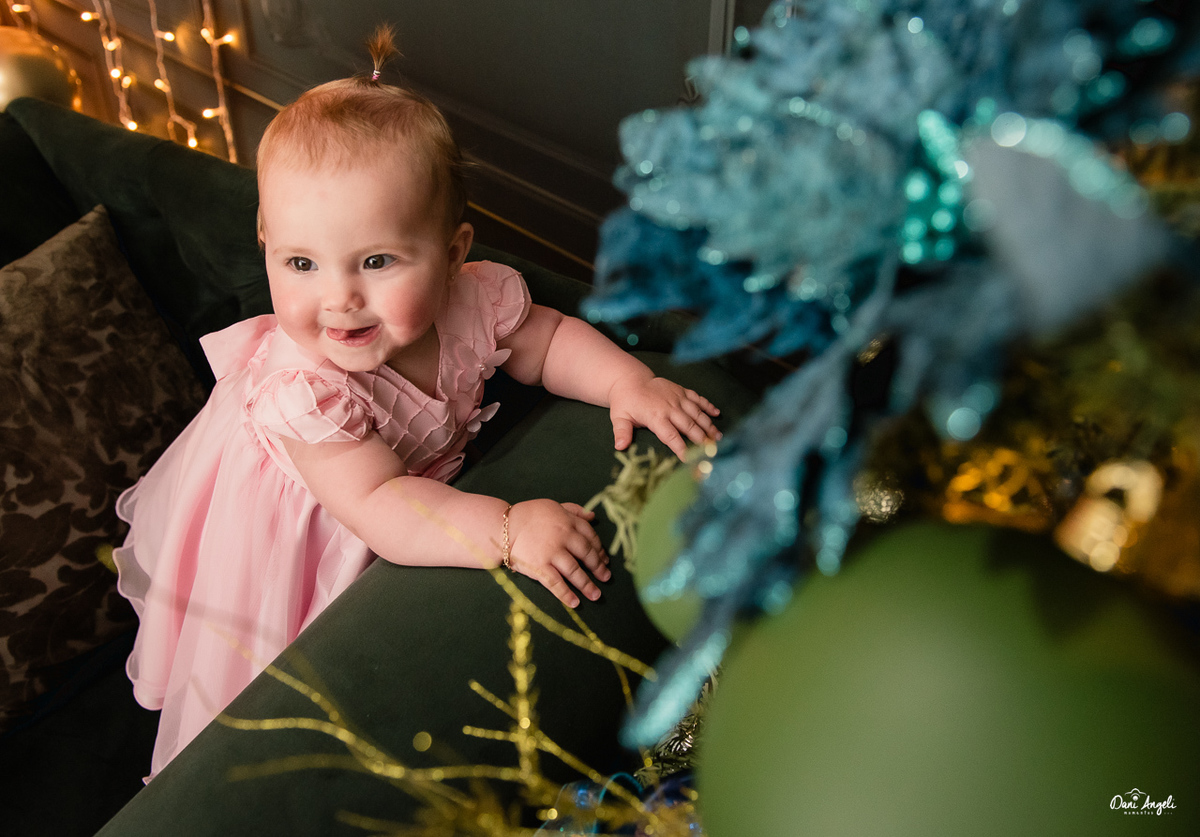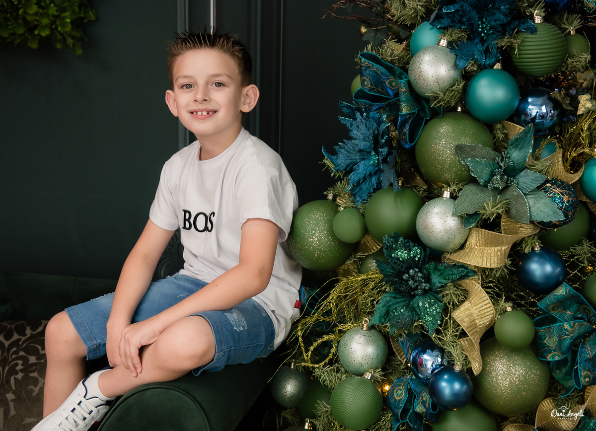 Nós preparamos tudo com muito carinho e cuidado, pensando em cada detalhe para que as suas fotos ficassem perfeitas. O cenário tem uma árvore de Natal iluminada, uma poltrona verde. Tudo para criar um clima natalino e mágico.