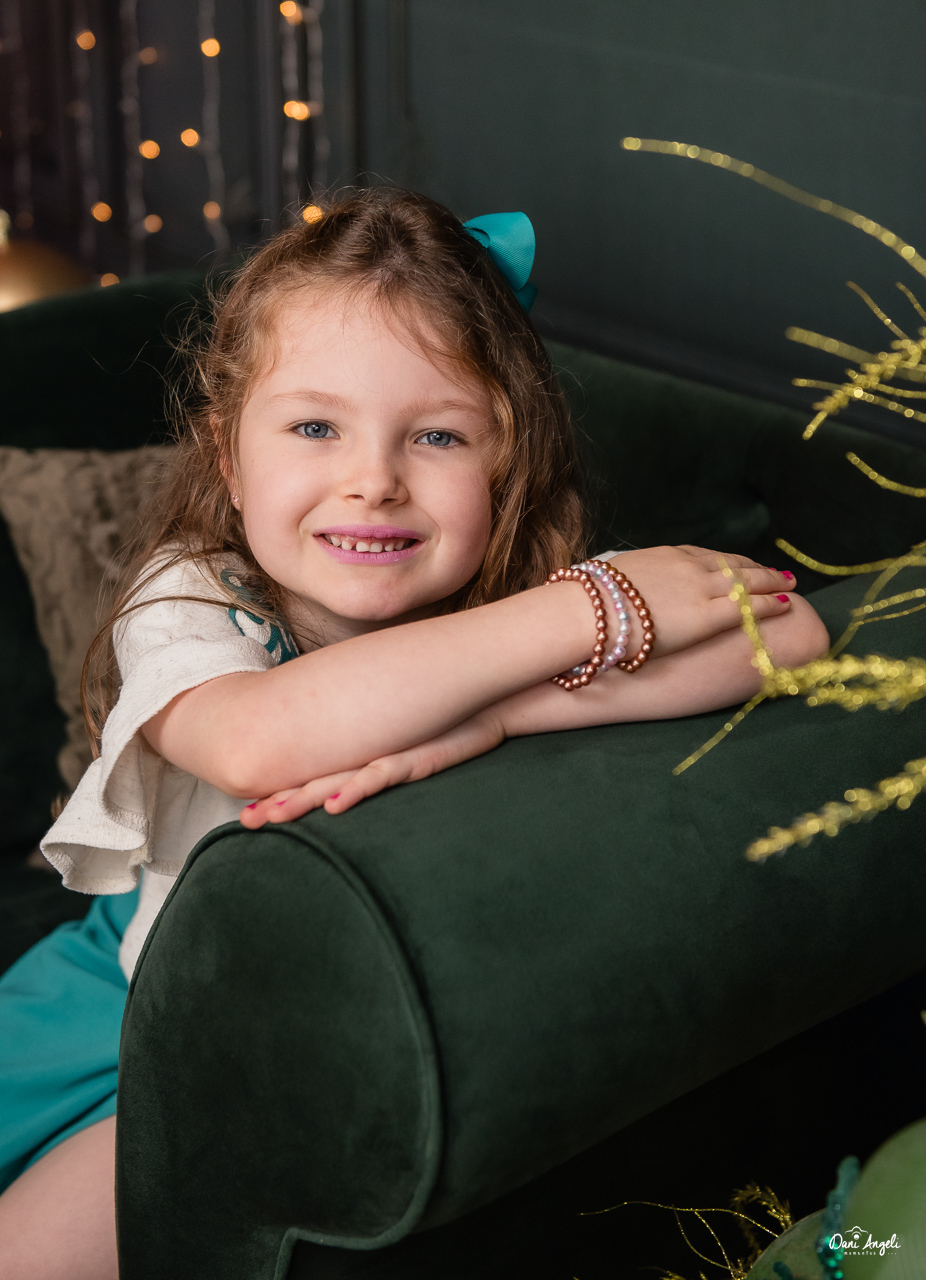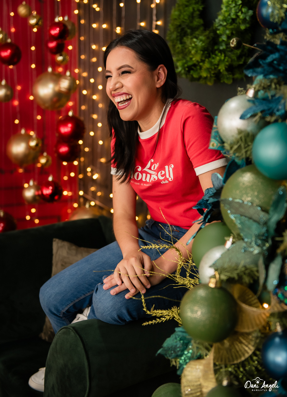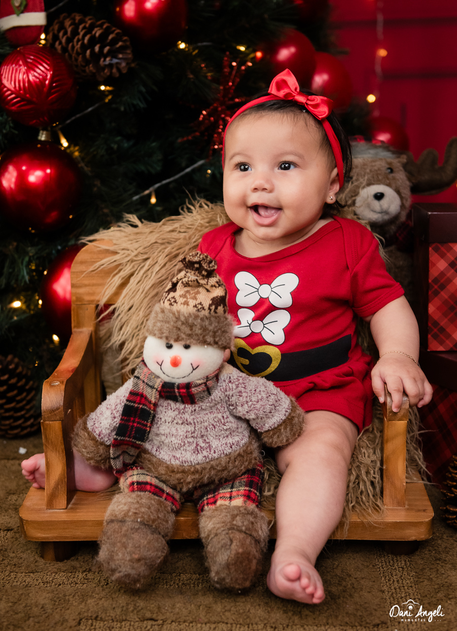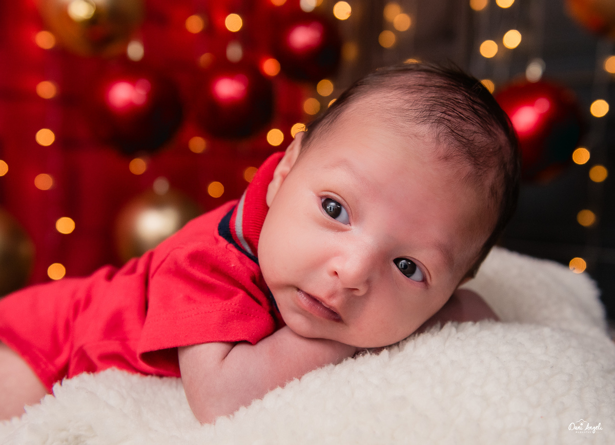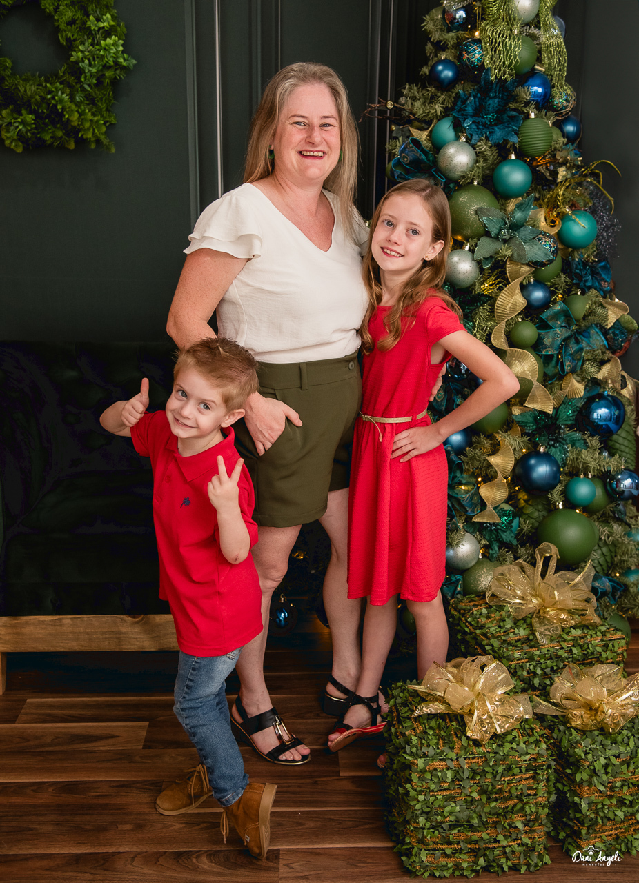 Nós preparamos tudo com muito carinho e cuidado, pensando em cada detalhe para que as suas fotos ficassem perfeitas. O cenário tem uma árvore de Natal iluminada, uma poltrona verde. Tudo para criar um clima natalino e mágico.