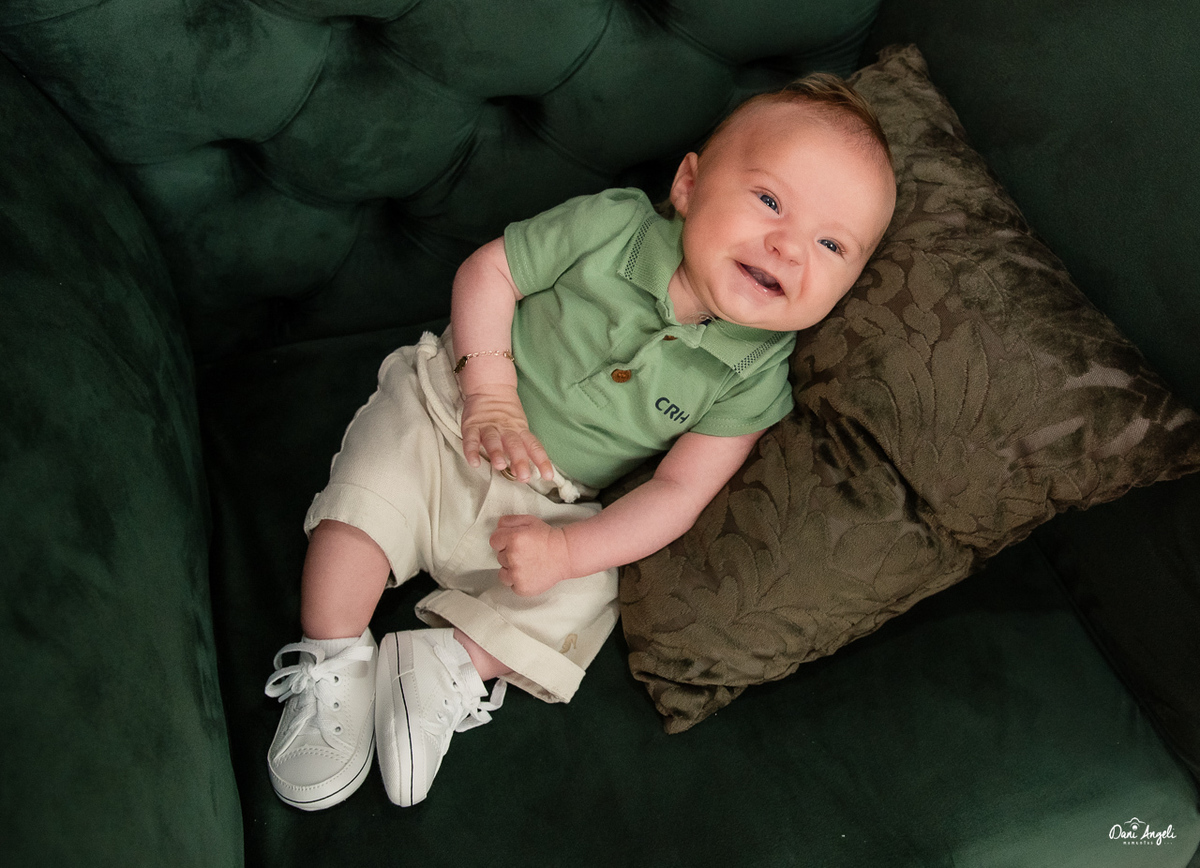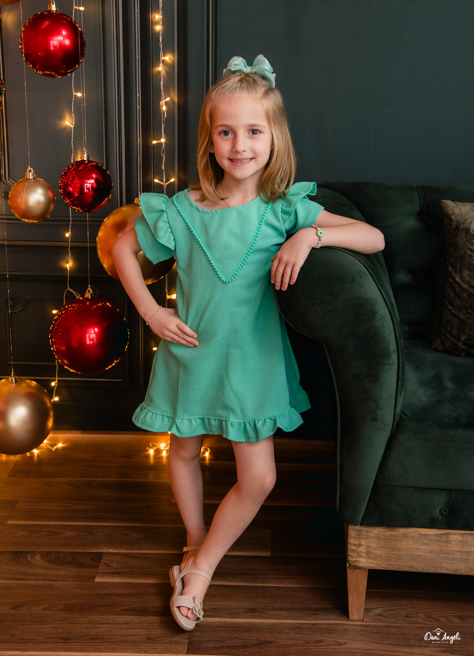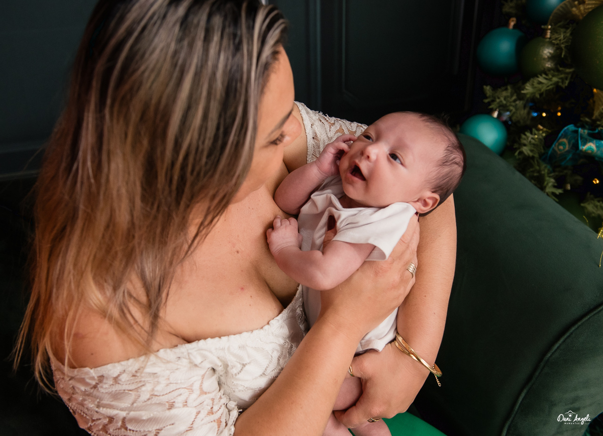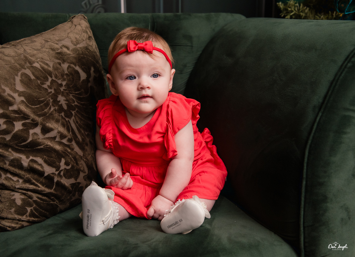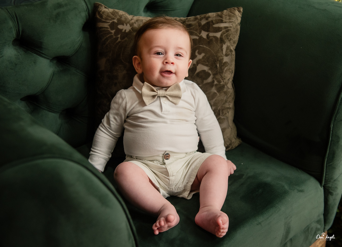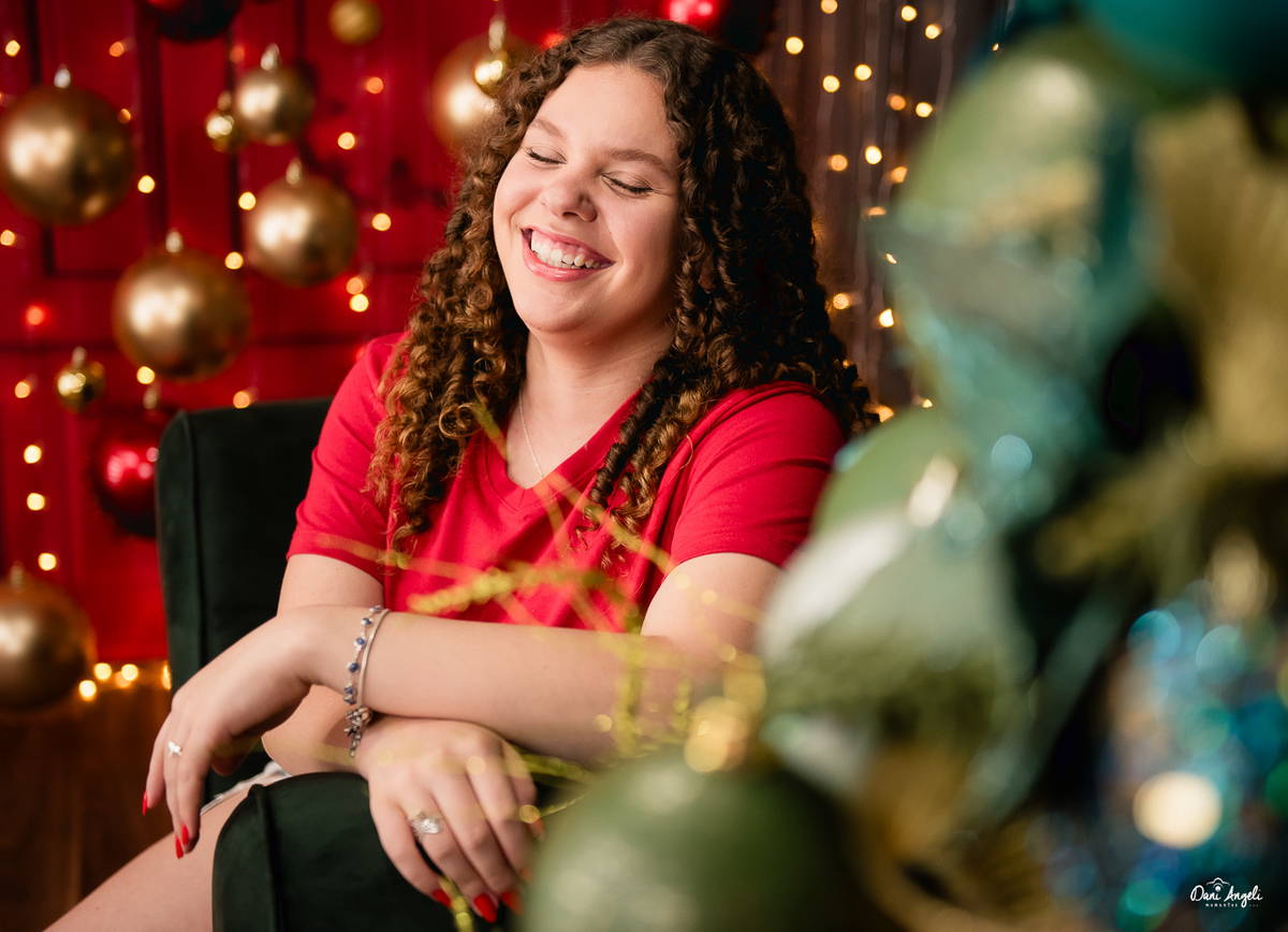 Nós preparamos tudo com muito carinho e cuidado, pensando em cada detalhe para que as suas fotos ficassem perfeitas. O cenário tem uma árvore de Natal iluminada, uma poltrona verde. Tudo para criar um clima natalino e mágico.
