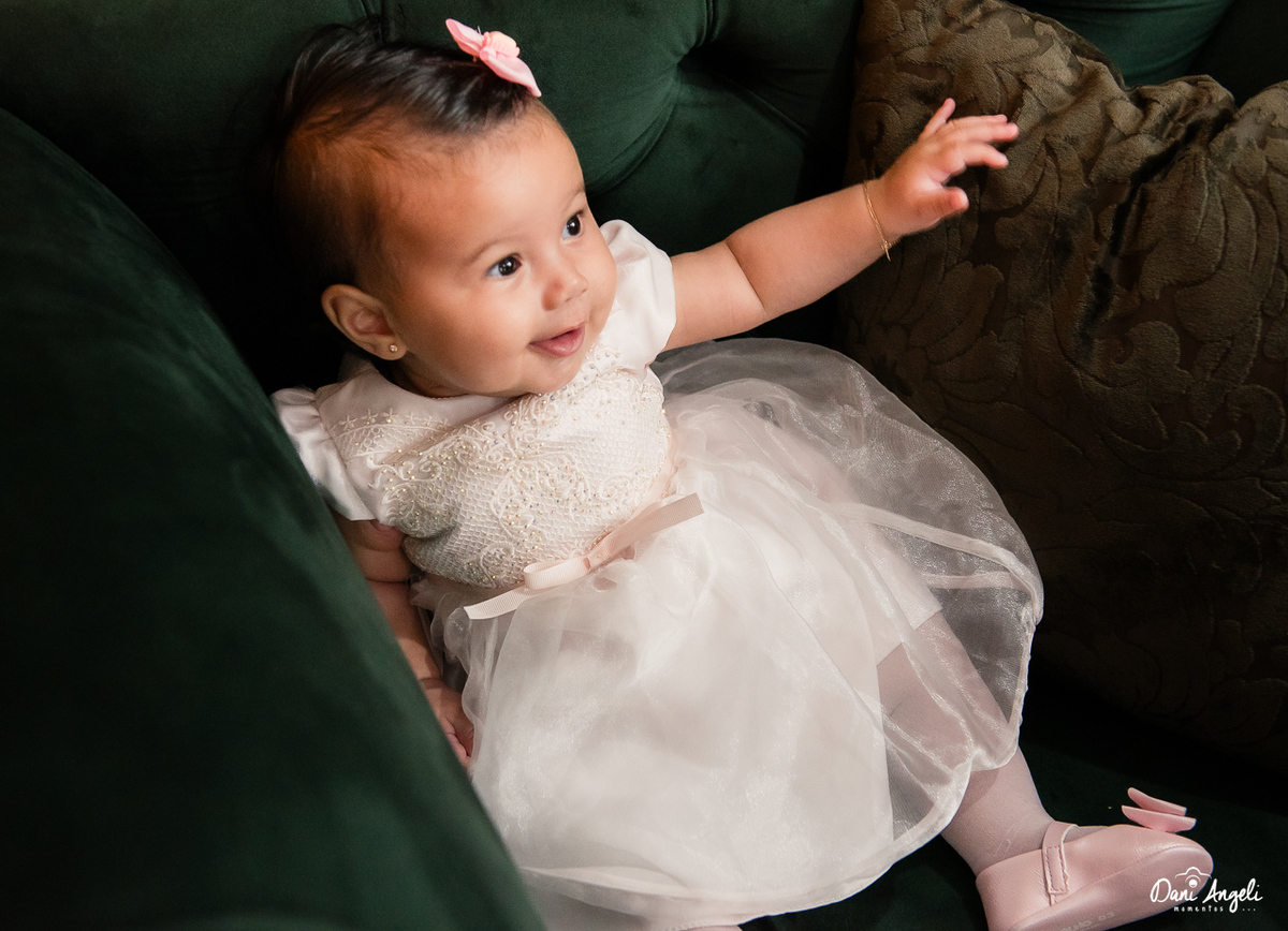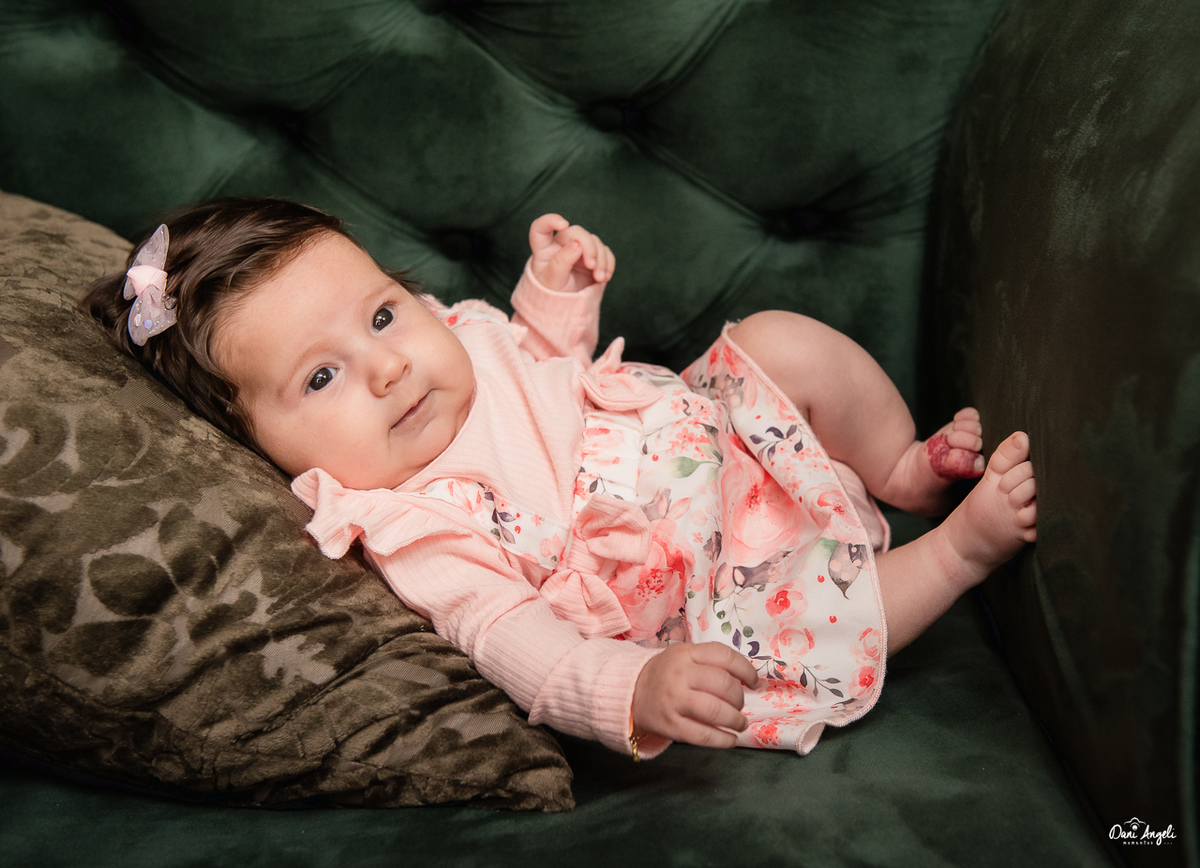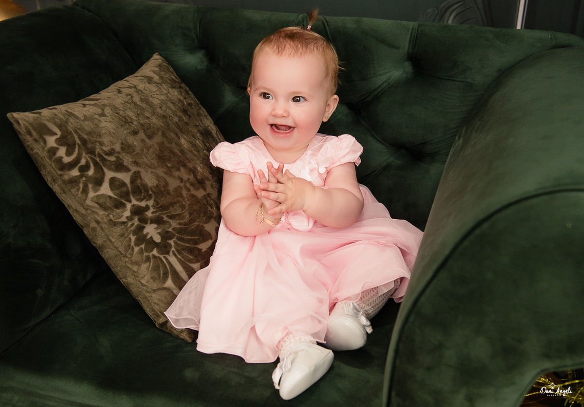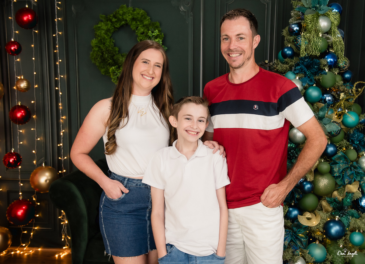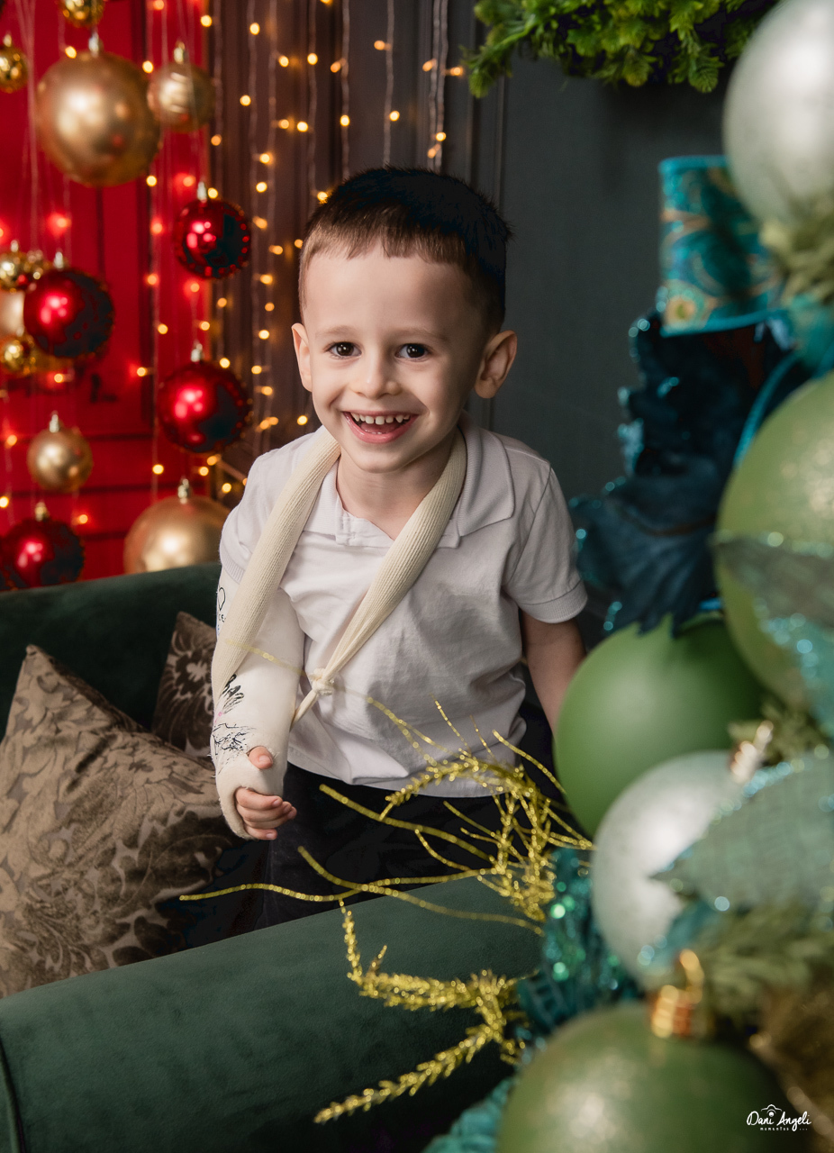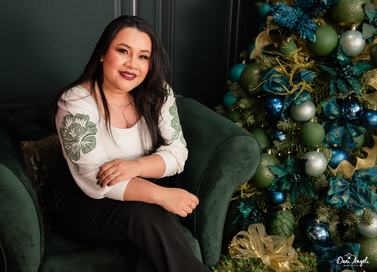 Nós preparamos tudo com muito carinho e cuidado, pensando em cada detalhe para que as suas fotos ficassem perfeitas. O cenário tem uma árvore de Natal iluminada, uma poltrona verde. Tudo para criar um clima natalino e mágico.