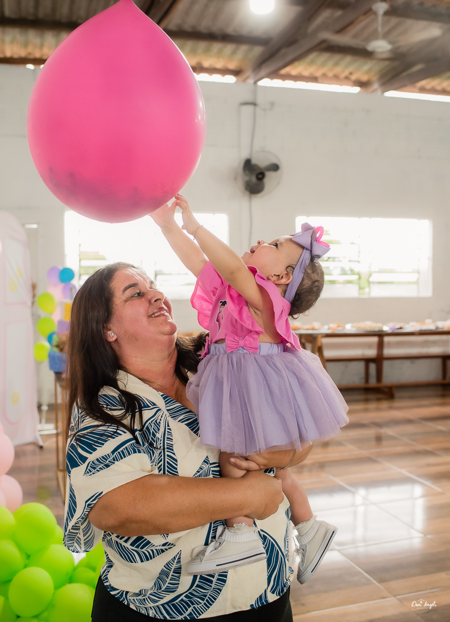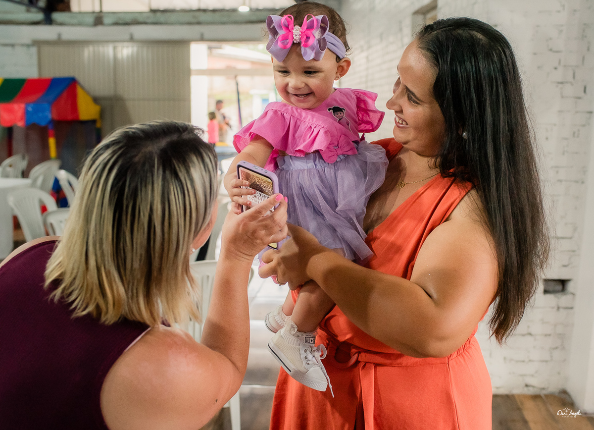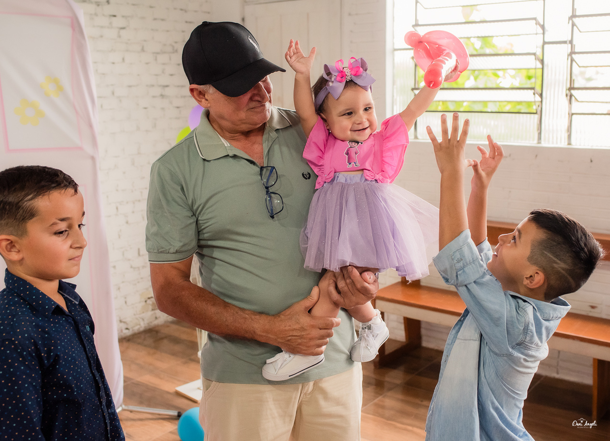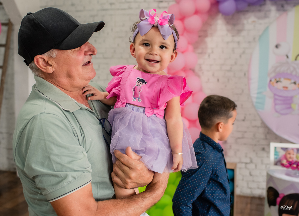 A Laura estava radiante, aproveitando cada momento da festa e distribuindo sorrisos por onde passava. Sua energia contagiante a levou de colo em colo para as fotos, capturando momentos preciosos que serão guardados para sempre.