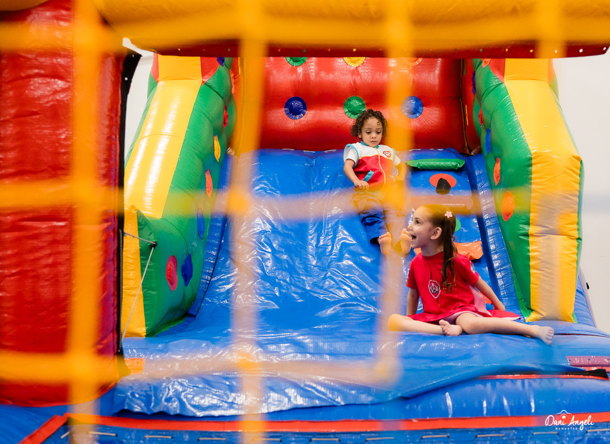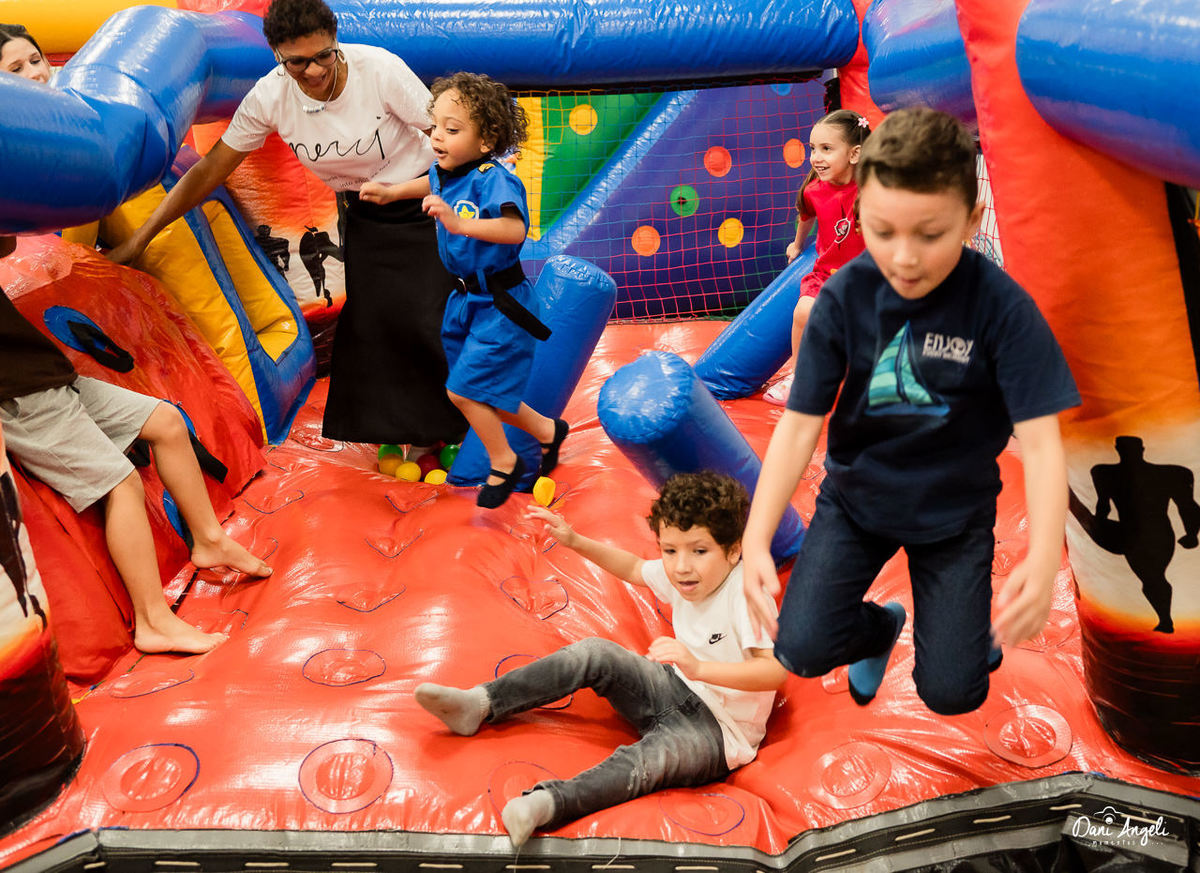 correu, brincou, fez fotos, se jogou na diversão e ainda convidou os personagens para irem nos brinquedos infláveis (sim, tinham vários 😄). Energia, alegria e muita bagunça boa.