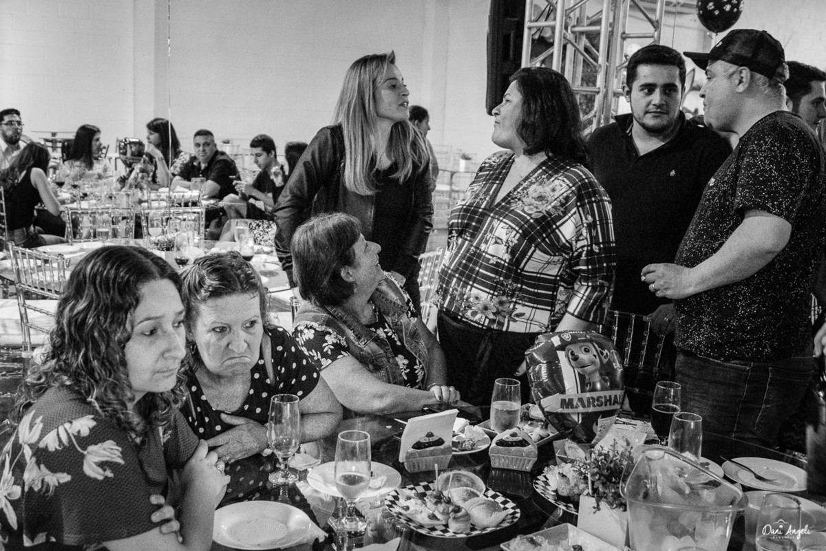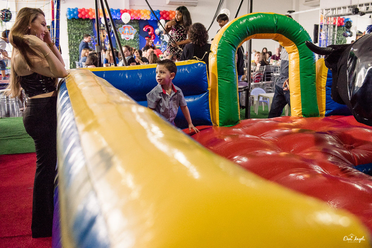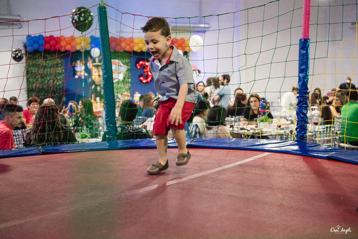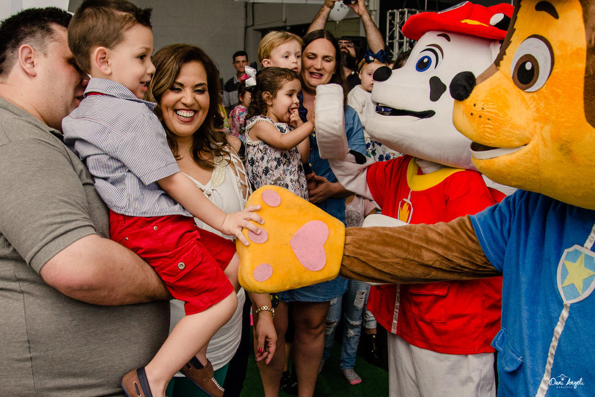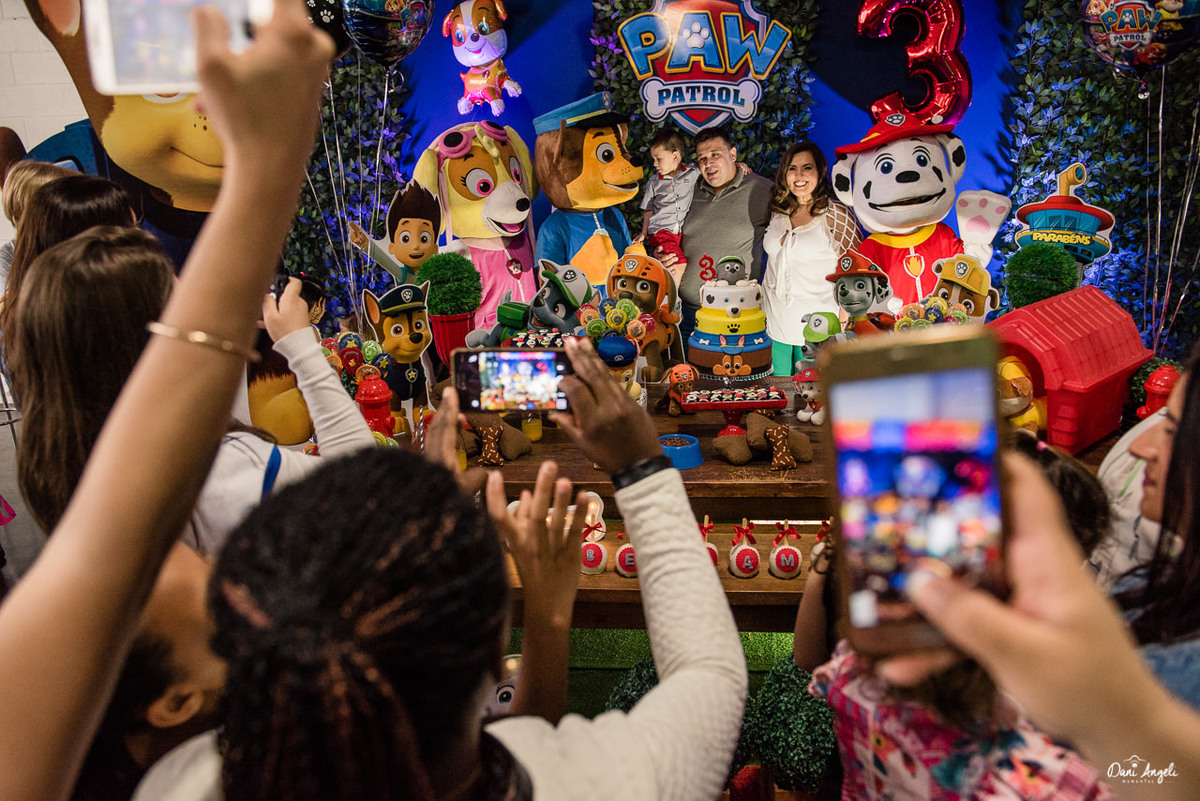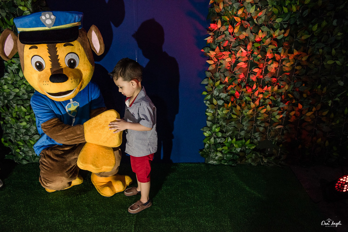 Melhor que a reação da entrada, foi a expressão de quando ele viu que não era só a festinha dos sonhos, mas todos os seus personagens preferidos foram convidados: Marshall, Chase e a Skye. A partir deste momento o Benjamim esqueceu de tudo, não desgrudou da turma da Patrulha Canina.
