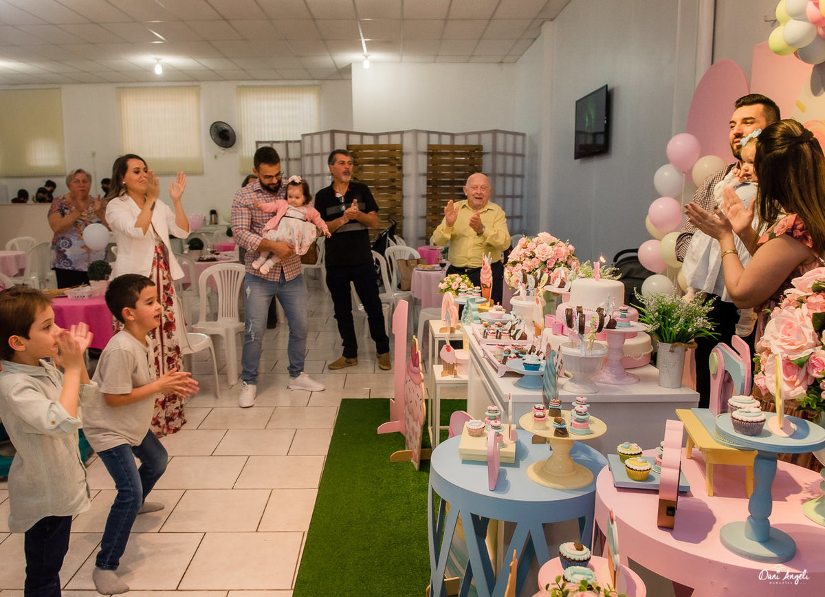 Na hora do parabéns a Beatriz não sorriu, tava curiosa na vela e nas pessoas todas cantando. Mesmo assim participou sem choro.