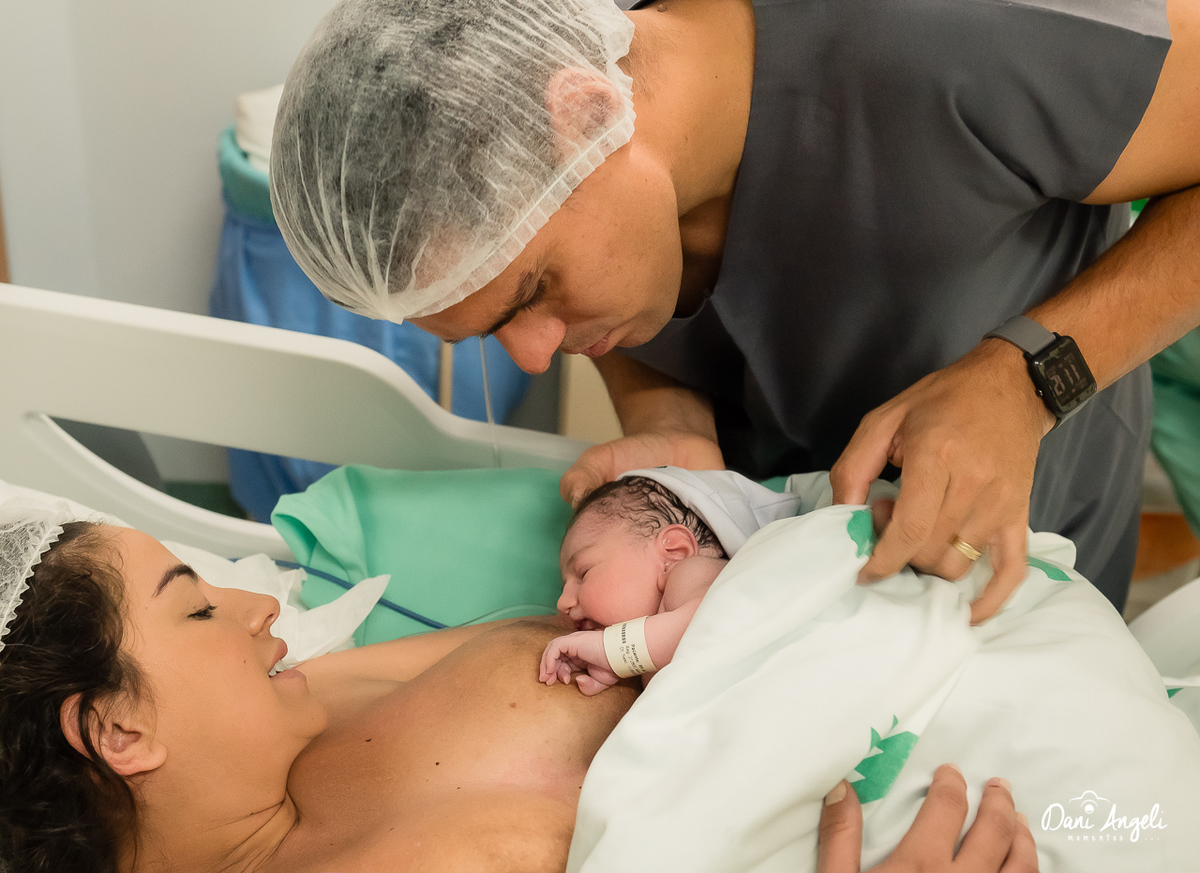 A ansiedade era visível, mas junto dela vinha uma alegria enorme. O Dudu estava impossível — até dancinha rolou na sala de preparação, hehehe. E, claro, ele fez questão de cortar o cordão umbilical, um gesto cheio de significado.