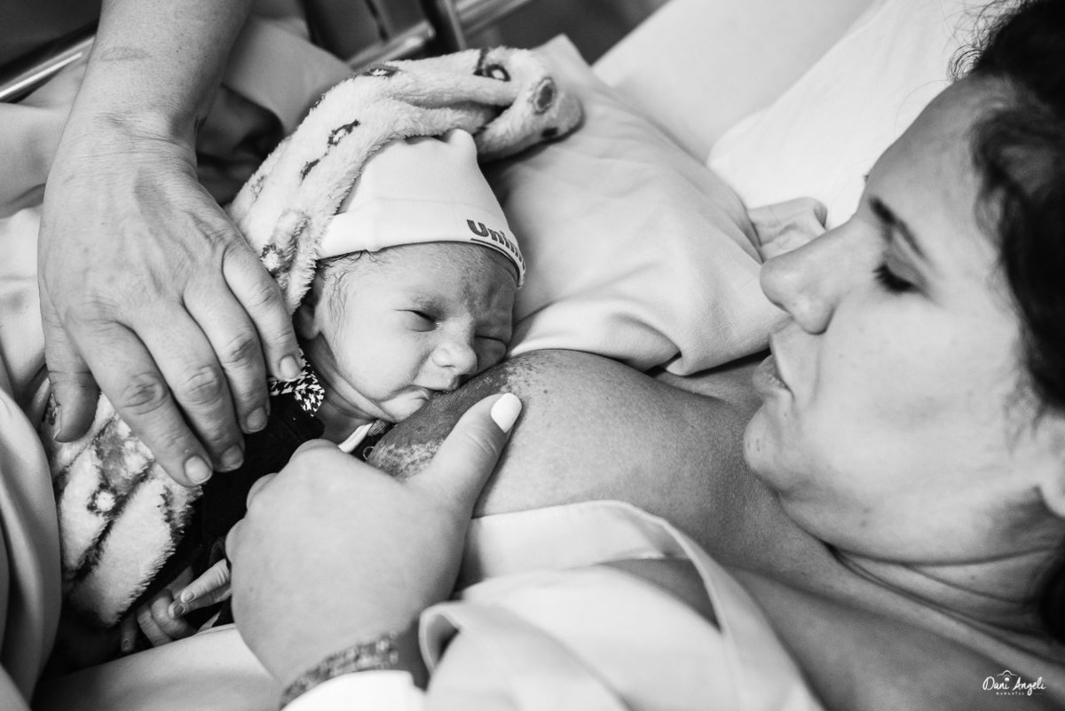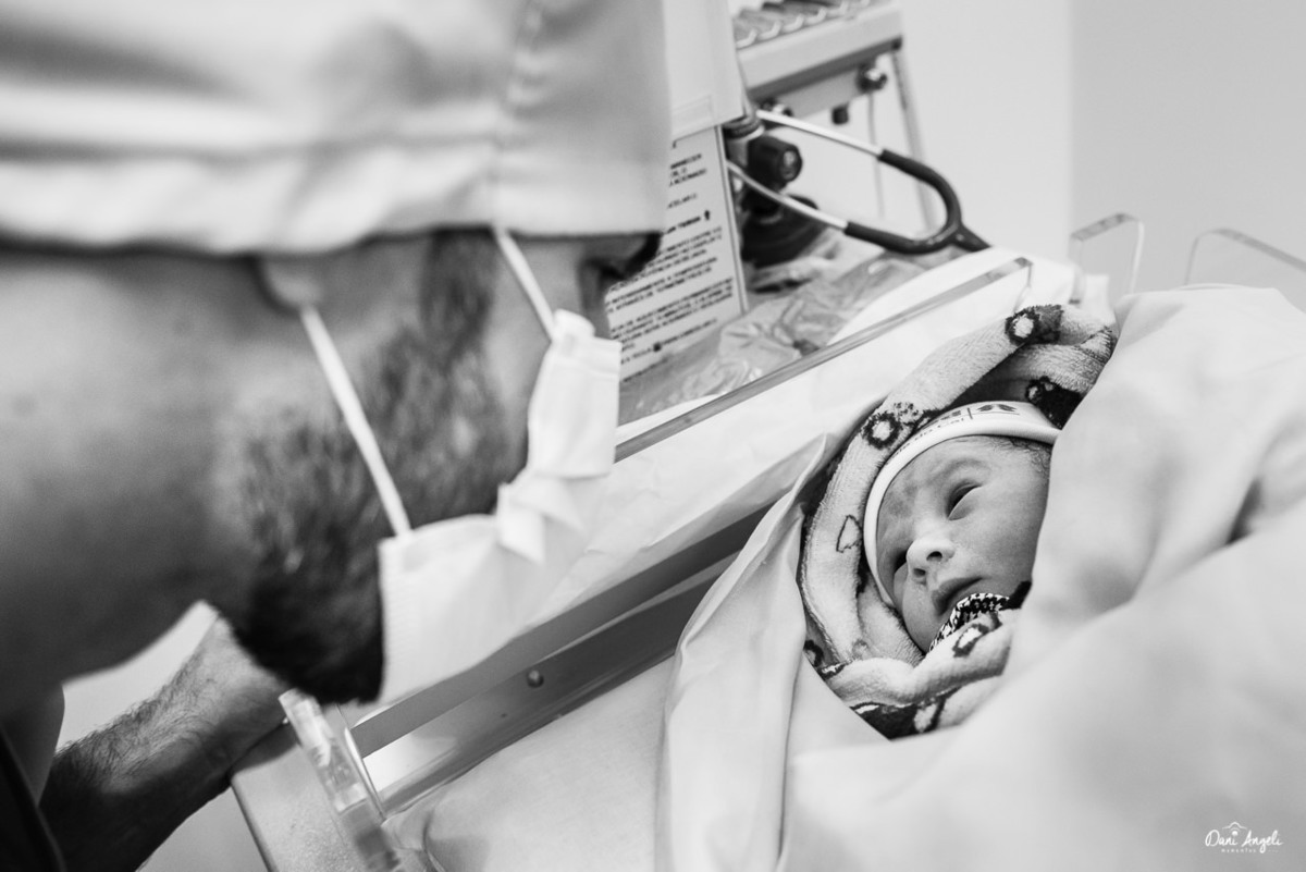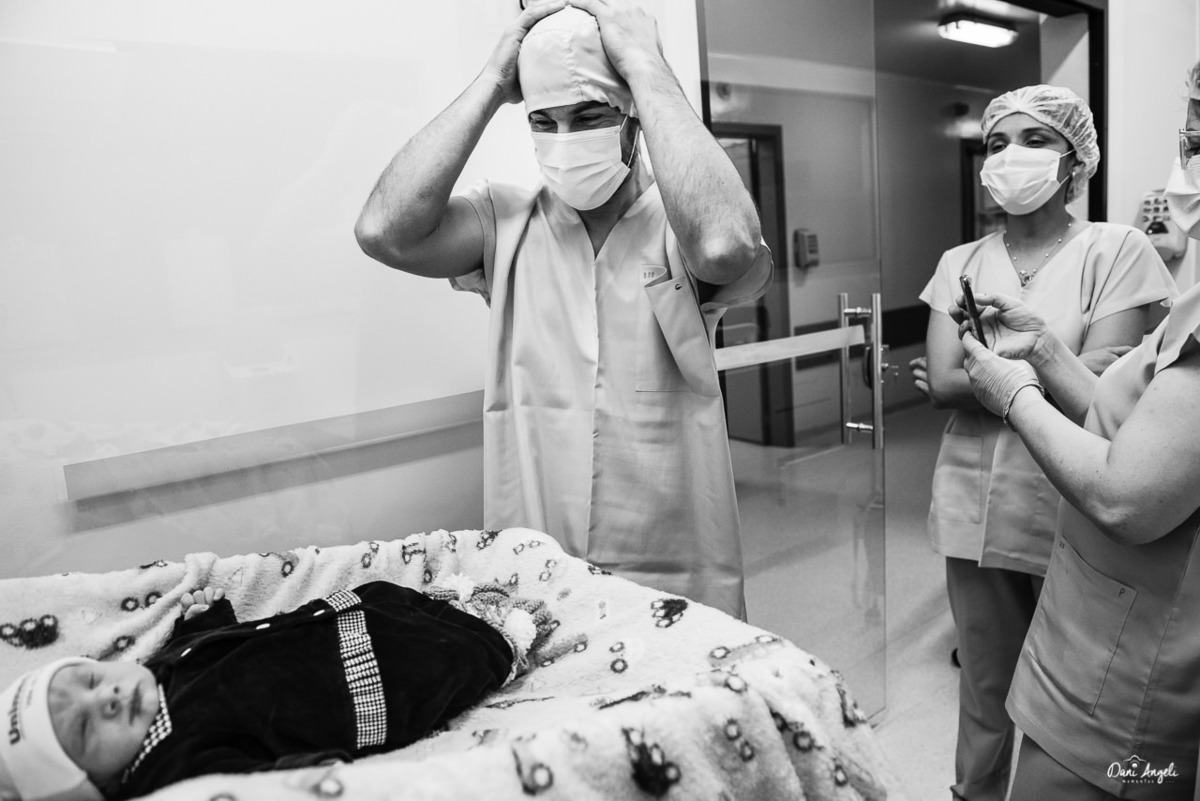 Primeiro momento pai e filho, só os dois. Momento de cheirar, de olhar, de apreciar. Momento de ter aquela conversa. Momento de levar para a mamãe, agora prontinha, se recuperando.