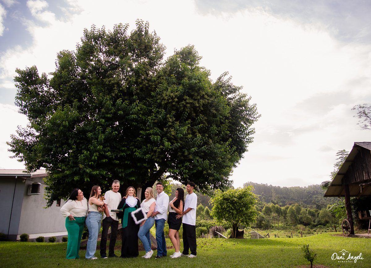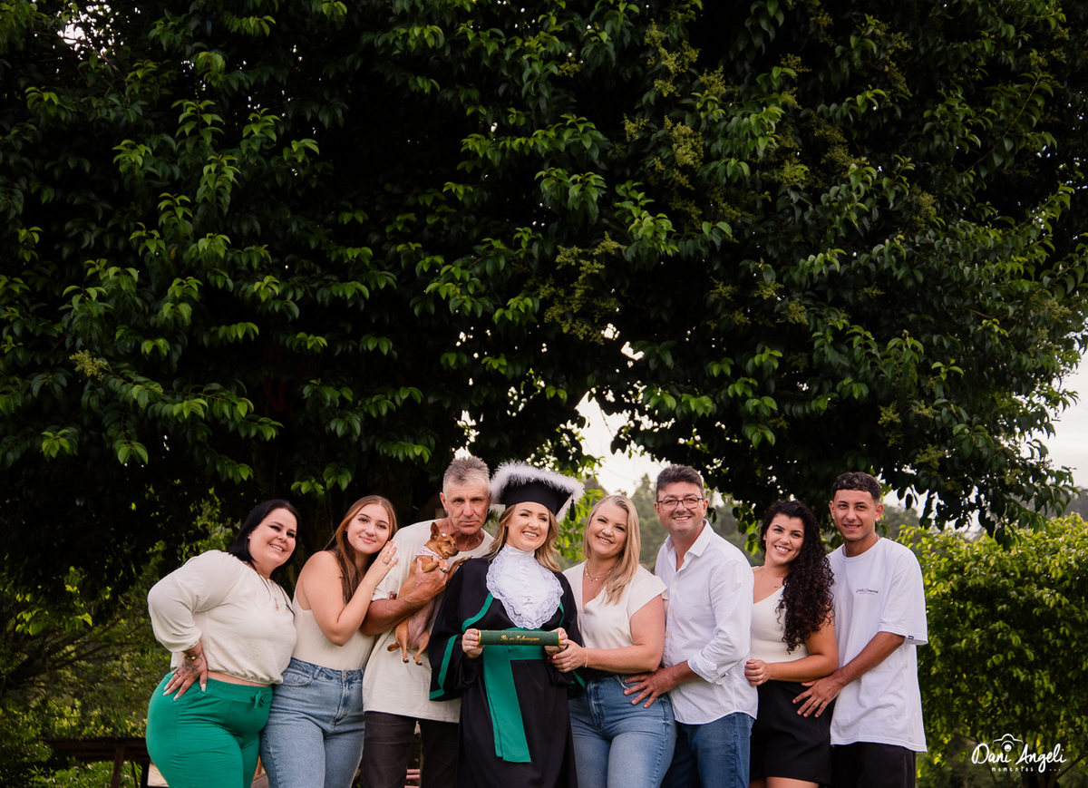 Parte desse ensaio foi dedicado à toga, um símbolo tangível de todo o esforço e empenho investidos ao longo da jornada acadêmica. A família, cúmplice nessa conquista, tornou cada foto um testemunho visual do apoio e amor que envolvem essa trajetória.