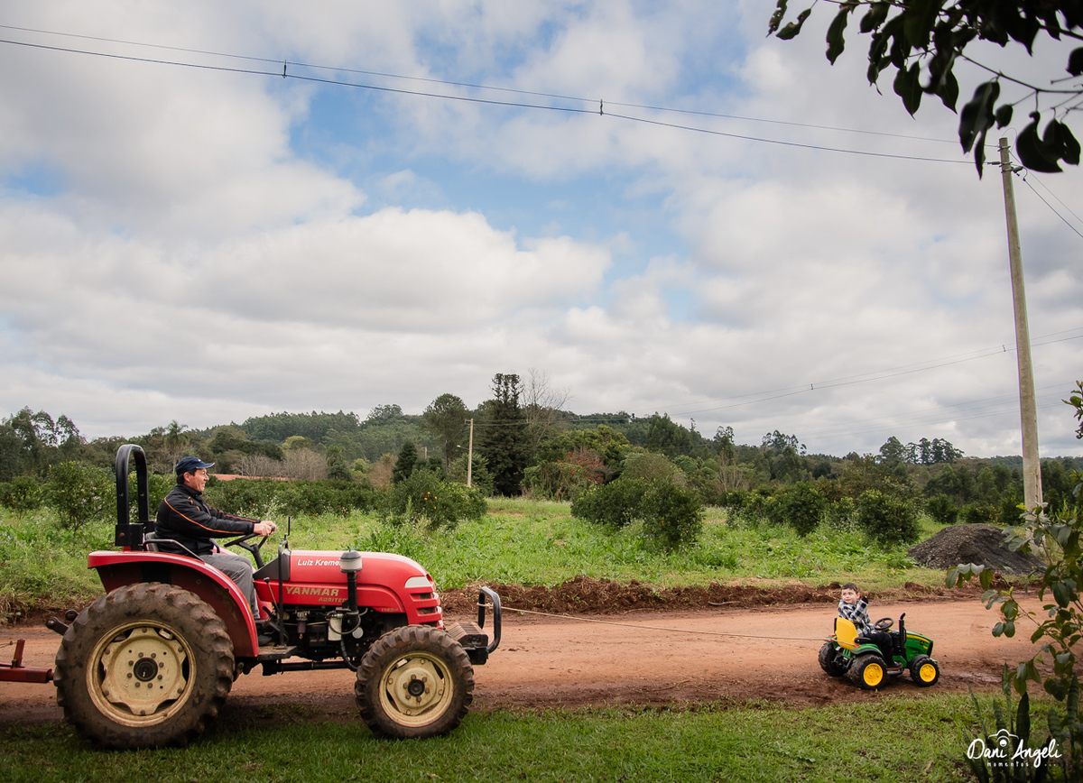 Nada como eternizar momentos onde o coração da família está: em casa, rodeados pela natureza e com muito amor envolvido! A Same realizou seu desejo de ter um ensaio de família em sua propriedade, no meio do arvoredo, onde tudo tem um toque especial. 🌿✨ Com o sogro e o marido ao volante de seus tratores, o pequeno Muriel também não ficou de fora e trouxe seu próprio tratorzinho, deixando o cenário ainda mais encantador e do jeitinho deles! 🚜🧡