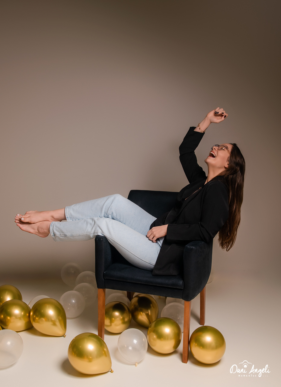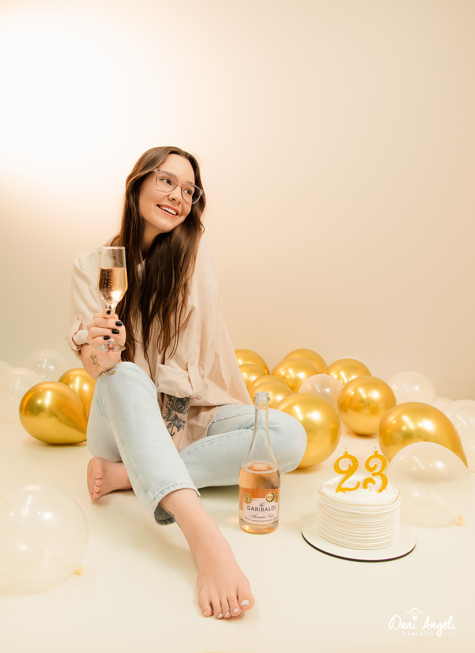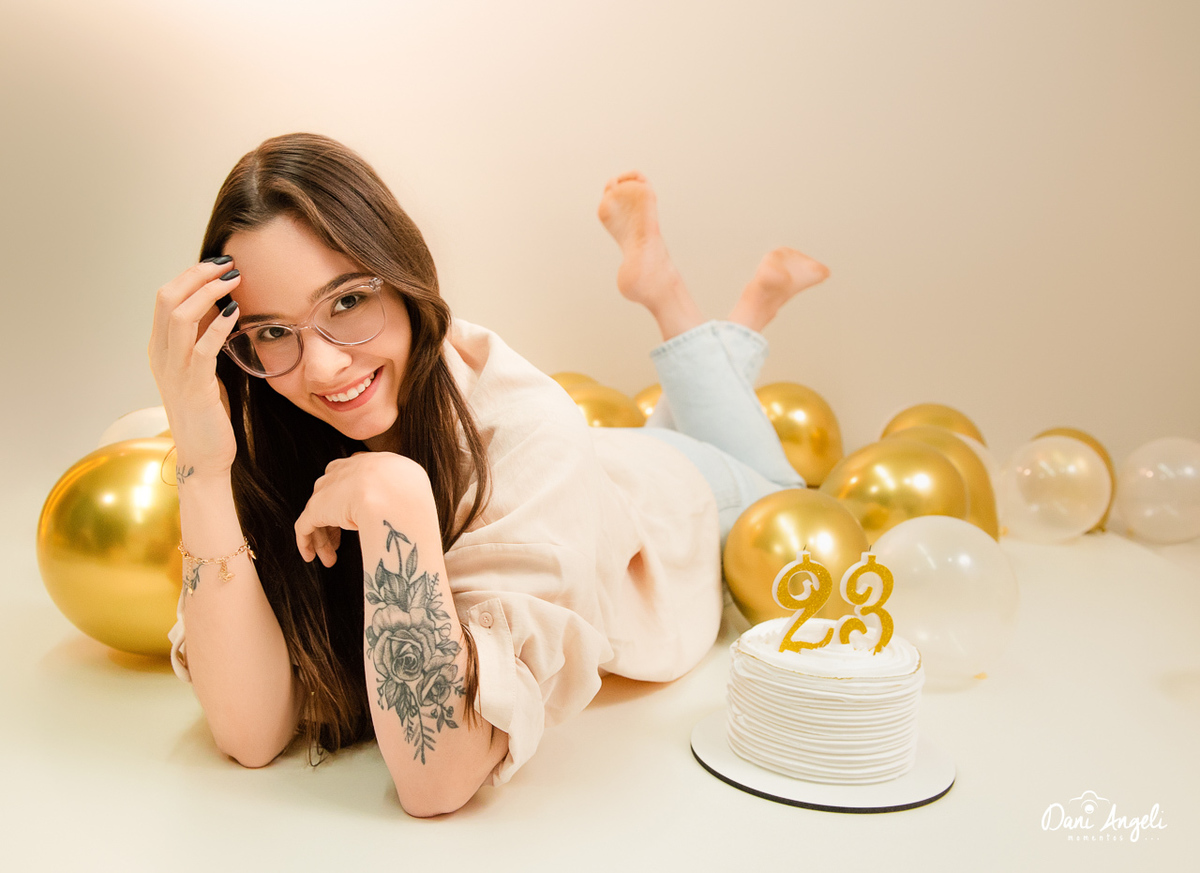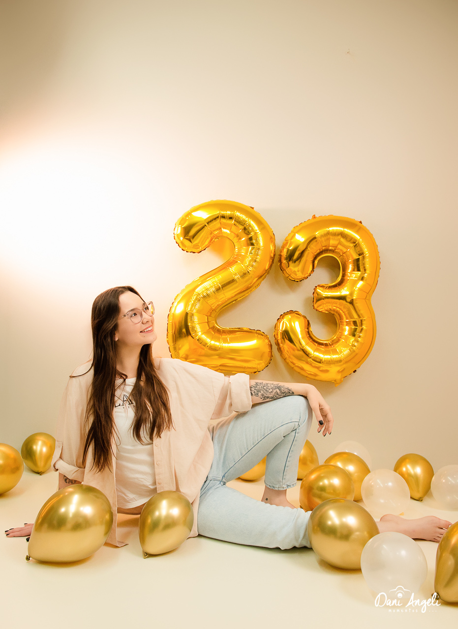 Para marcar essa fase da vida, a Bruna trouxe sua alegria e espontaneidade, e nós cuidamos de cada detalhe: balões no chão, o balão numérico que não pode faltar e todo o clima especial que faz parte de um verdadeiro ensaio fotográfico de aniversário. Cada clique registrou a essência dela aos 23 anos, em fotos que ficarão guardadas para sempre.