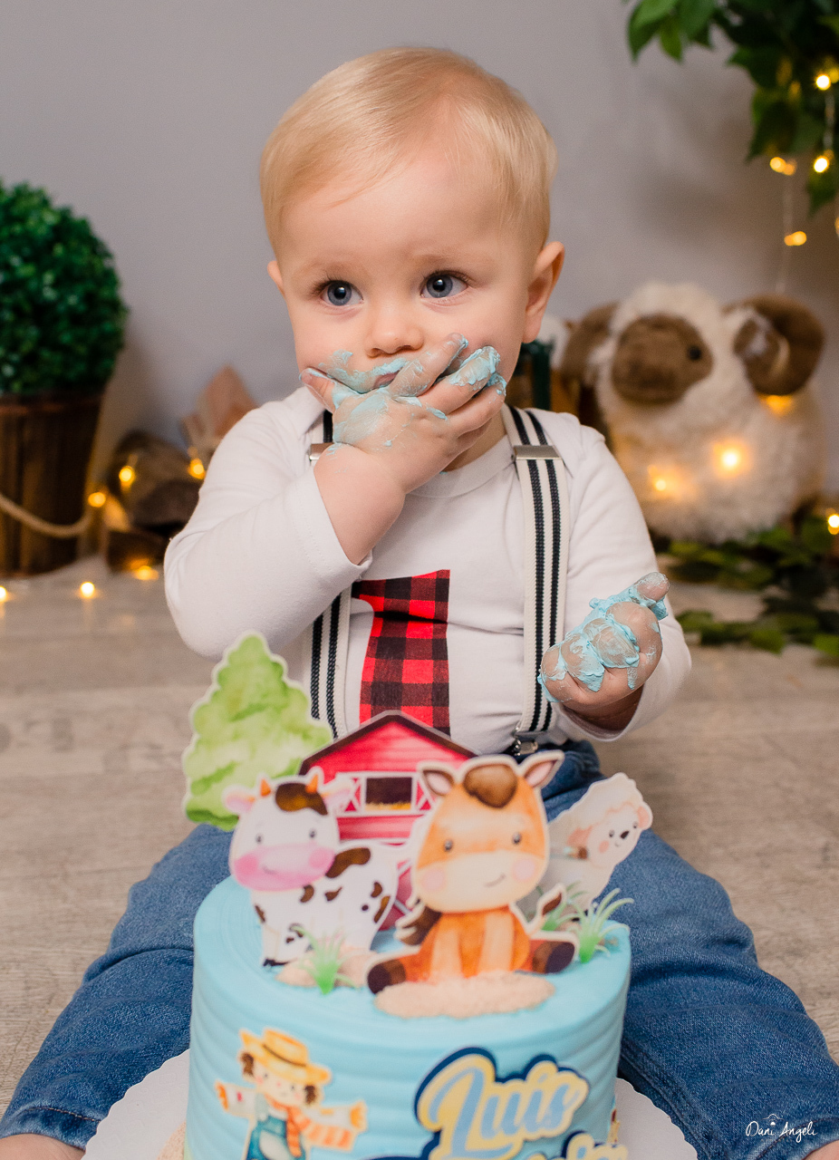 O Luis Fabrício sempre foi uma criança segura. Não foi surpresa que ele tenha devorado o bolo e aproveitado muito o banho. Muitos sorrisos e olhar curioso.