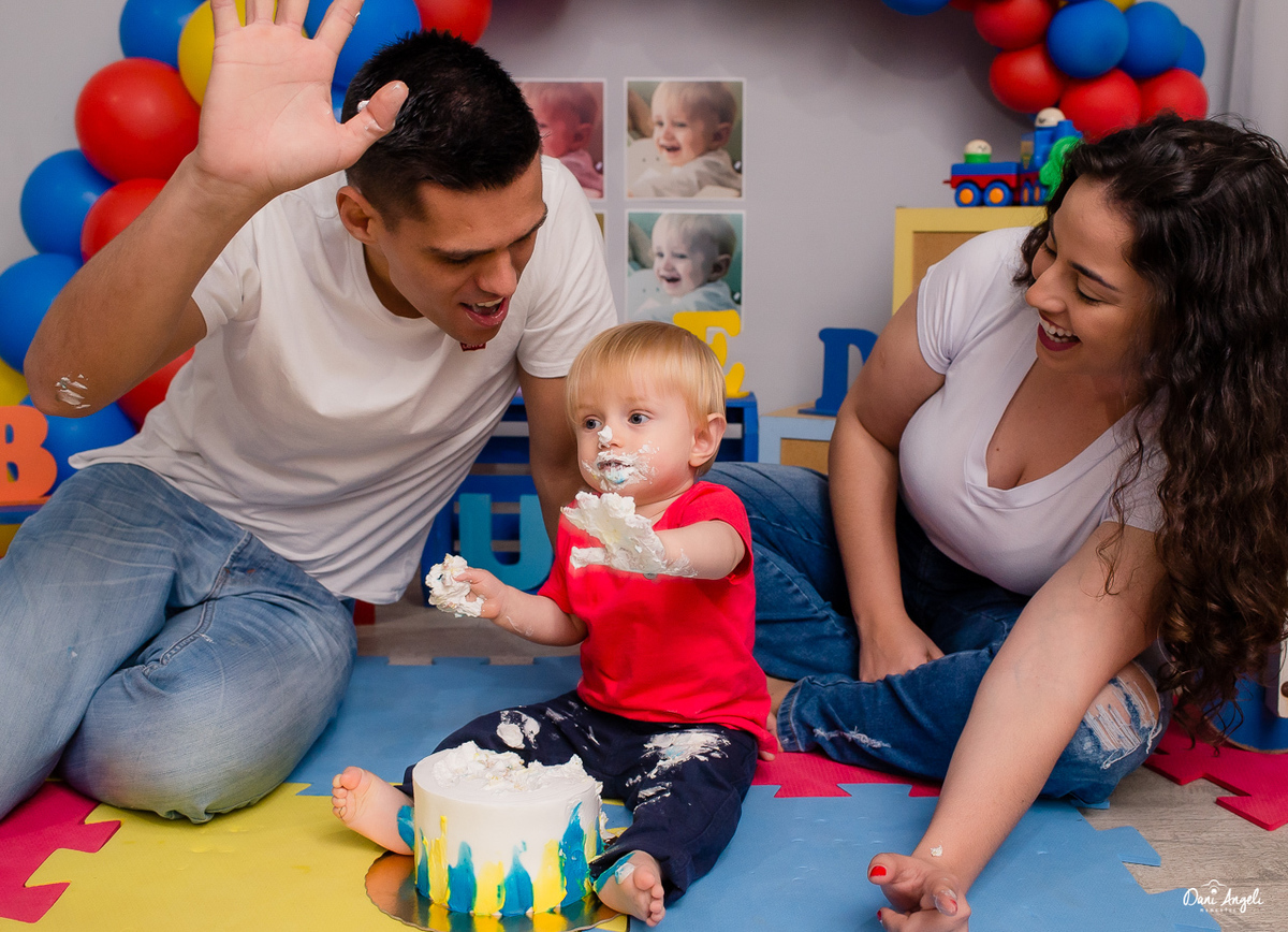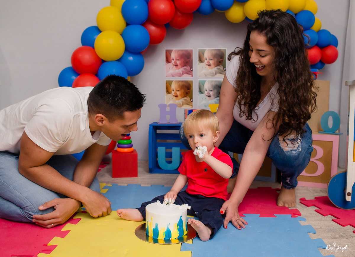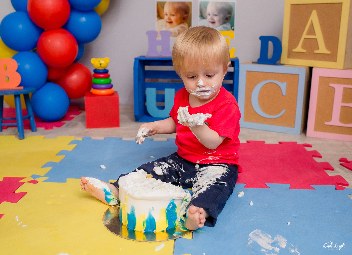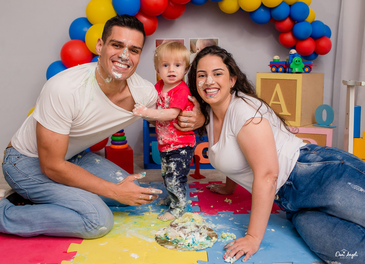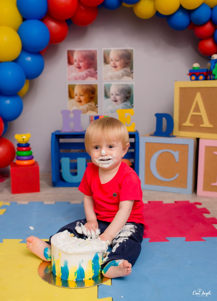 Com um tema super colorido, o Benício fez bagunça com a família em seu smash the cake.