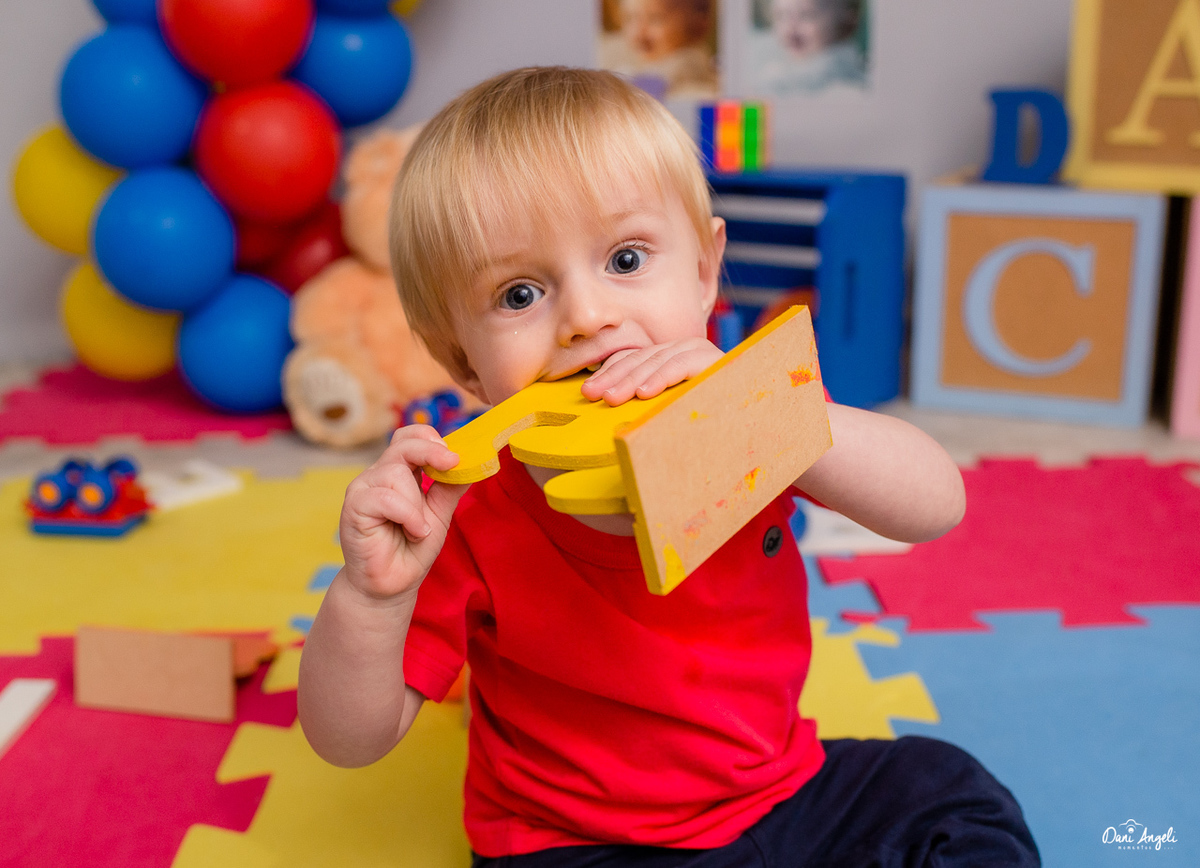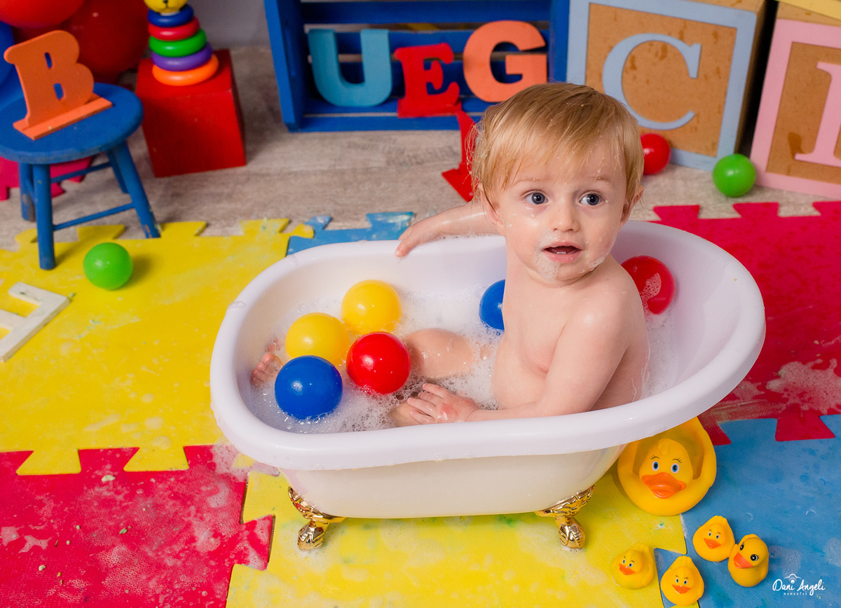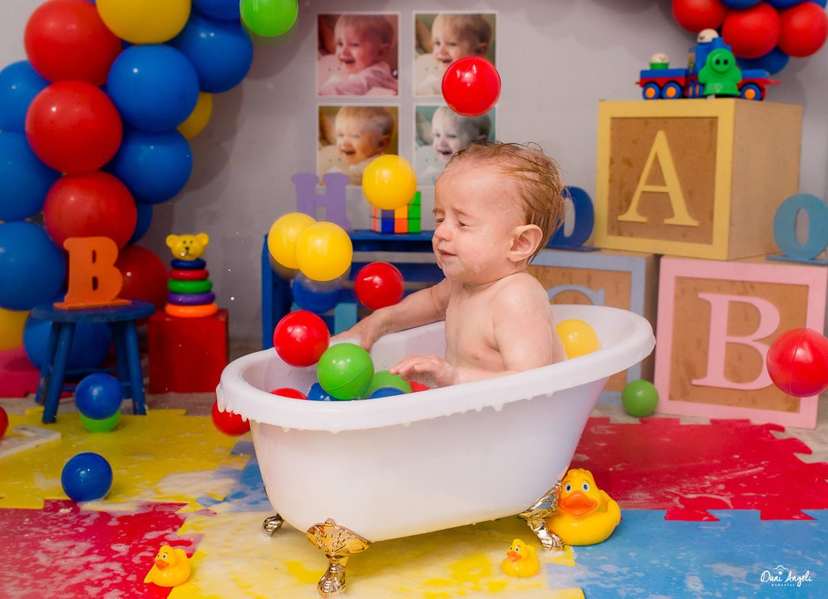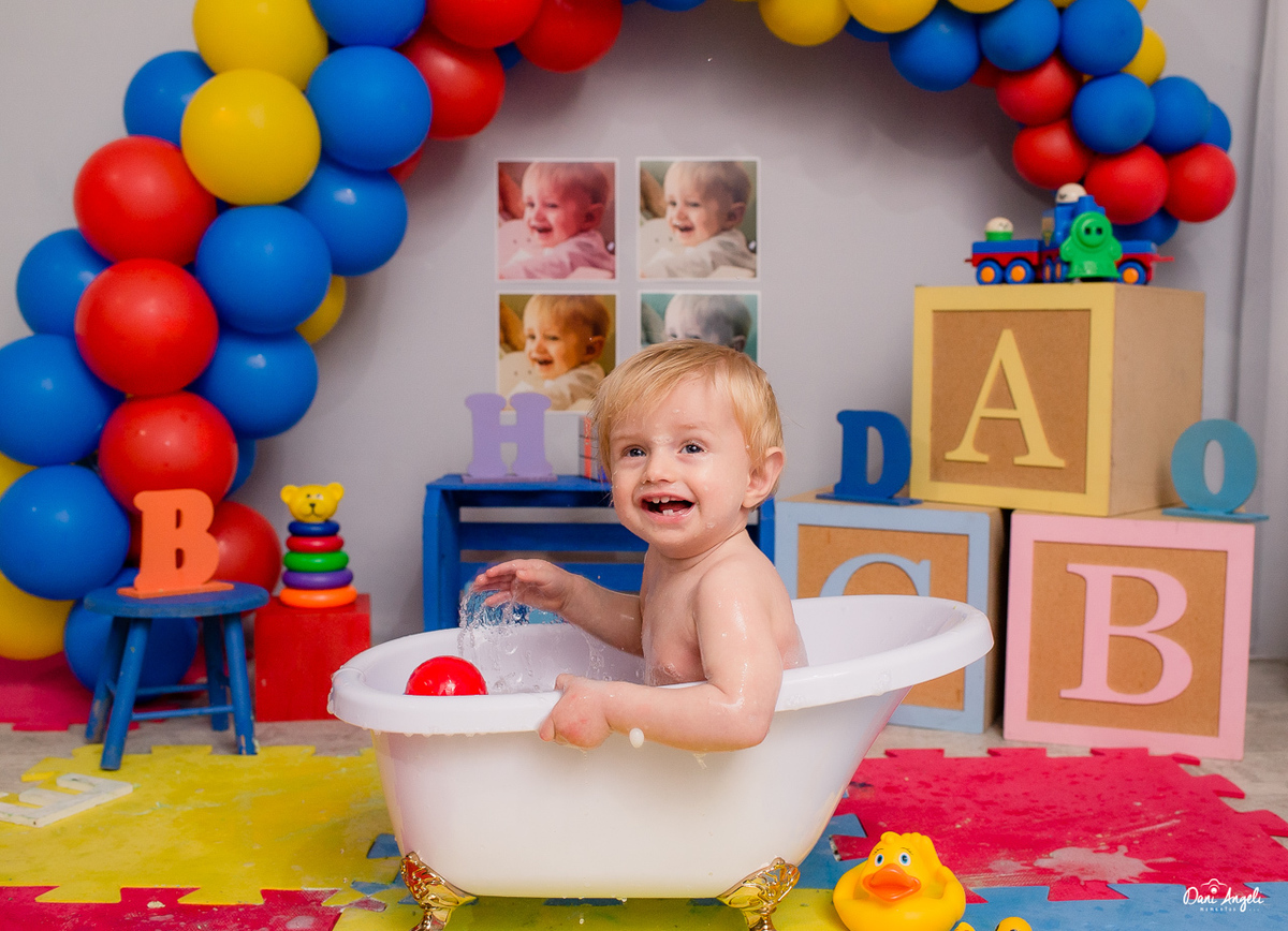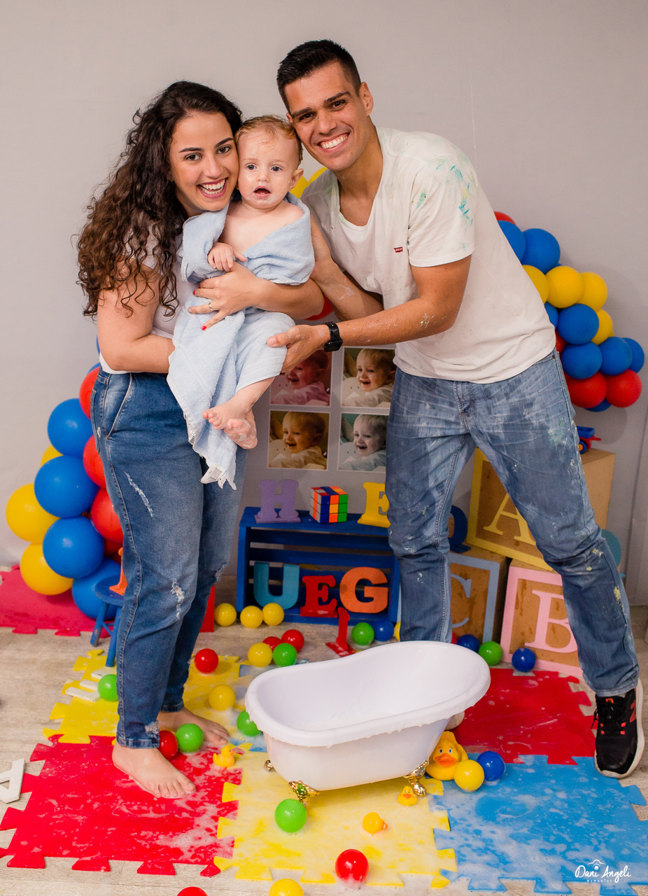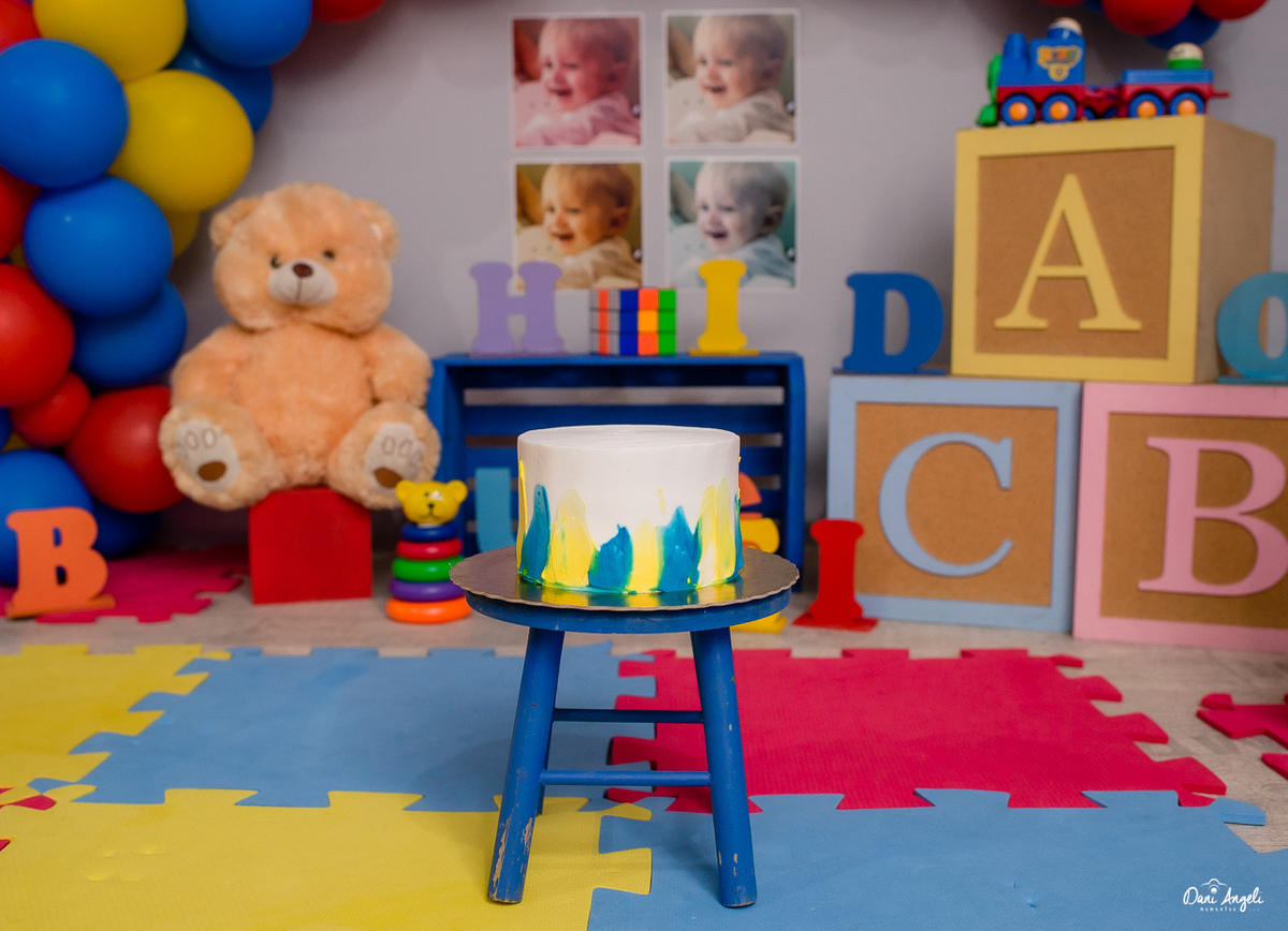 Com um tema super colorido, o Benício fez bagunça com a família em seu smash the cake.