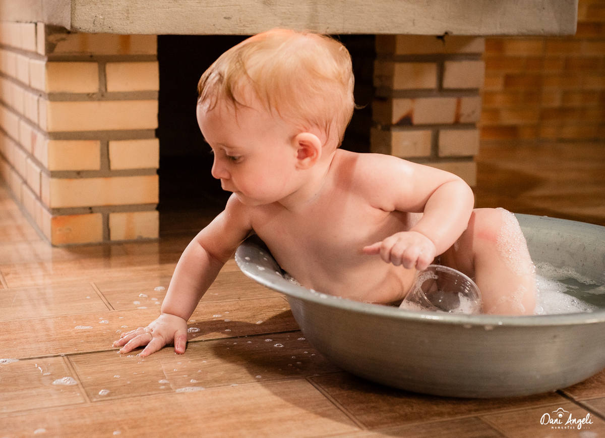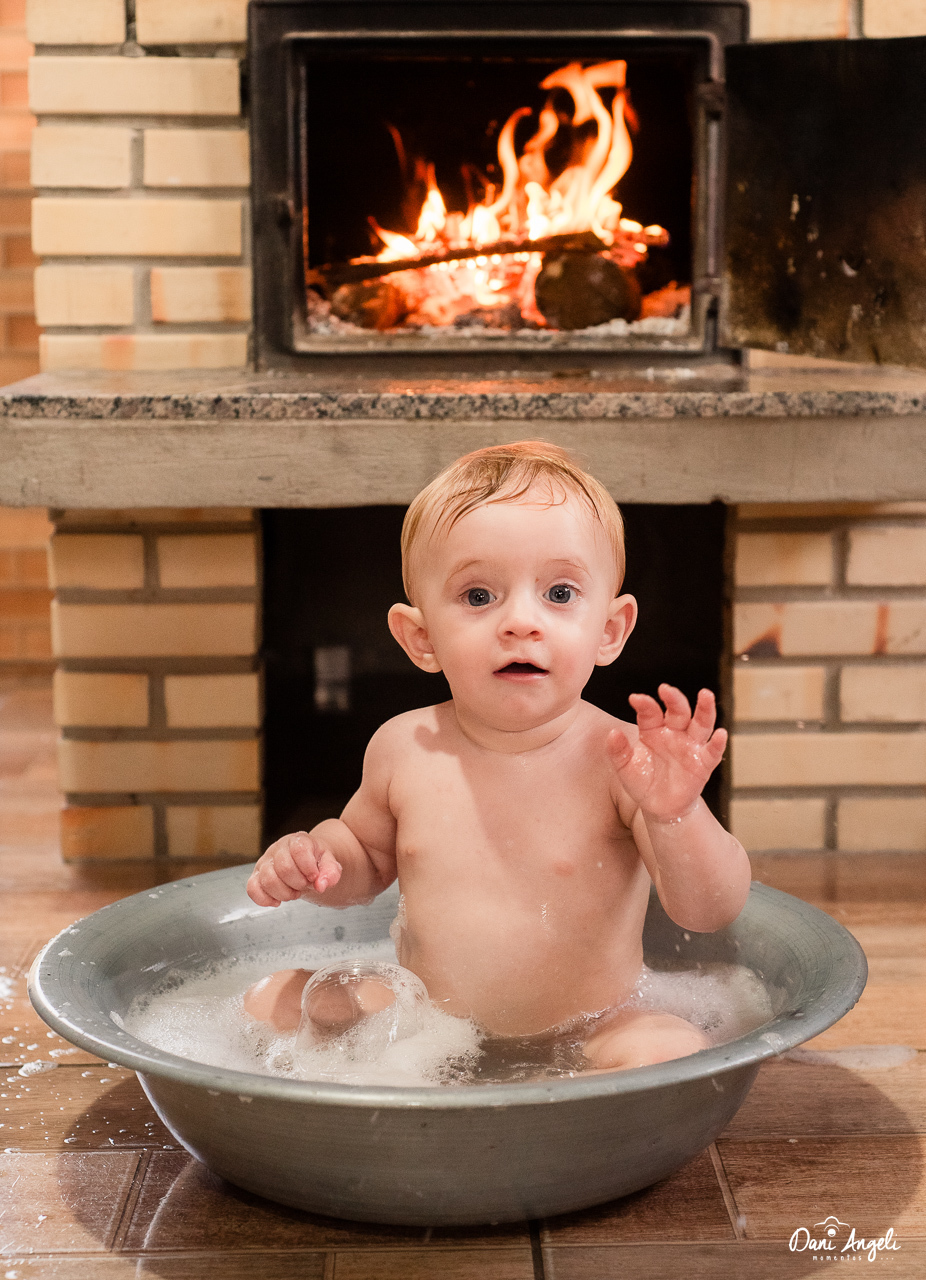 Para finalizar essa lambança, um bom banho foi preparado. É claro, tinha que ser no fogão a lenha, o ponto de encontro da família, onde conversam, tomam chimarrão e compartilham o dia a dia. Até acendermos um foguinho para esquentar o local e fazer umas fotos do Kauã em cima. Mas foi rápido, uma foto e já tiramos a banheira de cima.