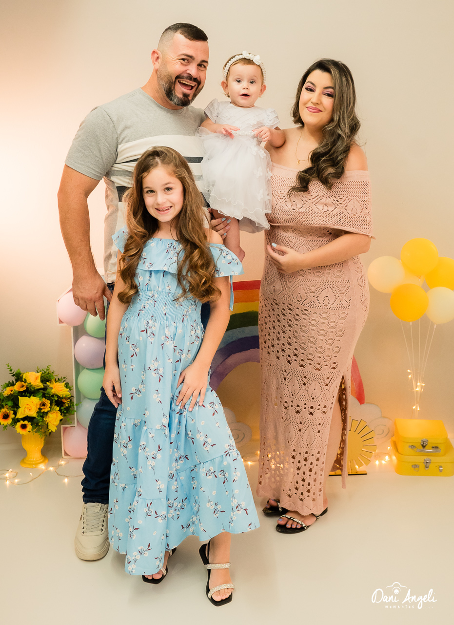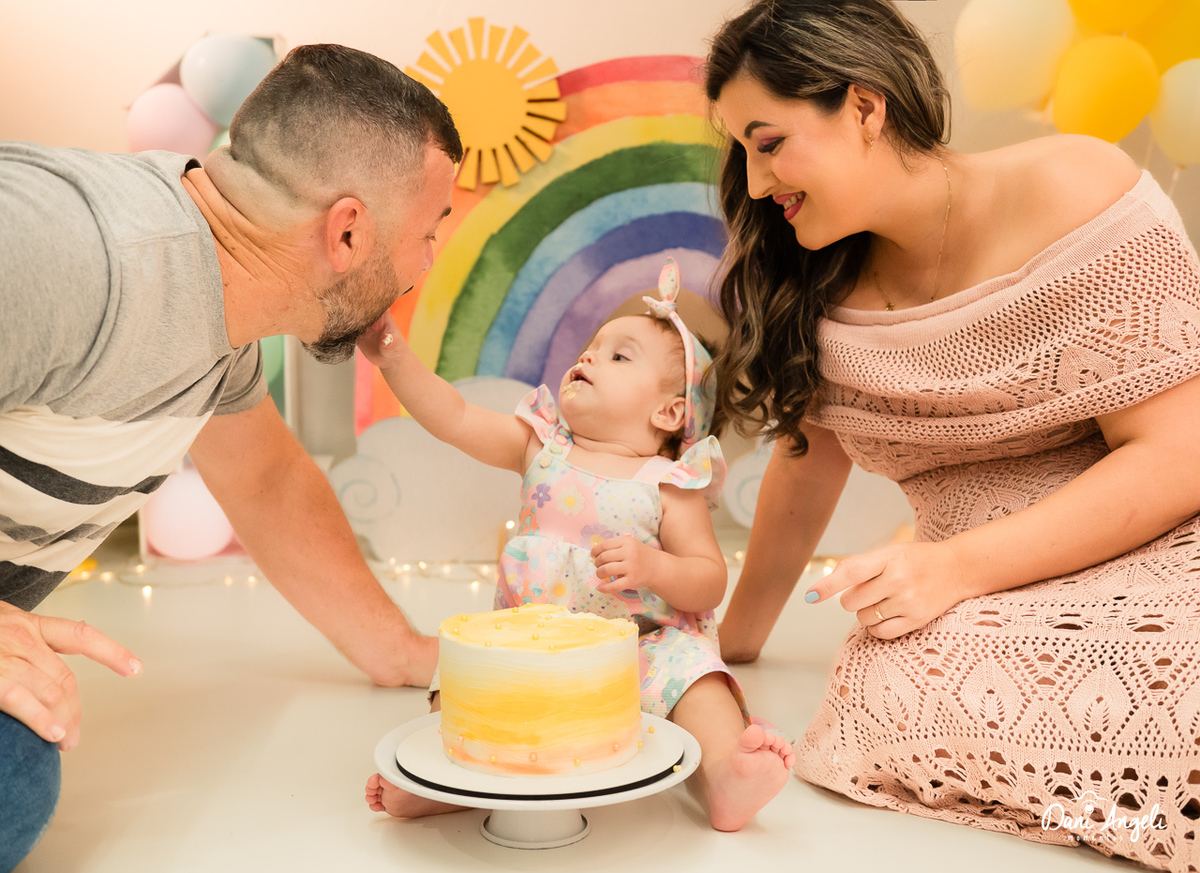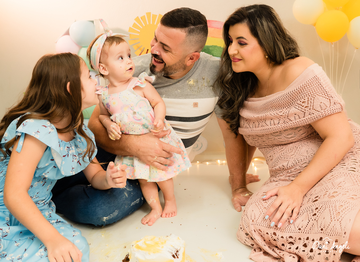 A euforia da mãe com o ensaio era contagiante, e o sorriso da Maitê parecia multiplicar a emoção no ambiente. O pai e a mana também entraram na folia, tornando tudo ainda mais leve e divertido. Tivemos caretas, gargalhadas, muitas brincadeiras e, claro, aquele momento clássico com o bolo — que a Maitê aproveitou com gosto! 😄🍰