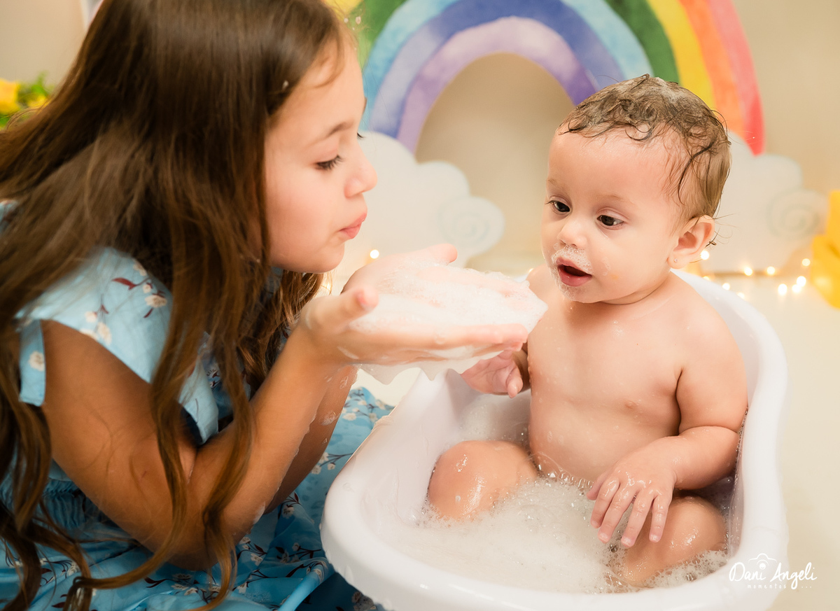 Fechamos com um banho cheio de espuma e sorrisos, onde ela simplesmente transbordou felicidade. Cada clique contou um pedacinho dessa história linda.
