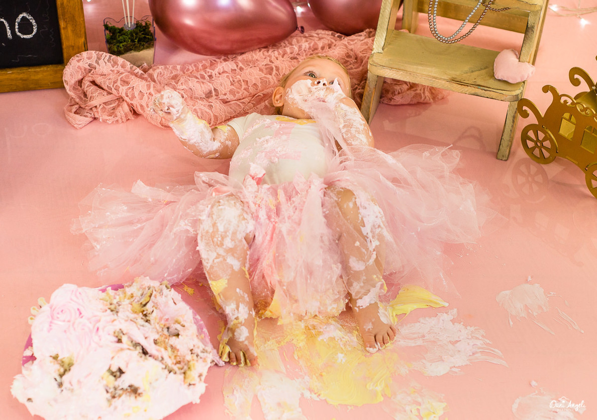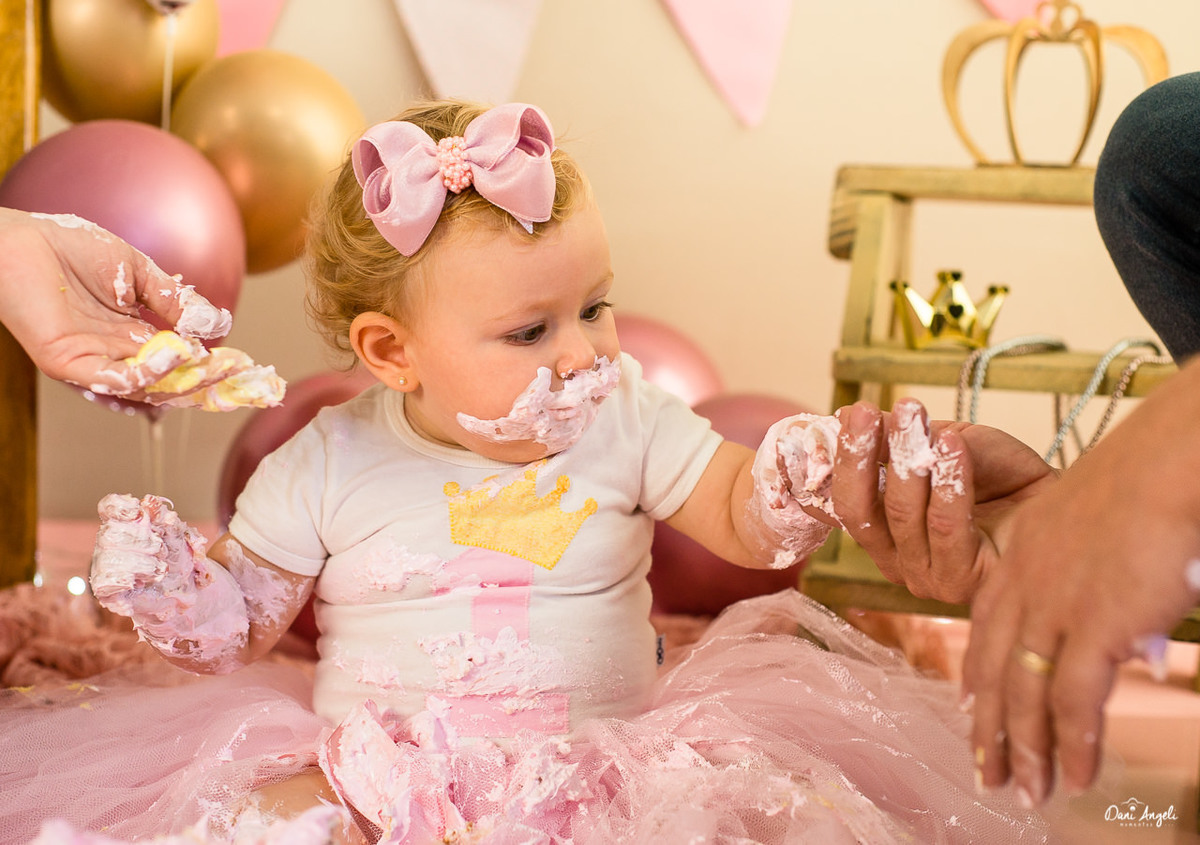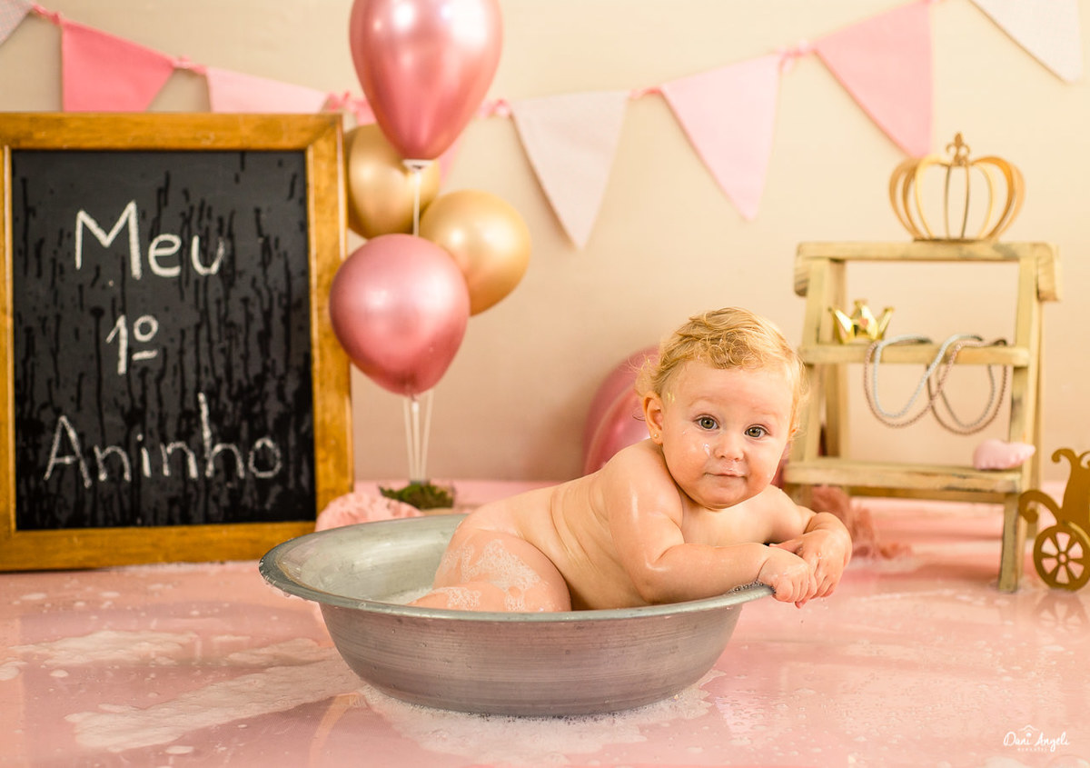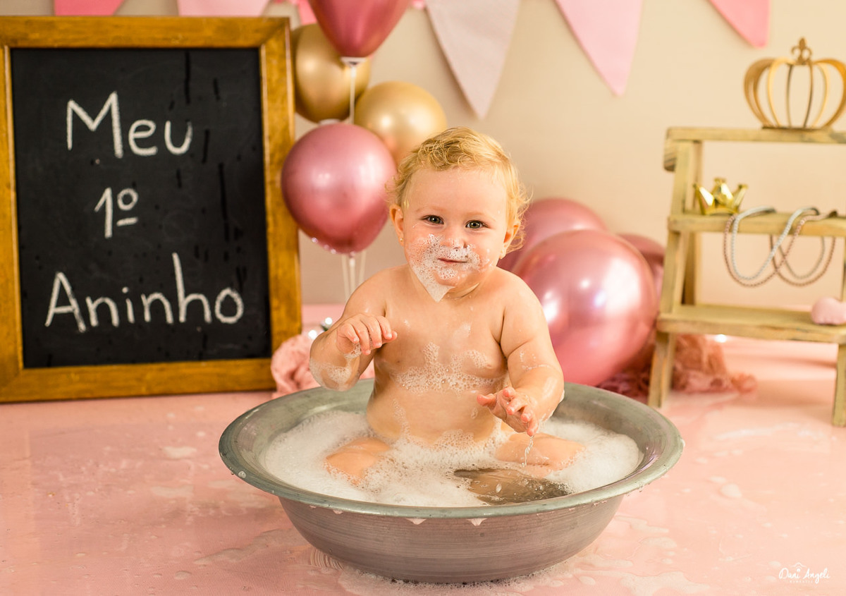Foi a única bebê de smash que entrou sozinha no seu banho. Ela se divertiu muito na bagunça com o bolo e se divertiu mais ainda no banho.