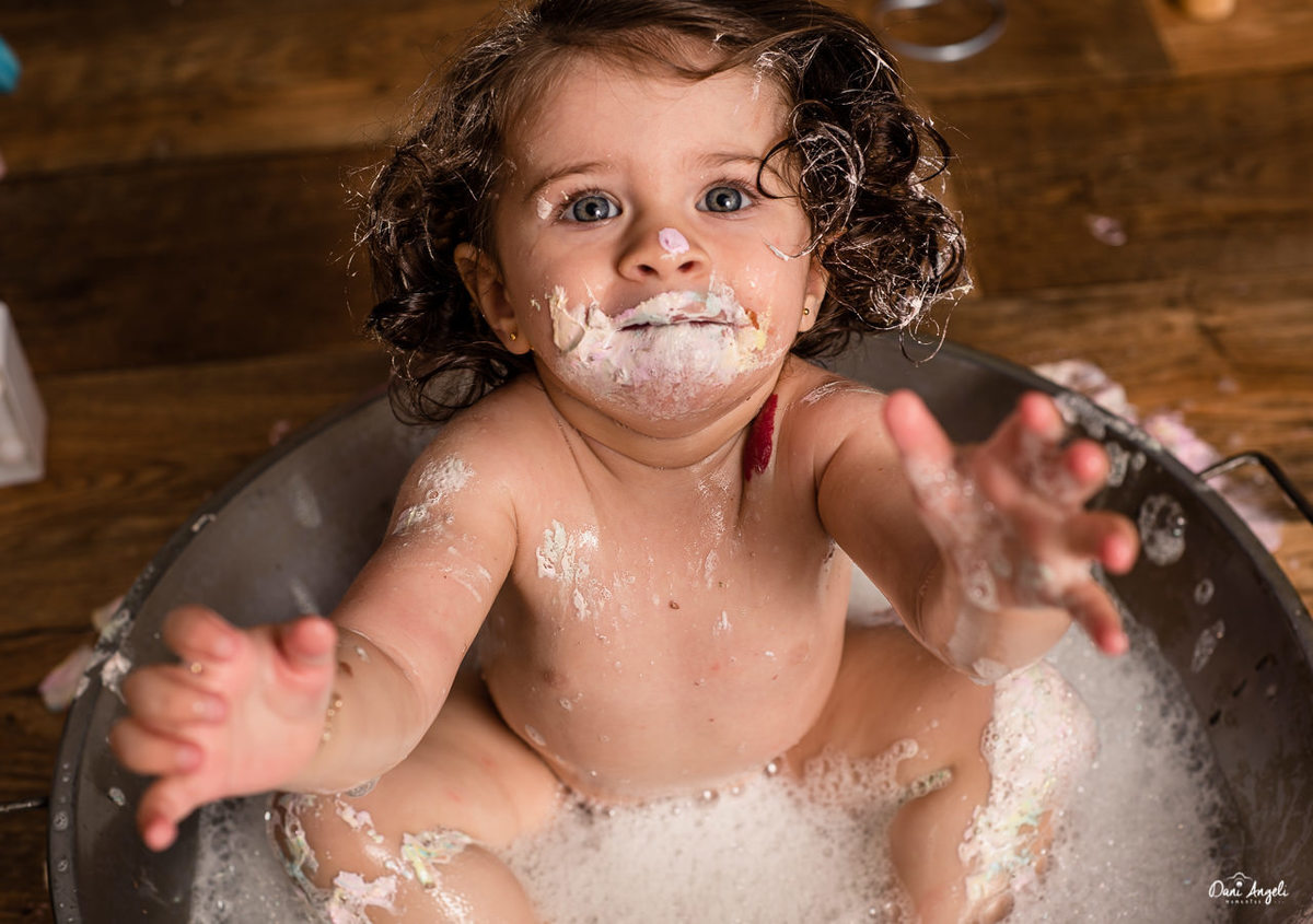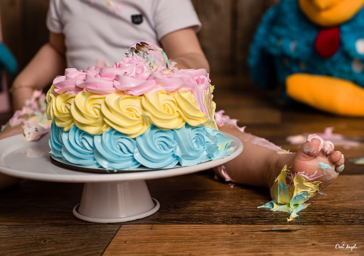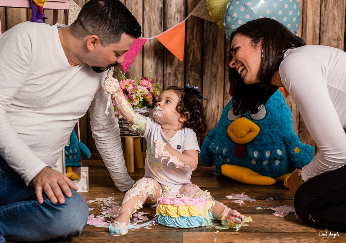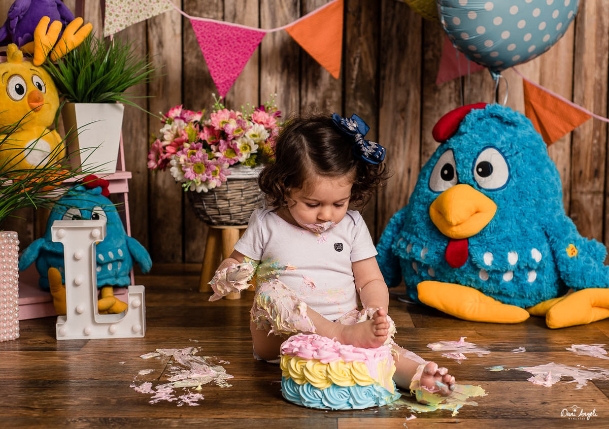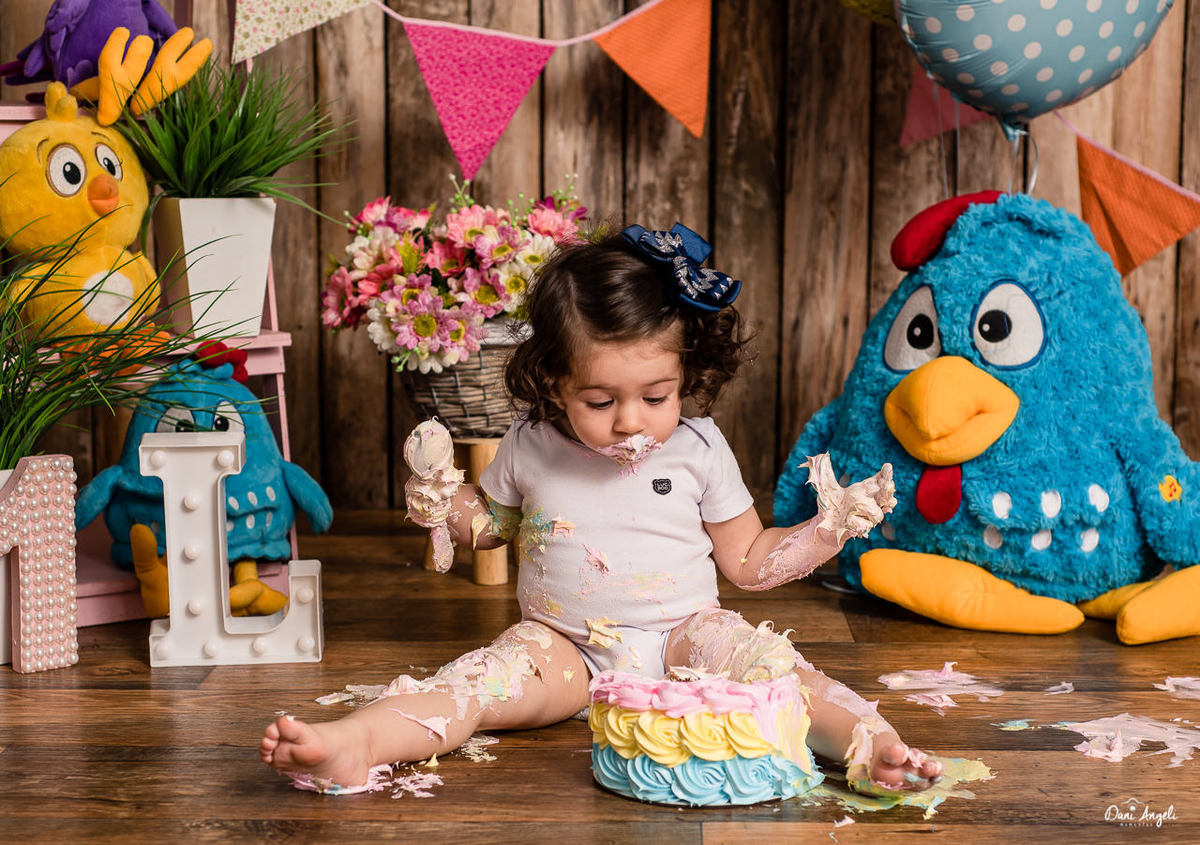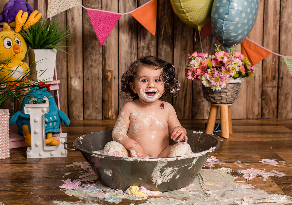 Ela não surpreendeu! A Louise é uma figurinha, desde sempre foi uma menina sorridente e muito curiosa. Sempre sendo incentivada pelos papais, então ela sempre estava a frente. Caminhando, conversando, buscando coisas acima da idade. E no smash não foi novidade o que imaginávamos. Ela sorriu, olhou e redecorou o cenário, e claro, amou a brincadeira com o bolo.