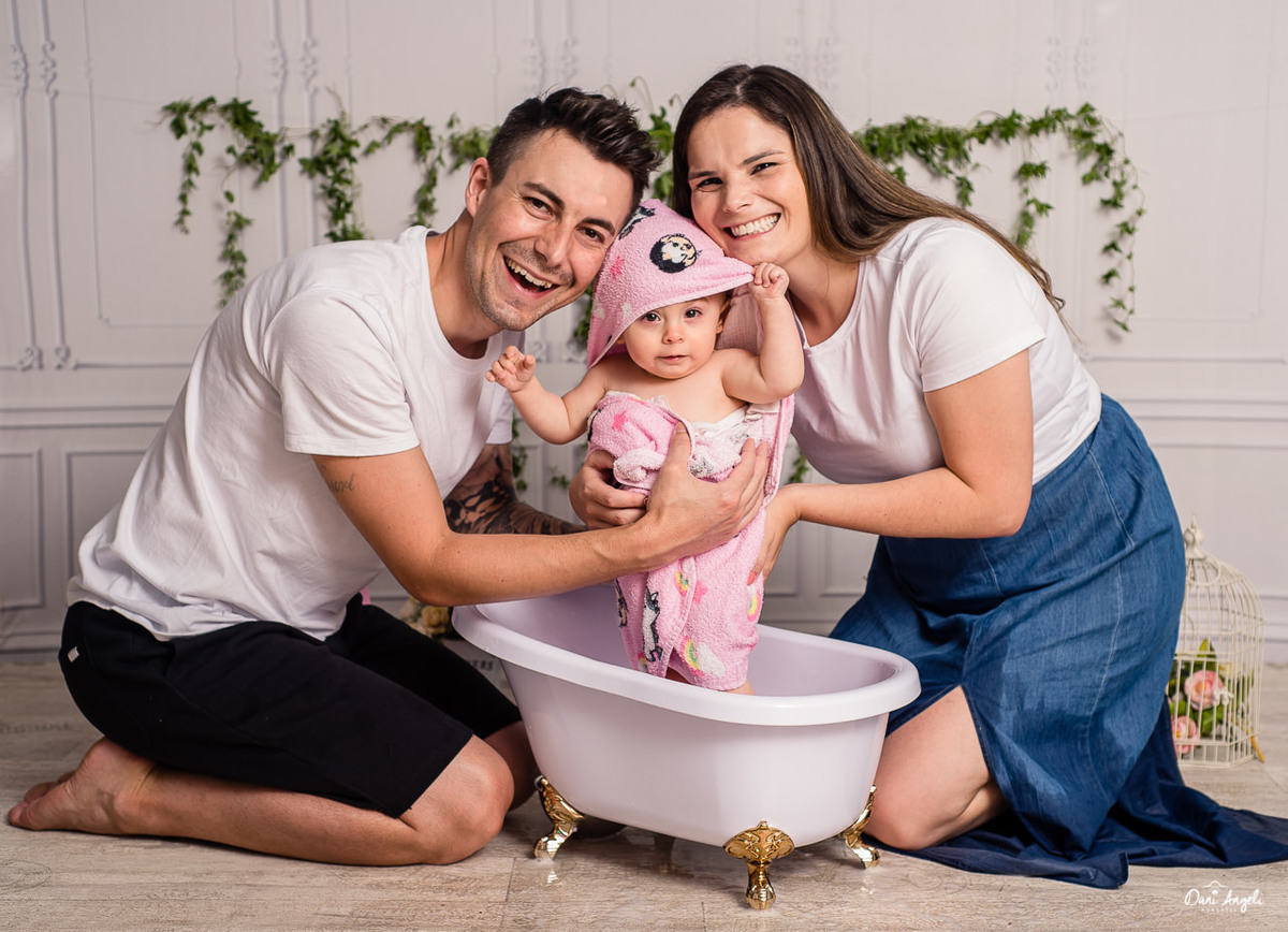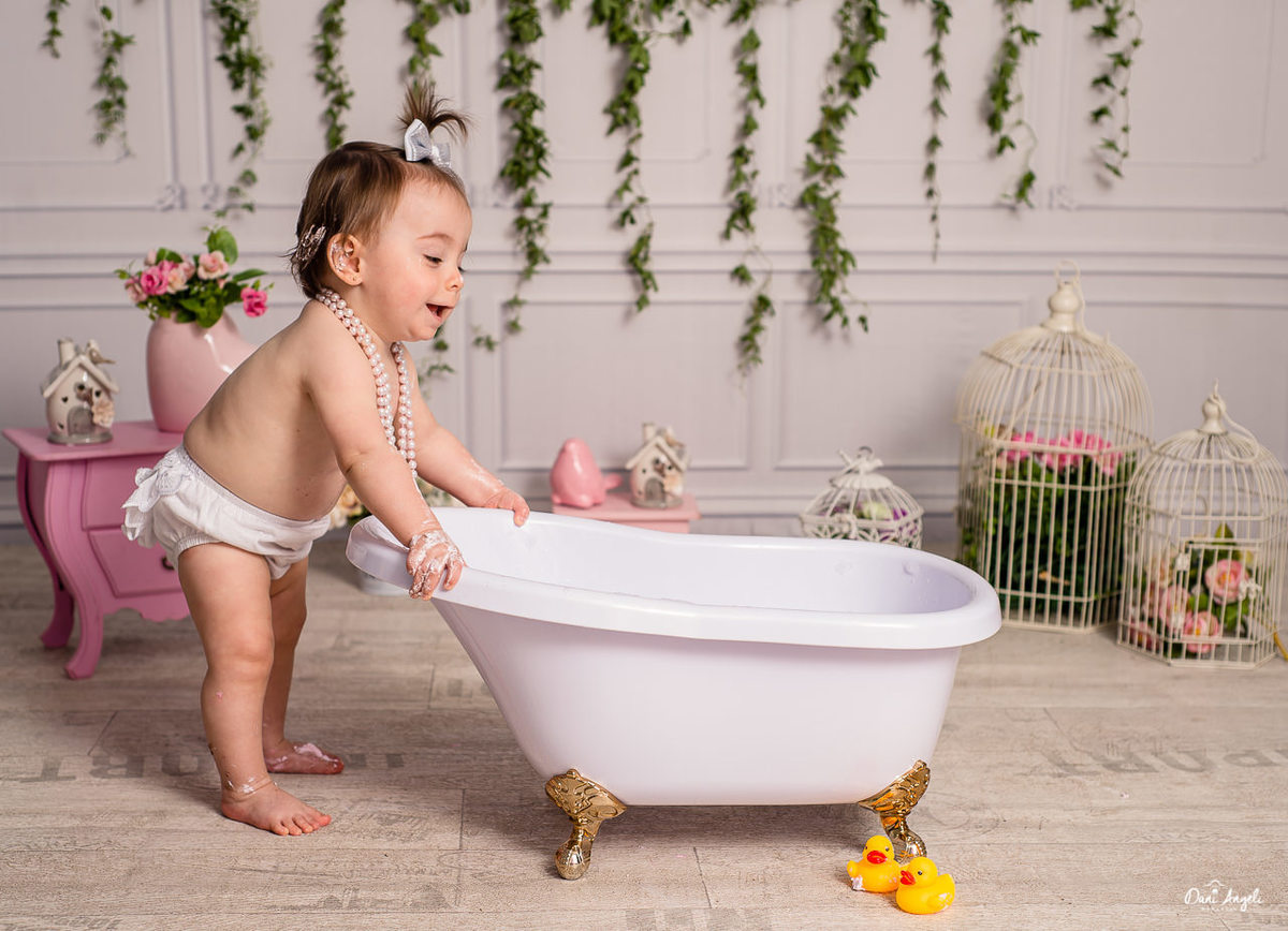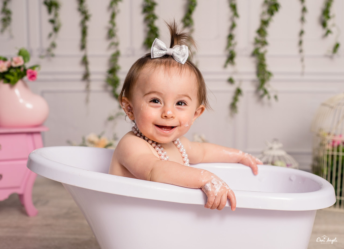 Tá cada vez mais esperta. Como ela ama uma folia, seu smash the cake foi como imaginávamos, não perdeu tempo de colocar a mão no bolo, de brincar com os personagens do cenário e de curtir muito mais que tudo o banho.