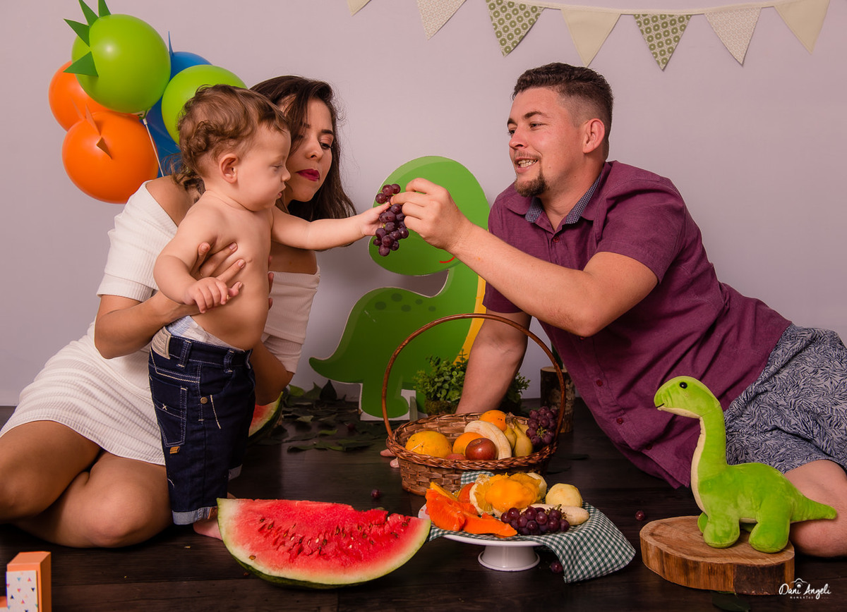 Com o Pedro, aproveitamos todas as frutinhas. Papai e mamãe trouxeram todas as frutas que ele ama, acrescentamos no cenário e deixamos ele olhar, pegar, cheirar e claro, comer todas as que ele queria.
