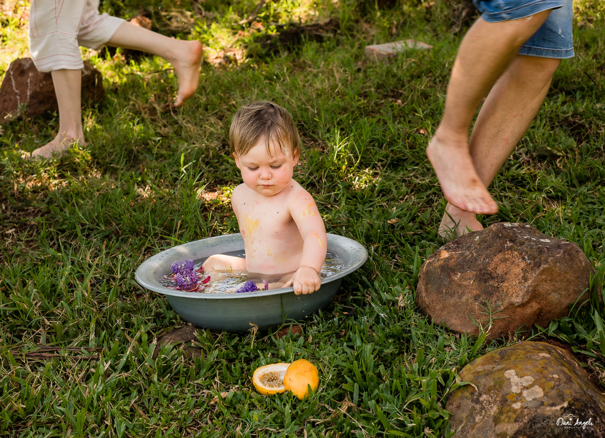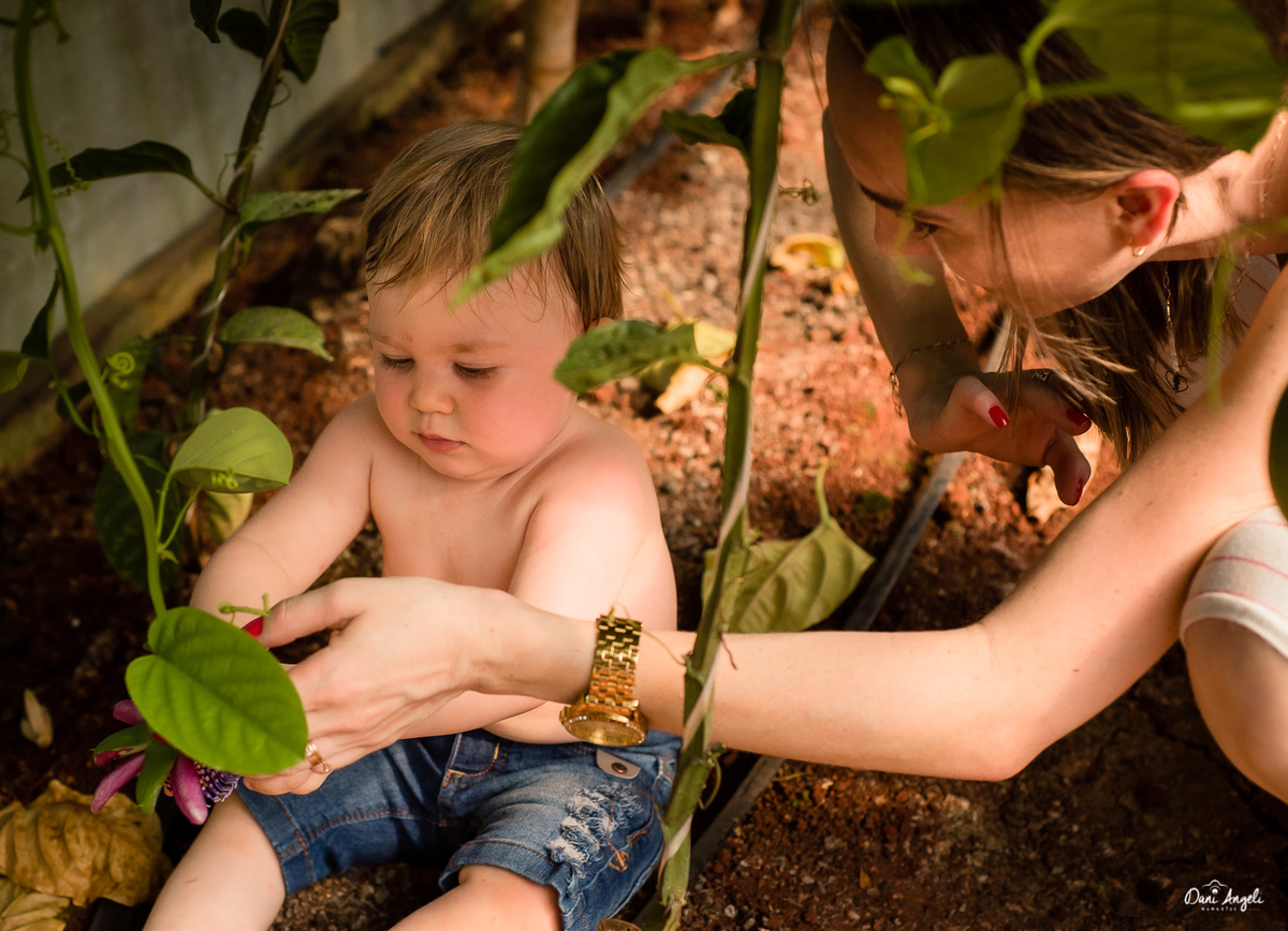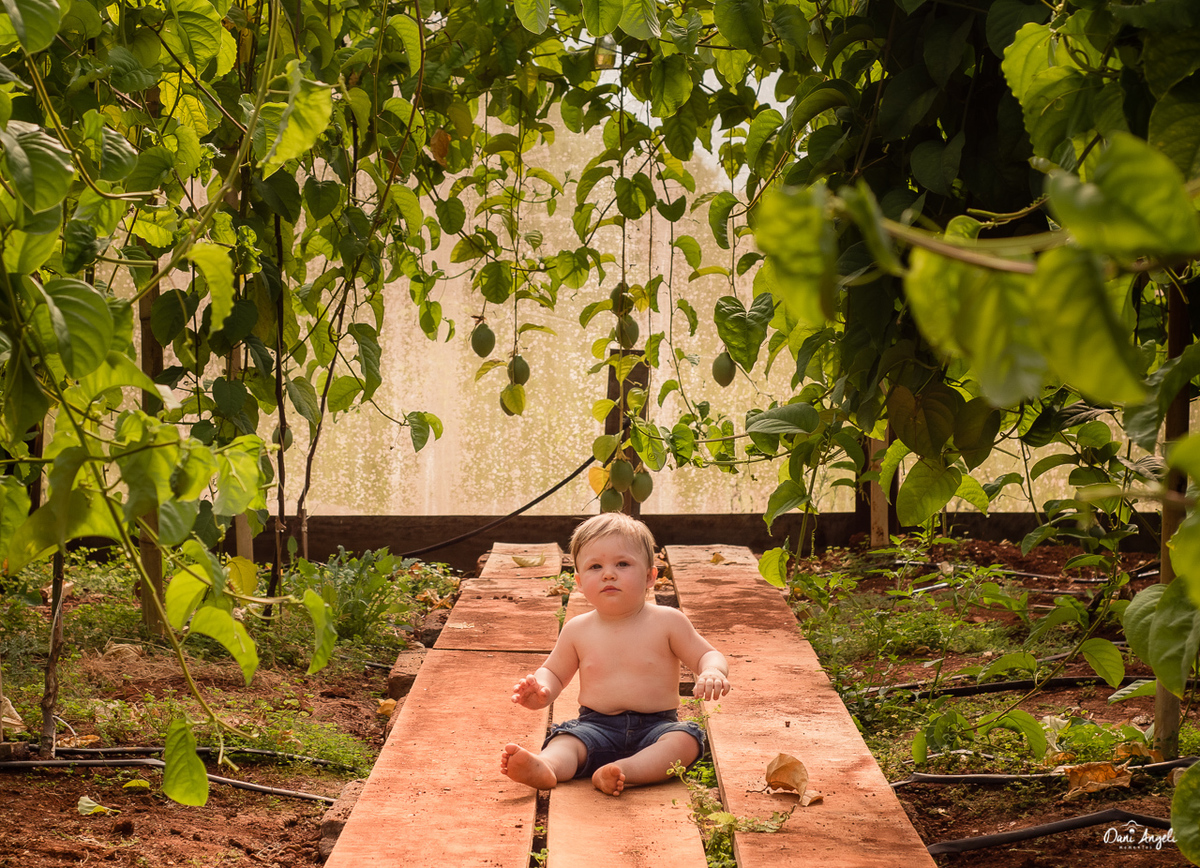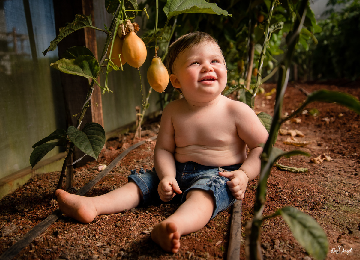 Mas ficou lindo. O Beni sempre se diverte, é um menino curioso e adora tocar nas coisas, nas frutas, na terra, na água, em tudo. Então sempre rendem fotos perfeitas dele.